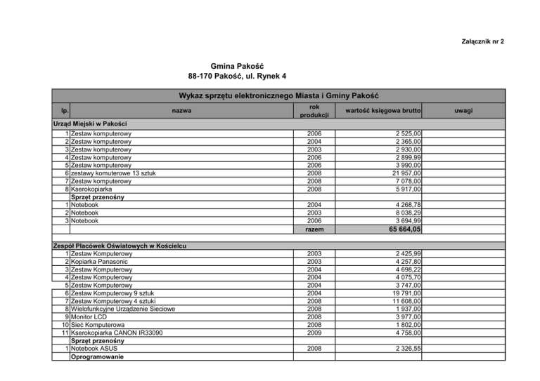 Załącznik nr 2 Gmina Pakość 88-170 Pakość, ul. Rynek 4 Wykaz sprzętu elektronicznego Miasta i Gminy Pakość lp. nazwa rok produkcji wartość księgowa brutto Urząd Miejski w Pakości 1 2 3 4 5 6 7 8 Zestaw komputerowy Zestaw komputerowy Zestaw komputerowy Zestaw komputerowy Zestaw komputerowy zestawy komuterowe 13 sztuk Zestaw komputerowy Kserokopiarka Sprzęt przenośny 1 Notebook 2 Notebook 3 Notebook Zespół Placówek Oświatowych w Kościelcu 1 Zestaw Komputerowy 2 Kopiarka Panasonic 3 Zestaw Komputerowy 4 Zestaw Komputerowy 5 Zestaw Komputerowy 6 Zestaw Komputerowy 9 sztuk 7 Zestaw Komputerowy 4 sztuki 8 Wielofunkcyjne Urządzenie Sieciowe 9 Monitor LCD 10 Sieć Komputerowa 11 Kserokopiarka CANON IR33090 Sprzęt przenośny 1 Notebook ASUS Oprogramowanie 2006 2004 2003 2006 2006 2008 2008 2008 2 525,00 2 365,00 2 930,00 2 899,99 3 990,00 21 957,00 7 078,00 5 917,00 2004 2003 2006 razem 4 268,78 8 038,29 3 694,99 65 664,05 2003 2003 2004 2004 2004 2004 2008 2008 2008 2008 2009 2 425,99 4 257,80 4 698,22 4 075,70 3 747,00 19 791,00 11 608,00 1 937,00 3 977,00 1 802,00 4 758,00 2008 2 326,55 uwagi 1 Ośrodek Pomocy Społecznej w Pakości 1 Kserokopiarka 2 Zestaw Komputerowy 3 Zestaw Komputerowy 4 Zestaw Komputerowy 5 Zestaw Komputerowy 6 Zestaw Komputerowy 7 Zestaw Komputerowy Ochotnicza Straż Pożarna 1. zestaw komputerowy 2. System Monitoringu Szkoła Podstawowa w Pakości 1 Zestaw Komputerowy 2 Zestaw Komputerowy 3 Zestaw Komputerowy 4 Zestaw Komputerowy 5 Zestaw Komputerowy 6 Zestawy Komputerowe 9 sztuk 7 zestaw komputerowy i wielofunkcyjny 8 zestawy komputerowe 3 sztuki 9 zestaw komputerowy Gimnazjum w Pakości 1 Zestaw Komputerowy 5 sztuk 2 Kopiarka 3 Kserokopiarka 4 Stanowisko komputerowe 4 sztuki 5 wielofunkcyjne urządzenie sieciowe 6 sieć komputerowa 7 Zestaw Komputerowy 4 sztuki 8 wielofunkcyjne urządzenie sieciowe 9 monitor LCD 4 sztuki 2008 razem 2003 2004 2004 2005 2006 2008 2008 razem 1 925,00 oprogramowanie sieciowe 67 329,26 4 941,00 3 430,00 3 460,00 1 762,00 2 890,00 3 220,00 3 200,00 22 903,00 2006 1 788,00 53 166,00 razem 54 954,00 2005 2005 2007 2007 2007 2007 2006 2006 2009 razem 2 949,01 2 370,01 3 708,64 5 266,64 6 179,30 23 243,76 4 028,58 7 536,00 1 646,77 56 928,71 2003 2004 2003 2005 2005 2005 2007 2007 2007 8 315,00 5 349,70 3 647,80 9 440,00 1 985,00 1 072,46 11 608,00 1 937,00 3 977,00 10 sieć komputerowa 11 pracownia komputerowa Microsoft Oprogramowanie sieciowe 1 2 2007 2008 1 802,00 40 610,92 2005 2007 razem 1 460,34 1 925,00 93 130,22