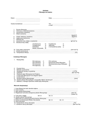 Ankieta Filtracja na mokro Klient: ................................................................ ............................................................... ............................................................... Data: ..................................................... Osoba kontaktowa: ............................................ Tel.: ....................................................... e-mail: ................................................... 1. 2. 3. 4. Proces filtracyjny ................................................................................................................................ Filtrowany materiał/zawiesina............................................................................................................. Oznaczenie zawiesiny ......... ............................................................................................................. Skład zawiesiny ................................................................................................................................. 3 .................................................................................................................................................[kg/dm ] 5. Ciężar właściwy zawiesiny ..................................................................................................... [kg/dm3] 6. Ingerencja chemiczna ........................................................................................................................ 7. Wartość pH ........................................................................................................................................ 8. Zawartość fazy stałej w zawiesinie ...................................................................................... [g/l lub %] 9. Struktura fazy stałej amorfoniczna krystaliczna rozwłókniona włóknista koloidalna o konsystencji pasty kleista, śluzowata 10. Faza stała uziarnienie ...........................................................................................................[mm lub %] 11. Środki pomocnicze ................................................................................................................................. 12. Temperatura filtracji .........................................................................................................................[ºC] Instalacja filtracyjna 1. Rodzaj filtra Filtr taśmowy Filtr obrotowy Filtr tarczowy Filtr bębnowy 2. 3. 4. 5. 6. 7. 8. 9. 10. 11. Filtr workowy Komorowa prasa filtracyjna Membranowa prasa filtracyjna inny Produkt firmy ......................................................................................................................................... Metoda czyszczenia ............................................................................................................................. Wydajność pompy na godzinę ..................................................................................................[ m3/h] Ciśnienie .................................................................................................................................[bar lub Pa] Wielkość płyty filtracyjnej lub Ø bębna ...................................................................................................... Liczba płyt filtracyjnych lub długość bębna .................................................................................................. Liczba komór .............................................................................................................................................. Grubość placka filtracyjnego .........................................................................................................[mm] Ubytek placka filtracyjnego w przypadku filtrów obrotowych .................................................................. Materiał, z którego wykonano wkład płyty filtracyjnej ............................................................................. Warunki eksploatacji 1. Czas filtracji lub ilość obrotów bębna ........................................................................................................ 2. Czas trwania ............................................................................................................................................. 3. Stan placka filtracyjnego .......................................................................................................................... 4. Wilgotność końcowa (związana) placka filtracyjnego ...............................................................[min.%] ...............................................................[maks.%] 5. Tryb pracy ciągłej tak nie 6. Ubytek placka filtracyjnego ..................................................................................................................... 7. Skłonność do zanieczyszczenia tkaniny filtracyjnej ................................................................................. 8. Dalsze przetwarzanie filtratu i/lub placka tak nie 9. Ciecz płucząca ........................................................................................................................................ 10. Temperatura cieczy płuczącej .....................................................................................................[ºC] 11. Ciśnienie cieczy płuczącej ..........................................................................................................[bar lub Pa] Medium filtracyjne 1. Dotychczas stosowana jakość ................................................................................(także oznaczenia obce) 2. Rodzaj włókna ............................................................................................................................................... 3. Ciężar powierzchniowy ................................................................................................................