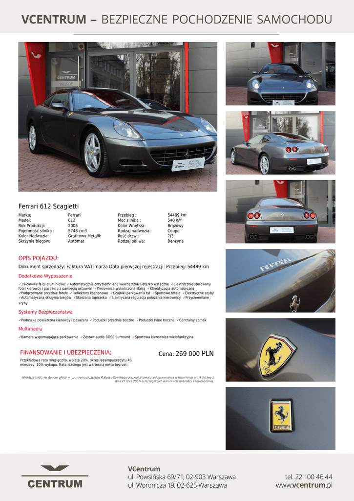 Ferrari 612 Scagletti Marka: Model: Rok Produkcji: Pojemność silnika : Kolor Nadwozia: Skrzynia biegów: Ferrari 612 2006 5748 cm3 Grafitowy Metalik Automat Przebieg : Moc silnika : Kolor Wnętrza: Rodzaj nadwozia: Ilość drzwi: Rodzaj paliwa: 54489 km 540 KM Brązowy Coupe 2/3 Benzyna OPIS POJAZDU: Dokument sprzedaży: Faktura VAT-marża Data pierwszej rejestracji: Przebieg: 54489 km Dodatkowe Wyposażenie ✓19-calowe felgi aluminiowe ✓Automatycznie przyciemniane wewnętrzne lusterko wsteczne ✓Elektrycznie sterowany fotel kierowcy i pasażera z pamięcią ustawień ✓Kierownica wykończona skórą ✓Klimatyzacja automatyczna ✓Podgrzewane przednie fotele ✓Reflektory ksenonowe ✓Czujniki parkowania tył ✓Sportowe fotele ✓Elektryczne szyby ✓Automatyczna skrzynia biegów ✓Skórzana tapicerka ✓Elektryczna regulacja położenia kierownicy ✓Przyciemniane szyby Systemy Bezpieczeństwa ✓Poduszka powietrzna kierowcy i pasażera ✓Poduszki przednie boczne ✓Poduszki tylne boczne ✓Centralny zamek Multimedia ✓Kamera wspomagająca parkowanie ✓Zestaw audio BOSE Surround ✓Sportowa kierownica wielofunkcyjna FINANSOWANIE I UBEZPIECZENIA: Cena: 269 000 PLN Przykładowa rata miesięczna, wpłata 20%, okres leasingu/kredytu 48 miesięcy, 10% wykupu. Rata leasingu jest wartością netto bez vat. Niniejsza treść nie stanowi oferty w rozumieniu przepisów Kodeksu Cywilnego oraz opisu towaru ani zapewnienia w rozumieniu art. 4 Ustawy z dnia 27 lipca 2002r o szczególnych warunkach sprzedaży konsumenckiej. Powered by TCPDF (www.tcpdf.org)