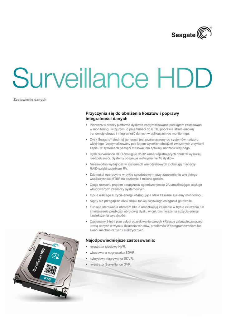 Surveillance HDD Zestawienie danych Przyczynia się do obniżenia kosztów i poprawy integralności danych • Pierwsza w branży platforma dyskowa zoptymalizowana pod kątem zastosowań w monitoringu wizyjnym, o pojemności do 6 TB, poprawia strumieniową transmisję obrazu i integralność danych w aplikacjach do monitoringu. • Dysk Seagate® siódmej generacji jest przeznaczony do systemów nadzoru wizyjnego i zoptymalizowany pod kątem wysokich obciążeń związanych z cyklami zapisu w systemach pamięci masowej dla aplikacji nadzoru wizyjnego. • Dysk Surveillance HDD obsługuje do 32 kamer rejestrujących obraz w wysokiej rozdzielczości. Systemy obejmuje maksymalnie 16 dysków. • Niezawodna wydajność w systemach wielodyskowych z obsługą macierzy RAID dzięki czujnikom RV. • Zdolności operacyjne w cyklu całodobowym przy zapewnieniu wysokiego współczynnika MTBF na poziomie 1 miliona godzin. • Opcje rozruchu prądem o natężeniu ograniczonym do 2A umożliwiające obsługę wbudowanych zasilaczy systemowych. • Opcje niskiego zużycia energii obsługujące stale zasilane systemy monitoringu. • Nigdy nie przegapisz klatki dzięki funkcji szybkiego osiągania gotowości. • Funkcje sterowania obrotem Idle 3 umożliwiają zasilanie w trybie czuwania lub zmniejszenie prędkości obrotowej dysku w celu zmniejszenia zużycia energii i zwiększenia wydajności. • Opcjonalny 3-letni plan usługi odzyskiwania danych +Rescue zabezpiecza przed utratą danych w wyniku działania wirusów, problemów z oprogramowaniem lub awarii mechanicznych i elektrycznych. Najodpowiedniejsze zastosowania: • rejestrator sieciowy NVR, • wbudowana nagrywarka SDVR, • hybrydowa nagrywarka SDVR, • rejestrator Surveillance DVR. Surveillance HDD Parametry Nazwa marketingowa Numer modelu Numer modelu +Rescue Interfejs Pamięć podręczna, MB Liczba bajtów na sektor Wydajność przy realizacji funkcji nadzoru Czujniki drgań obrotowych Liczba obsługiwanych kieszeni dyskowych Liczba obsługiwanych kamer Maksymalna długotrwała szybkość transferu danych, odczyt OD (MB/s) Usługa odzyskiwania danych +Rescue 3-letnia opcja z modelem +Rescue Napięcie Tolerancja napięcia, w tym szumów (5 V) Tolerancja napięcia, w tym szumów (12 V) Zarządzanie energią Prąd rozruchu o napięciu 12 V (A) Podczas pracy, typowo (W) W stanie spoczynku, średnio (W) Stan oczekiwania (W) Stan uśpienia (W) Środowisko pracy Temperatura Podczas pracy (min. temp. otoczenia, °C) Podczas pracy (maks. temp. obudowy dysku, °C) W stanie spoczynku (min. temp. otoczenia, °C) W stanie spoczynku (maks. temp. otoczenia, °C) Niezawodność Cykle parkowania/startu głowicy Nieodwracalne błędy odczytu na odczytane bity, maksymalnie Średni czas bezawaryjnej pracy (MTBF, w godz.) Godziny pracy Ograniczona gwarancja (lata) Fizyczne Wysokość (mm) Szerokość (mm) Głębokość (mm) Waga (g) Ilość jednostek w kartonie Ilość kartonów na palecie Ilość kartonów w warstwie 1 6 TB1 5 TB1 4 TB1 3 TB1 3 TB1 2 TB1 1 TB1 Surveillance HDD ST6000VX0001 ST6000VX0011 SATA 6 Gb/s 128 4096 Surveillance HDD ST5000VX0001 ST5000VX0011 SATA 6 Gb/s 128 4096 Surveillance HDD ST4000VX000 ST4000VX002 SATA 6 Gb/s 64 4096 Surveillance HDD ST3000VX002 — SATA 6 Gb/s 64 4096 Surveillance HDD ST3000VX006 ST3000VX005 SATA 6 Gb/s 64 4096 Surveillance HDD ST2000VX003 ST2000VX005 SATA 6 Gb/s 64 4096 Surveillance HDD ST1000VX001 ST1000VX003 SATA 6 Gb/s 64 4096 TAK od 1 do 16 do 32 TAK od 1 do 16 do 32 TAK od 1 do 16 do 32 TAK od 1 do 16 do 32 NIE od 1 do 8 do 32 NIE od 1 do 8 do 32 NIE od 1 do 8 do 32 180 180 180 180 180 180 180 TAK TAK TAK NIE TAK TAK TAK ±5% ±10% ±5% ±10% ±5% ±10% ±5% ±10% ±5% ±10% ±5% ±10% ±5% ±10% 1,8 8 6,7 0,5 0,5 1,8 8 6,7 0,5 0,5 1,8 5,6 4 0,5 0,5 1,8 5,6 4 0,5 0,5 1,8 5,6 4 0,5 0,5 1,8 5,6 4 0,5 0,5 1,2 5,6 4 0,5 0,5 5 60 -40 70 5 60 -40 70 0 70 -40 70 0 70 -40 70 0 70 -40 70 0 70 -40 70 0 70 -40 70 300 000 1 na 1014 1 mln 8760 3 300 000 1 na 1014 1 mln 8760 3 300 000 1 na 1014 1 mln 8760 3 300 000 1 na 1014 1 mln 8760 3 300 000 1 na 1014 1 mln 8760 3 300 000 1 na 1014 1 mln 8760 3 300 000 1 na 1014 1 mln 8760 3 26,11 101,85 147 780 20 40 8 26,11 101,85 147 780 20 40 8 26,11 101,6 146,99 610 20 40 8 26,11 101,6 146,99 610 20 40 8 26,11 101,6 146,99 610 20 40 8 26,11 101,6 146,99 610 20 40 8 19,98 101,6 146,99 400 25 40 8 W przypadku oznaczania pojemności dysków, jeden gigabajt (oznaczany także jako „GB”) jest równy jednemu miliardowi bajtów, a jeden terabajt (oznaczany także jako „TB”) jest równy jednemu bilionowi bajtów. Surveillance HDD Specyfikacja Nazwa marketingowa Numer modelu Numer modelu +Rescue Interfejs Pamięć podręczna, MB Liczba bajtów na sektor Wydajność przy realizacji funkcji nadzoru Czujniki drgań obrotowych Liczba obsługiwanych kieszeni dyskowych Liczba obsługiwanych kamer Maksymalna długotrwała szybkość transferu danych, odczyt OD (MB/s) Usługa odzyskiwania danych +Rescue 3-letnia opcja z modelem +Rescue Napięcie Tolerancja napięcia, w tym szumów (5 V) Tolerancja napięcia, w tym szumów (12 V) Zarządzanie energią Prąd rozruchu o napięciu 12 V (A) Podczas pracy (typowo, W) W stanie spoczynku, średnio (W) Tryb czuwania (W) Stan uśpienia (W) Środowisko pracy Temperatura Podczas pracy (min. temp. otoczenia, °C) Podczas pracy (maks. temp. obudowy dysku, °C) W stanie spoczynku (min. temp. otoczenia, °C) W stanie spoczynku (maks. temp. otoczenia, °C) Niezawodność Cykle parkowania/startu głowicy Nieodwracalne błędy odczytu na odczytane bity, maksymalnie Średni czas bezawaryjnej pracy (MTBF, w godz.) Godziny pracy Ograniczona gwarancja (lata) Fizyczne Wysokość (mm) Szerokość (mm) Głębokość (mm) Waga (g) Ilość jednostek w kartonie Ilość kartonów na palecie Ilość kartonów w warstwie 1 3 TB1 2 TB1 1 TB1 SV35 Series™ ST3000VX000 ST3000VX004 SATA 6 Gb/s 64 4096 SV35 Series ST2000VX000 ST2000VX004 SATA 6 Gb/s 64 4096 SV35 Series ST