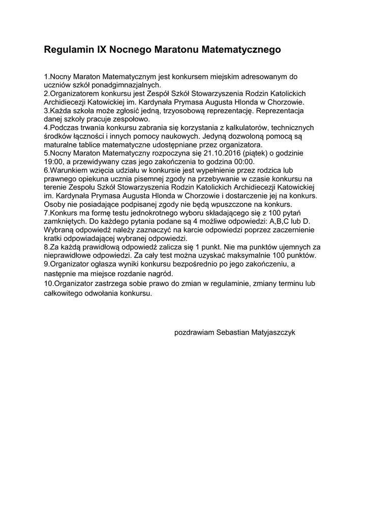 Regulamin IX Nocnego Maratonu Matematycznego 1.Nocny Maraton Matematycznym jest konkursem miejskim adresowanym do uczniów szkół ponadgimnazjalnych. 2.Organizatorem konkursu jest Zespół Szkół Stowarzyszenia Rodzin Katolickich Archidiecezji Katowickiej im. Kardynała Prymasa Augusta Hlonda w Chorzowie. 3.Każda szkoła może zgłosić jedną, trzyosobową reprezentację. Reprezentacja danej szkoły pracuje zespołowo. 4.Podczas trwania konkursu zabrania się korzystania z kalkulatorów, technicznych środków łączności i innych pomocy naukowych. Jedyną dozwoloną pomocą są maturalne tablice matematyczne udostępniane przez organizatora. 5.Nocny Maraton Matematyczny rozpoczyna się 21.10.2016 (piątek) o godzinie 19:00, a przewidywany czas jego zakończenia to godzina 00:00. 6.Warunkiem wzięcia udziału w konkursie jest wypełnienie przez rodzica lub prawnego opiekuna ucznia pisemnej zgody na przebywanie w czasie konkursu na terenie Zespołu Szkół Stowarzyszenia Rodzin Katolickich Archidiecezji Katowickiej im. Kardynała Prymasa Augusta Hlonda w Chorzowie i dostarczenie jej na konkurs. Osoby nie posiadające podpisanej zgody nie będą wpuszczone na konkurs. 7.Konkurs ma formę testu jednokrotnego wyboru składającego się z 100 pytań zamkniętych. Do każdego pytania podane są 4 możliwe odpowiedzi: A,B,C lub D. Wybraną odpowiedź należy zaznaczyć na karcie odpowiedzi poprzez zaczernienie kratki odpowiadającej wybranej odpowiedzi. 8.Za każdą prawidłową odpowiedź zalicza się 1 punkt. Nie ma punktów ujemnych za nieprawidłowe odpowiedzi. Za cały test można uzyskać maksymalnie 100 punktów. 9.Organizator ogłasza wyniki konkursu bezpośrednio po jego zakończeniu, a następnie ma miejsce rozdanie nagród. 10.Organizator zastrzega sobie prawo do zmian w regulaminie, zmiany terminu lub całkowitego odwołania konkursu. pozdrawiam Sebastian Matyjaszczyk