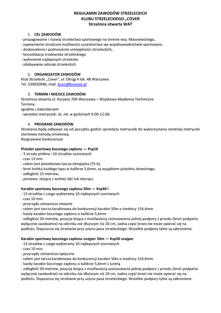 REGULAMIN ZAWODÓW STRZELECKICH KLUBU STRZELECKIEGO „COVER Strzelnica otwarta WAT 1. CEL ZAWODÓW - propagowanie i rozwój strzelectwa sportowego na terenie woj. Mazowieckiego, - zapewnienie strzelcom możliwości uczestnictwa we współzawodnictwie sportowym, - doskonalenie i podnoszenie umiejętności strzeleckich, - konsolidacja środowiska strzeleckiego - wyłonienie najlepszych strzelców - zdobywanie odznak strzeleckich 2. ORGANIZATOR ZAWODÓW Klub Strzelecki „Cover”, ul. Okrąg 4 lok. 48 Warszawa Tel. 530920940, mail. [email protected] 3. TERMIN I MIEJSCE ZAWODÓW Strzelnica otwarta ul. Kocjana 70A Warszawa – Wojskowa Akademia Techniczna. Terminy: zgodnie z kalendarzem - sprzedaż metryczek: sb, nd: w godzinach 9.00-12.00; 4. PROGRAM ZAWODÓW Strzelania będą odbywad się od początku godzin sprzedaży metryczek do wykorzystania ostatniej metryczki startowej metodą zmianową. Rozgrywane konkurencje: Pistolet sportowy bocznego zapłonu — Psp10 - 3 strzały próbne i 10 strzałów ocenianych - czas 13 min. - celem jest pistoletowa tarcza olimpijska (TS-4), - broo krótka każdego typu w kalibrze 5,6mm, za wyjątkiem pistoletu dowolnego, - odległośd 25 metrów, - postawa: stojąca z wolnej ręki lub oburącz. Karabin sportowy bocznego zapłonu 50m — Ksp50 l - 13 strzałów z czego wybieramy 10 najlepszych ocenianych - czas 10 min. - przyrządy celownicze otwarte - celem jest tarcza karabinowa do konkurencji karabin 50m o średnicy 154,4mm - każdy karabin bocznego zapłonu o kalibrze 5,6mm - odległośd 50 metrów, pozycja leżąca z możliwością zastosowania jednej podpory z przodu (broo podparta wyłącznie swobodnie) na odcinku nie dłuższym niż 20 cm, żadna częśd broni nie może opierad się na podłożu. Dopuszcza się strzelanie przy użyciu pasa strzeleckiego. Wszelkie podpory tylne są zabronione. Karabin sportowy bocznego zapłonu snajper 50m — Ksp50 snajper - 13 strzałów z czego wybieramy 10 najlepszych ocenianych - czas 10 min. - przyrządy celownicze optyczne - celem jest tarcza karabinowa do konkurencji karabin 50m o średnicy 154,4mm - każdy karabin bocznego zapłonu o kalibrze 5,6mm z lunetą - odległośd 50 metrów, pozycja leżąca z możliwością zastosowania jednej podpory z przodu (broo podparta wyłącznie swobodnie) na odcinku nie dłuższym niż 20 cm, żadna częśd broni nie może opierad się na podłożu. Dopuszcza się strzelanie przy użyciu pasa strzeleckiego. Wszelkie podpory tylne są zabronione. Pistolet centralnego zapłonu — Pcz10 - 3 strzały próbne i 10 strzałów ocenianych - czas 13 min. - celem jest pistoletowa tarcza olimpijska (TS-4), - każdy pistolet centralnego zapłonu o kalibrze 7,62–9 mm, - odległośd 25 metrów, - postawa: stojąca z wolnej ręki lub oburącz. Pistolet centralnego zapłonu 45ACP— Pcz10 – 45ACP - 3 strzały próbne i 10 strzałów ocenianych - czas 13 min. - celem jest pistoletowa tarcza olimpijska (TS-4), - każdy pistolet centralnego zapłonu o kalibrze 45ACP, - odległośd 25 metrów, - postawa: stojąca z wolnej ręki lub oburącz. Rewolwer centralnego zapłonu — Rcz10 - 3 strzały próbne i 10 strzałów ocenianych - czas 13 min. - celem jest pistoletowa tarcza olimpijska (TS-4), - każdy rewolwer centralnego zapłonu o kalibrze do 38spl, - odległośd 25 metrów, - postawa: stojąca z wolnej ręki lub oburącz. Karabin centralnego zapłonu 200m— Kcz200 - 13 strzałów z czego wybieramy 10 najlepszych ocenianych - czas 10 min. - przyrządy celownicze otwarte - celem jest tarcza od pistoletu szybkostrzelnego (pole 10 – 100mm) - każdy karabin centralnego zapłonu o kalibrze do 11,43mm, - odległośd 200 metrów, pozycja leżąca z możliwością zastosowania jednej podpory z przodu (broo podparta wyłącznie swobodnie) na odcinku nie dłuższym niż 20 cm (statyw, worek lub dwójnóg itp.), żadna częśd broni nie może opierad się na podłożu. Wszelkie podpory tylne są zabronione. Karabin centralnego zapłonu z optyką 200m— Kcz200 snajper - 13 strzałów z czego wybieramy 10 najlepszych ocenianych - czas 10 min. - przyrządy celownicze optyczne - celem jest pistoletowa tarcza olimpijska (TS-4) - każdy karabin centralnego zapłonu o kalibrze do 11,43mm, - odległośd 200 metrów, pozycja leżąca z możliwością zastosowania jednej podpory z przodu (broo podparta wyłącznie swobodnie) na odcinku nie dłuższym niż 20 cm (statyw, worek lub dwójnóg itp.), żadna częśd broni nie może opierad się na podłożu. Wszelkie podpory tylne są zabronione. Karabin centralnego zapłonu 100m — Kcz100 - 13 strzałów z czego wybieramy 10 najlepszych ocenianych - czas 10 min. - przyrządy celownicze otwarte - celem jest tarcza pistoletowa TS4 - każdy karabin centralnego zapłonu o kalibrze do 11,43mm, - odległośd 100 metrów, pozycja leżąca z możliwością zastosowania jednej podpory z przodu (broo podparta wyłącznie swobodnie) na odcinku nie dłuższym niż 20 cm (statyw, worek lub dwójnóg itp.), żadna częśd broni nie może opierad się na podłożu. Wszelkie podpory tylne są zabronione. Karabin centralnego zapłonu z optyką 100m — Kcz100 snajper - 13 strzałów z czego wybieramy 10 najlepszych ocenianych - czas 10 min. - przyrządy celownicze optyczne - celem jest karabinowa tarcza (TS-1) - każdy karabin centralnego zapłonu o kalibrze do 11,43mm, - odległośd 100 metrów, pozycja leżąca z możliwością zastosowania jednej podpory z przodu (broo podparta wyłącznie swobodnie) na odcinku nie dłuższym niż 20 cm (statyw, worek lub dwójnóg itp.), żadna częśd broni nie może opierad się na podłożu. Wszelkie podpory tylne są zabronione. 2xStrzelba dynamiczna 5 strzałów — Sd 5 - 5 strzałów ocenianych - czas dowolny - cel metalowy - każda broo (standard manual) i amunicja śrutowa o kalibrze 12 Ocena: każdy trafiony poper 5 pkt. Wygrywa osoba, której współczynnik pkt/czas będzie największy. Zawodnicy poruszają się po wcześn