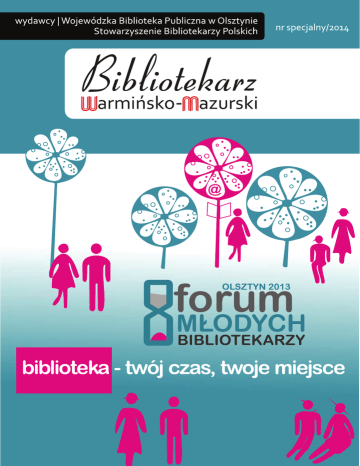 @ forum Bibliotekarz Warmińsko-Mazurski ISSN: 1640-2200 Zespół redakcyjny: Sylwia Białecka, Andrzej Marcinkiewicz – przewodniczący, Renata Pietrulewicz, Anita Romulewicz, Ewa Rudnicka, Adrianna Walendziak, grafika: Iwona Bolińska-Walendzik Adres redakcji: Wojewódzka Biblioteka Publiczna w Olsztynie ul. 1 Maja 5, 10-117 Olsztyn tel. 89 524 90 32, [email protected] Wydawcy numeru specjalnego: Wojewódzka Biblioteka Publiczna w Olsztynie Stowarzyszenie Bibliotekarzy Polskich Redakcja numeru specjalnego: Sylwia Białecka, Adrianna Walendziak Bibliotekarz Warmińsko-Mazurski. Numer Specjalny. Materiały z 8. Forum Młodych Bibliotekarzy w Olsztynie ukazał się jako publikacja pokonferencyjna 8. FMB, które odbyło się 12-13 września 2013 r. w Olsztynie. ORGANIZATORZY 8. FORUM MŁODYCH BIBLIOTEKARZY W OLSZTYNIE Stowarzyszenie Bibliotekarzy Polskich (SBP) jest organizacją pożytku publicznego, o blisko stuletniej tradycji, zrzeszającą ponad 7,5 tys. osób związanych z bibliotekarstwem i informacją naukową, ze wszystkich typów bibliotek: publicznych, akademickich, naukowych, specjalnych, szkolnych i pedagogicznych. Misją SBP jest działanie na rzecz rozwoju bibliotekarstwa, budowanie tożsamości zawodu bibliotekarza, integracja środowiska, a także kreowanie pozytywnego wizerunku bibliotek i zawodu bibliotekarza. Wizją działalności Stowarzyszenia jest tworzenie przestrzeni partnerskiej dla rozwoju bibliotek w społeczeństwie wiedzy. Stowarzyszenie stawia na młodych. Od 2006 r. organizuje co roku Forum Młodych Bibliotekarzy, będące platformą doskonalenia i integracji młodej kadry bibliotekarskiej, rozwoju jej potencjału, kreatywności oraz wymiany doświadczeń zawodowych. Więcej o SBP i Forum Młodych Bibliotekarzy w portalu www.sbp.pl. Wojewódzka Biblioteka Publiczna im. Emilii Sukertowej-Biedrawiny w Olsztynie Stowarzyszenie Bibliotekarzy Polskich Bibliotekarz Warmińsko-Mazurski numer specjalny Materiały z 8. Forum Młodych Bibliotekarzy w Olsztynie 12-13 września 2013 r. Olsztyn 2014 Szanowni Czytelnicy! Drodzy Forumowicze! Oddajemy do Waszych rąk, a właściwie do Waszych smartfonów, tabletów i komputerów numer specjalny naszego „Bibliotekarza Warmińsko-Mazurskiego”, przypominający i podsumowujący wspaniałe wydarzenie, jakim było 8. Forum Młodych Bibliotekarz w Olsztynie. 8. FMB odbyło się 12-13 września 2014 r. w Olsztynie. Organizatorami Forum byli: Stowarzyszenie Bibliotekarzy Polskich, Wojewódzka Biblioteka Publiczna w Olsztynie, Miejska Biblioteka Publiczna w Olsztynie, Biblioteka Uniwersytecka UWM oraz Instytut Książki. Podczas Forum wygłoszono osiemnaście referatów i przeprowadzono szesnaście warsztatów. Wykład inauguracyjny pt. „Przyszłość książki – czy czytelnictwo przetrwa?” wygłosił Łukasz Gołębiewski, głos zabrali również: Jacek Wojnarowski i Tomasz Makowski. Po oficjalnych przemówieniach swoje referaty zaprezentowali prelegenci z całej Polski: Biblioteka 3.0 (Adam Piwek), Aplikacje mobilne w bibliotece (Sylwia Czub-Kiełczewska, Szymon Manikowski), O specyfice rozmowy z klientem (dr hab. Mariusz Rutkowski), Mobilność bibliotekarza = zadowolenie czytelnika (Agata Walczak-Niewiadomska), Partnerstwo jako źródło dodatkowych korzyści dla biblioteki (Krzysztof Dąbkowski), Jeden budynek – dwie instytucje? (Dorota Sochocka), Kariera w bibliotece – tajemnica sukcesu (Łukasz Ślusarczyk), Mentoring i coaching jako formy rozwoju zawodowego młodych bibliotekarzy (Magdalena Gomułka), Kreowanie wirtualnej przestrzeni biblioteki (Dawid Kotlarek), E-booki w OPACU, jak to sobie wymyślili bibliotekarze z Białołęki i Bemowa (Jan Mroczek), Wpływ rosnącej popularności self-publishingu na zmiany w środowiskach wydawniczych i bibliotekarskich (Marek Maruszczak), Morderstwo, operacja, sekcja, czyli co potrafi opolski bibliotekarz (Magdalena Schatt-Skotak), Inicjatywy młodzieżowe w mediatece, przyszłym sukcesem Biblioteki Wojewódzkiej (Marta Bieława), Blogi bibliotekarzy jako wyraz samorealizacji (Ilona Niewczas, Dariusz Perliński), Gadżety technologiczne, media społecznościowe i ich wykorzystanie w małej bibliotece miejskiej (Roman Wojciechowski), oraz Czy bibliotekarz może być radiowcem? (Jacek Smółka). Forumowicze uczestniczyli również w warsztatach: Najmłodsi w bibliotece – nowe pomysły na nowe czasy (Joanna Olech), Merchandising w bibliotece (Magda Balicka), Wespół w zespół – jak zbudować zespół? (Marek Jurowski), Gra o książkę – gry planszowe w bibliotece (Mateusz Pejas), Bibliotekarz fotografujący contra bibliotekarz fotografowany (Grzegorz Winnicki), Architektura małych bibliotek – o współpracy między architektem a bibliotekarzem (Piotr Kieżun), Ochrona danych osobowych na co dzień – nic trudnego a ważne (Sylwia Czub -Kiełczewska), Bibliotekarze asertywni na co dzień (Monika Piłka), Majsterkowanie 2.0 (Agnieszka Koszowska), Profil na Facebooku, strona WWW biblioteki – co wolno, a czego nie wolno zamieszczać? (Joanna Potęga), Dobra dyskusja podstawą dobrego spotkania Dyskusyjnego Klubu Książki (Mateusz Pejas, Marek Jurowski) oraz Młodzi w bibliotece? (Kamila Radzimińska-Arczak). Obrady forum zakończył wykład Pawła Brauna (dyrektor WiMBP w Gdańsku) na temat przyszłej roli bibliotek. Z bogactwa referatów i wystąpień prezentujemy teksty nadesłane przez autorów według podziału na bloki tematyczne 8. FMB: Miejsce innowacji, Czas potrzeb, Rusz z miejsca, Czas na ciebie. Uważny czytelnik zauważy jednak nowy dział: Czas po forum – a w nim poforumową refleksję Katarzyny Bikowskiej, do lektury której również gorąco zachęcamy. Podczas redakcji materiałów staraliśmy się nie ingerować w tkankę tekstu, nanosząc nieliczne tylko poprawki stylistyczne oraz korekty, ujednoliciliśmy jednak przypisy zgodnie z zasadami wyłuszczonymi w publikacji M. Antczak i A. Nowackiej: Przypisy. Powołania. Bibliografia załącznikowa 