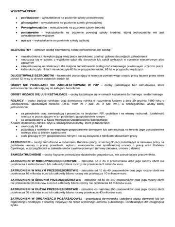WYKSZTAŁCENIE: podstawowe – wykształcenie na poziomie szkoły podstawowej gimnazjalne – wykształcenie na poziomie szkoły gimnazjalnej Ponadgimnazjalne – wykształcenie na poziomie szkoły średniej pomaturalne – wykształcenie na poziomie powyżej szkoły średniej, której jednocześnie nie jest wykształceniem wyższym wyższe – wykształcenie na poziomie szkoły wyższej BEZROBOTNY – oznacza osobę bezrobotną, która jednocześnie jest osobą: niezatrudnioną i niewykonującą innej pracy zarobkowej, zdolną i gotowa do podjęcia zatrudnienia nieuczącą się w szkole, z wyjątkiem szkół dla dorosłych lub szkół wyższych w systemie wieczorowym albo zaocznym zarejestrowaną we właściwym dla miejsca zameldowania stałego lub czasowego powiatowym urzędzie pracy która ukończyła 18 lat i nie ukończyła 60 lat w przypadku kobiet, 65 lat w przypadku mężczyzn DŁUGOTRWALE BEZROBOTNI – bezrobotni pozostający w rejestrze powiatowego urzędu pracy łącznie przez okres ponad 12 m-cy w okresie ostatnich dwóch lat OSOBY NIE PRACUJĄCE NIE ZAREJESTROWANE W PUP – osoby pozostające bez zatrudnienia, które jednocześnie nie zaliczają się do kategorii bezrobotni OSOBY UCZĄCE SIĘ LUB KSZTAŁCĄCE – osoby kształcące się w ramach kształcenia formalnego i nieformalnego ROLNICY – osoby będące rolnikami oraz domownicy rolnika w rozumieniu Ustawy z dnia 20 grudnia 1990 roku o ubezpieczeniu społecznym rolników (Dz.U. 1991 nr 7 poz. 24, z póź. zm.), w szczególności, osoby której jednocześnie: są pełnoletnie oraz zamieszkują i prowadza na terytorium RP, osobiście i na własny rachunek, działalność rolniczą w pozostającym w ich posiadaniu gospodarstwie rolnym są ubezpieczone w Kasie Rolniczego Ubezpieczenia Społecznego A także domownicy rolnika, czyli w szczególności osoby, które jednocześnie: ukończyły 16 lat pozostają z rolnikiem we wspólnym gospodarstwie domowym lub zamieszkują na terenie jego gospodarstwa rolnego albo w bliskim sąsiedztwie stale pracują w tym gospodarstwie rolnym i nie są związane z rolnikiem stosunkiem pracy ZATRUDNIENI – osoby zatrudnione w rozumieniu Kodeksu pracy, w szczególności pozostające w stosunku pracy na podstawie umowy o pracę, powołania, wyboru, mianowania oraz spółdzielczej umowy o pracę oraz Kodeksu Cywilnego, w szczególności w zakresie umów cywilno-prawnych (umowy zlecenia, umowy o dzieło) SAMOZATRUDNIENIE – osoby fizyczne prowadzące działalność gospodarczą, nie zatrudniające pracowników. ZATRUDNIENI W MIKROPRZEDSIĘBIORSTWIE – zatrudnia od 2 do 9 pracowników oraz jego roczny obrót nie przekracza 2 milionów euro lub całkowity bilans roczny nie przekracza 2 milionów euro. ZATRUDNIENI W MAŁYM PRZEDSIĘBIORSTWIE - zatrudnia od 10 do 49 pracowników oraz jego roczny obrót nie przekracza 10 milionów euro lub całkowity bilans roczny nie przekracza 10 milionów euro. ZATRUDNIENI W ŚREDNIM PRZEDSIĘBIORSTWIE - zatrudnia od 50 do 249 pracowników oraz jego roczny obrót nie przekracza 50 milionów euro lub całkowity bilans roczny nie przekracza 43 milionów euro. ZATRUDNIENI W DUŻYM PRZEDSIĘBIORSTWIE - zatrudnia co najmniej 250 pracowników oraz jego roczny obrót przekracza 50 milionów euro lub całkowity bilans roczny przekracza 43 milionów euro. ZATRUDNIENI W ORGANIZACJI POZARZĄDOWEJ - organizacja obywatelska (założona przez obywateli lub ich organizacje) działająca z własnej inicjatywy na rzecz wybranego interesu publicznego i niedziałająca dla osiągnięcia zysku.