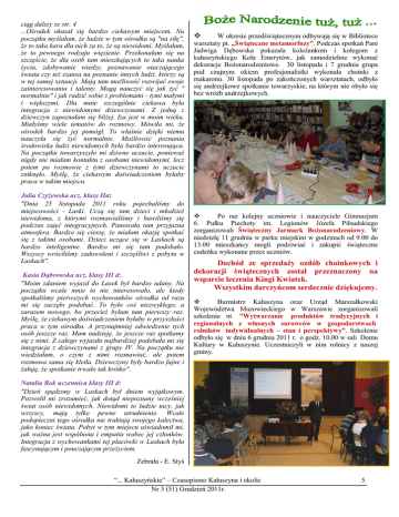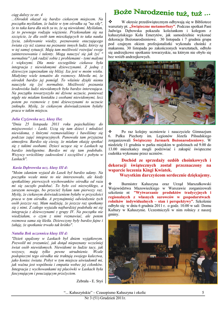ciąg dalszy ze str. 4 ...Ośrodek okazał się bardzo ciekawym miejscem. Na początku myślałam, że ludzie w tym ośrodku są "na siłę", że to taka kara dla nich za to, że są niewidomi. Myślałam, że to pewnego rodzaju więzienie. Przekonałam się na szczęście, że dla osób tam mieszkających to taka nauka życia, zdobywanie wiedzy, poznawanie otaczającego świata czy też szansa na poznanie innych ludzi, którzy są w tej samej sytuacji. Mają tam możliwość rozwijać swoje zainteresowania i talenty. Mogą nauczyć się jak żyć " normalnie" i jak radzić sobie z problemami - tymi małymi i większymi. Dla mnie szczególnie ciekawa była integracja z niewidomymi dziewczynami. Z jedną z dziewczyn zapoznałam się bliżej. Iza jest w moim wieku. Miałyśmy wiele tematów do rozmowy. Mówiła mi, że ośrodek bardzo jej pomógł. To właśnie dzięki niemu nauczyła się żyć normalnie. Możliwość poznania środowiska ludzi niewidomych była bardzo interesująca. Na początku towarzyszyło mi dziwne uczucie, ponieważ nigdy nie miałam kontaktu z osobami niewidomymi, lecz potem po rozmowie z tymi dziewczynami to uczucie zniknęło. Myślę, że ciekawym doświadczeniem byłaby praca w takim miejscu. Julia Czyżewska ucz. klasy IIa: "Dnia 25 listopada 2011 roku pojechaliśmy do miejscowości - Laski. Uczą się tam dzieci i młodzież niewidoma, z którymi rozmawialiśmy i bawiliśmy się podczas zajęć integracyjnych. Panowała tam przyjazna atmosfera. Bardzo się cieszę, że miałam okazję spotkać się z takimi osobami. Dzieci uczące się w Laskach są bardzo inteligentne. Bardzo mi się tam podobało. Wszyscy wróciliśmy zadowoleni i szczęśliwi z pobytu w Laskach". Kasia Dąbrowska ucz. klasy III d: "Moim zdaniem wyjazd do Lasek był bardzo udany. Na początku wcale mnie to nie interesowało, ale kiedy spotkaliśmy pierwszych wychowanków ośrodka od razu mi się zaczęło podobać. To było coś niezwykłego, a zarazem nowego, bo przecież byłam tam pierwszy raz. Myślę, że ciekawym doświadczeniem byłaby w przyszłości praca w tym ośrodku. A przynajmniej odwiedzenie tych osób jeszcze raz. Mam nadzieję, że jeszcze raz spotkamy się z nimi. Z całego wyjazdu najbardziej podobała mi się integracja z dziewczynami z grupy IV. Na początku nie wiedziałam, o czym z nimi rozmawiać, ale potem rozmowa sama się kleiła. Dziewczyny były bardzo fajne i żałuję, że spotkanie trwało tak krótko". W okresie przedświątecznym odbywają się w Bibliotece warsztaty pt. „Świąteczne metamorfozy”. Podczas spotkań Pani Jadwiga Dębowska pokazała koleżankom i kolegom z kałuszyńskiego Koła Emerytów, jak samodzielnie wykonać dekoracje Bożonarodzeniowe. 30 listopada i 7 grudnia grupa pod czujnym okiem profesjonalistki wykonała choinki z makaronu. 30 listopada po zakończonych warsztatach, odbyło się andrzejkowe spotkanie towarzyskie, na którym nie obyło się bez wróżb andrzejkowych. Po raz kolejny uczniowie i nauczyciele Gimnazjum 6. Pułku Piechoty im. Legionów Józefa Piłsudskiego zorganizowali Świąteczny Jarmark Bożonarodzeniowy. W niedzielę 11 grudnia w parku miejskim w godzinach od 9.00 do 13.00 mieszkańcy mogli podziwiać i zakupić świąteczne cudeńka wykonane przez uczniów. Dochód ze sprzedaży ozdób choinkowych i dekoracji świątecznych został przeznaczony na wsparcie leczenia Kingi Kwiatek. Wszystkim darczyńcom serdecznie dziękujemy. Burmistrz Kałuszyna oraz Urząd Marszałkowski Województwa Mazowieckiego w Warszawie zorganizowali szkolenie nt ”Wytwarzanie produktów tradycyjnych i regionalnych z własnych surowców w gospodarstwach rolników indywidualnych – stan i perspektywy”. Szkolenie odbyło się w dniu 6 grudnia 2011 r. o godz. 10.00 w sali Domu Kultury w Kałuszynie. Uczestniczyli w nim rolnicy z naszej gminy. Natalia Bok uczennica klasy III d: "Dzień spędzony w Laskach był dniem wyjątkowym. Pozwolił mi zrozumieć, jak dotąd niepoznany wcześniej świat osób niewidomych. Niewidomi to ludzie tacy, jak wszyscy, mają tylko pewne utrudnienie. Wcale podopieczni tego ośrodka nie traktują swojego kalectwa, jako koniec świata. Pobyt w tym miejscu uświadomił mi, jak ważna jest wspólnota i empatia wobec jej członków. Integracja z wychowankami tej placówki w Laskach była fascynującym i pouczającym przeżyciem. Zebrała - E. Styś “... Kałuszyńskie” – Czasopismo Kałuszyna i okolic Nr 3 (51) Grudzień 2011r. 5