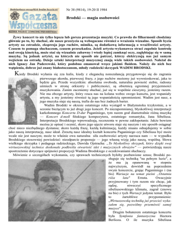 Nr 38 (9814), 19-20 II 1984 Brodski — magia osobowości Żywy koncert to nie tylko lepsza lub gorsza prezentacja muzyki. Co prawda do filharmonii chodzimy głównie po to, by słuchać, ale nasze przeżycia są wzbogacane również o wrażenia wizualne. Sposób bycia artysty na estradzie, ekspresja jego ruchów, mimika, są dodatkową informacją o wrażliwości artysty. Czasem to pomaga słuchaczom, czasem przeszkadza. Jeżeli artysta-wykonawca straci zupełnie kontrolę nad swoją kinetyką, może stać się wizualnie zabawny i wtedy lepiej zamknąć oczy, zagłębiając się w samą muzykę. Są jednak artyści, na których nie sposób nie patrzeć, którzy elektryzują nas już samym wejściem na estradę. Dzieje sztuki interpretacji muzycznej znają wiele takich osobowości. Należał do nich Ignacy Jan Paderewski, który podobno emanował wręcz jakimś fluidem. Należy do nich bez wątpienia, dobrze już znany białostoczanom, młody radziecki skrzypek WADIM BRODSKI. Kiedy Brodski wyłania się zza kulis, kiedy z elegancką nonszalancją przygotowuje się do zagrania pierwszego akordu, pierwszej frazy, z jego ruchów możemy już wywnioskować, jaka to będzie gra. Przede wszystkim: absolutna swoboda, naturalna pewność siebie, radosny uśmiech w stronę orkiestry i publiczności, są obietnicą ogromnej przyjemności muzykowania. Zanim zaczniemy słuchać, już się w wspólnie cieszymy, jesteśmy razem. Nie ma obcego artysty, który rzuca nas na kolana wobec swego kunsztu, jest wspaniały artysta, a my jesteśmy również tą jego wspaniałością opromienieni. Wadim jest nasz, a jego muzyka staje się naszą, trafia do nas bez żadnych barier. Wadim Brodski w okresie ostatniego roku wystąpił w Białymstoku trzykrotnie, a w sezonie bieżącym to już drugi jego koncert. Po niezapomnianej, błyskotliwej interpretacji karkołomnego Koncertu D-dur Paganiniego, tym razem grał diametralnie różną muzykę — Koncert d-moll fińskiego kompozytora, ostatniego romantyka, Jana Sibeliusa. Interpretacje Brodskiego wprowadzają, recenzenta w pewne zakłopotanie. Jakże bowiem można je opisać i ocenić, skoro jego ujęcie utworu staje się naszym i nie sposób osiągnąć choć nieco niezbędnego dystansu; skoro każdą frazę, każdą kulminację, każdy niuans odnajdujemy w sobie jako naszą interpretację, nasz ideał. Zresztą nasz idealny kształt koncertu Paganiniego czy Sibeliusa być może wcale nie jest naszym; może to właśnie owa naturalna siła osobowości artysty narzuca nam — w wypadku Brodskiego stosowniej powiedzieć: nieodparcie proponuje — jego własną wizję jako naszą, wspólną. Słowa wielkiego skrzypka i pedagoga radzieckiego, Dawida Ojstracha: „To błyskotliwy skrzypek, który dzięki swej wirtuozowskiej technice doskonale podkreśla otwartość idei i muzycznych obrazów" — potwierdzają nasze spostrzeżenie dotyczące spójności propozycji Wadima Brodskiego z oczekiwaniami słuchaczy. Mówienie o szczegółach wykonania, czy sprawach technicznych byłoby pozbawione sensu; Brodski posługuje się techniką "na pełnym luzie", a że ma ją opanowaną w stopniu najwyższym, dowiódł na poprzednim swym koncercie, grając Paganiniego i (na bis) Wariacje na temat pieśni „Ostatnia róża lata" Ernsta. Owacyjnie przyjmowany i tym razem nie chcąc, jak sądzę, niweczyć specyficznego sibeliusowskiego klimatu, zagrał (znowu na bis) z tych Wariacji jedynie temat. Było to żartobliwe przypomnienie: „Wirtuozowską techniką już przecież wykazałem się, pozwólmy przemówić samej muzyce". Drugim bohaterem ostatniego koncertu była Symfonia fantastyczna Hectora Berlioza. O ile muzyka Sibeliusa właściwie zamyka romantyczną symfonikę, to sławna kompozycja francuskiego twórcy — ją otwiera. Czyni to, dodajmy, z wielkim trzaskiem, hucznie i malowniczo. Berlioz jest odkrywcą i pierwszym prawdziwym mistrzem orkiestry. Toteż porwać się na Symfonię fantastyczną jest dużym aktem odwagi. Z tych blisko godzinnych zapasów, orkiestra Filharmonii Białostockiej, prowadzona przez dyr. Tadeusza Chachaja od marzeń i namiętności, przez balowe sale, pola, aż na szafot, nie dała się jednak zgilotynować ostrym rygorom partytury. Co prawda Marzenia nie były zbyt pociągające i ulotne, a Namiętnościom nie dostawało przekonywającego wyartykułowania, to jednak otrzymaliśmy przekaz dający wystarczająco wyczerpującą informację o walorach tej pierwszej w historii muzyki symfonii programowej. Białostockich filharmoników na pewno stać na lepsze wykonanie. Bardzo dobra grupa instrumentów dętych (zwłaszcza drewnianych), przepięknie brzmiący obój w dialogu z rożkiem w scenie pastoralnej to pułap, do którego winien równać kwintet. Jego wzmocniony skład (dziewięć wiolonczel!) — oby tylko nie okazjonalnie — nie jest ciągle jeszcze na tyle skonsolidowany, by nie rozsypywać się w miejscach o zmiennych tempach, czy trudnych technicznie figuracjach. Warto chyba jednak więcej popracować, bo zbyt wielu jest w tej orkiestrze dobrych i bardzo dobrych muzyków i zbyt wielki to kapitał młodości, ambicji i możliwości, by satysfakcjonował nas wszystkich obecny wypadkowy poziom gry całego zespołu. STANISŁAW OLĘDZKI Fot. MARIUSZ OLKOWSKI