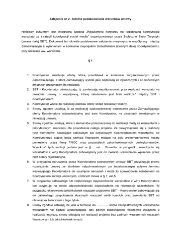Załącznik nr 2 - Istotne postanowienia warunków umowy Niniejszy dokument jest integralną częścią „Regulaminu konkursu na logistyczną koordynację warsztatu ze strategii koordynacji social media” organizowanego przez Stołeczne Biuro Turystyki (zwane dalej SBT). Dokument ten określa podstawowe założenia merytoryczne współpracy między Zamawiającym a wyłonionym w konkursie zwycięskim Uczestnikiem (zwanym dalej Koordynatorem), przy realizacji ww. warsztatu. §1 1. Koordynator zrealizuje ofertę, którą przedstawił w konkursie zorganizowanym przez Zamawiającego, a którą Zamawiający wybrał jako najlepszą ze zgłoszonych i po końcowych zmianach przeznaczył do realizacji. 2. SBT i Koordynator oświadczają, iż zamierzają współpracować przy realizacji warsztatu na zasadzie umowy o współpracę, której założeniem jest brak rozliczeń między SBT i Koordynatorem. 3. Koordynator wnosi do realizacji zakresu oferty wkład rzeczowy własny. 4. Strony zgodnie ustalają, iż za realizację zaakceptowanej ostatecznie przez Zamawiającego oferty Koordynatora odpowiedzialny jest sam Koordynator, na zasadach określonych w niniejszej umowie. 5. Strony zgodnie ustalają, które z elementów przeznaczonej do realizacji oferty są elementami o priorytetowym znaczeniu dla powodzenia całego projektu. Za niewywiązanie się z realizacji tych elementów, skutkujące całkowitym lub częściowym niepowodzeniem warsztatów, na Koordynatorze ciążyć będą sankcje finansowe mające na celu zrekompensować koszty poniesione przez firmę TNOC oraz pozostałych zakontraktowanych podwykonawców. Wysokość tych sankcji podana jest w §..., ust.... Ponadto, w przypadku nieodbycia się warsztatów z winy Koordynatora zobowiązany jest on zwrócić uczestnikom wpłacone przez nich opłaty rejestracyjne. 6. W przypadku naruszenia przez Koordynatora postanowień umowy SBT przysługuje prawo rozwiązania umowy ze skutkiem natychmiastowym po bezskutecznym upływie terminu wzywającego Koordynatora do usunięcia naruszeń i może to spowodować nałożeniem na Koordynatora sankcji umownych, o których mowa w § 1, ust.5. 7. W przypadku całkowitego lub częściowego niepowodzenia warsztatów z winy Koordynatora ten przyjmuje na siebie odpowiedzialność odpowiadania na reklamacje uczestników. W przypadku skierowania jakichkolwiek roszczeń przeciwko SBT – Koordynator zobowiązuje się do całkowitego zaspokojenia słusznych roszczeń osób trzecich oraz zwolnienia SBT od obowiązku świadczeń z tego tytułu. 8. Strony zgodnie ustalają, że jeśli w terminie do ….......... liczba zarejestrowanych uczestników warsztatów nie będzie wystarczająca, aby pokryć zobowiązania finansowe związane z realizacją imprezy, strony odstąpią od realizacji projektu bez żadnych wzajemnych roszczeń finansowych lub jakichkolwiek innych. 9. W imieniu SBT wobec Koordynatora będzie sprawowany nadzór w całym toku realizacji zaakceptowanej oferty przez osobę imiennie wyznaczoną przez SBT, zwaną Koordynatorem SBT, celem bieżących kontaktów, zabezpieczenia interesów SBT oraz egzekwowania postanowień niniejszej umowy. 10. Koordynator zobowiązuje się do ścisłej współpracy z reprezentującym interesy SBT Koordynatorem SBT oraz do umożliwiania mu pełnego wglądu w dokumentację i systemy rejestracyjne związane z realizowaną ofertą. 11. Za zgodą SBT Koordynator może zawrzeć umowę z podwykonawcami na udział w realizacji oferty. Ich dobór i zakres obowiązków należeć będzie do Koordynatora, przy czym nie może to naruszać postanowień niniejszej umowy w zakresie praw SBT. Koordynator ponosi wszelką odpowiedzialność wobec SBT za niewywiązanie się podwykonawców z podjętych zobowiązań, jak za działanie lub zaniechanie własne. 12. Koordynator gwarantuje i oświadcza, że jest w pełni uprawniony do zawarcia niniejszej umowy na określonych w niej warunkach oraz, że bierze na siebie odpowiedzialność dotyczącą zabezpieczenia wszelkich roszczeń mogących wyniknąć z tej umowy. 13. Koordynator zobowiązuje się do zrealizowania oferty zgodnie z najlepszą wiedzą fachową i starannością jakiej wymaga realizacja tego rodzaju, przy jednoczesnym uwzględnieniu wymogów organizacyjnych, technicznych, finansowych i wizerunkowych całego przedsięwzięcia oraz podmiotów biorących w nim udział. 14. Żadna ze stron nie jest uprawniona do przekazywania przysługujących jej praw - w całości lub w części - innym podmiotom bez pisemnej zgody partnera niniejszej umowy z zastrzeżeniem § 1, ust11. 15. Strony zwolnione są z wszelkich zobowiązań wynikających z umowy bez obowiązku wypłacania odszkodowania, jeżeli wykonanie tych zobowiązań stało się niemożliwe na skutek zaistnienia zdarzenia pochodzącego z zewnątrz, o charakterze nadzwyczajnym, którego nie można było przewidzieć ani mu zapobiec, nawet przy dołożeniu najwyższego stopnia staranności (siła wyższa), a które miało znaczący wpływ na realizację warsztatu. 16. Koordynator ponosi wyłączną odpowiedzialność za przechowywanie i przetwarzanie danych osobowych, które muszą być przechowywane i przetwarzane w celu realizacji oferty. Koordynator zobowiązuje się działać w tym zakresie zgodnie z ustawą o ochronie danych osobowych. 17. Wszelkie zmiany niniejszej umowy wymagają formy pisemnej pod rygorem nieważności. 18. Do spraw nieuregulowanych niniejszą umową będą miały zastosowanie przepisy kodeksu cywilnego i ustawa o prawie autorskim i prawach pokrewnych. 19. Wszelkie spory mogące wyniknąć z tytułu wykonania postanowień nin. umowy rozstrzygane będą przez sądy powszechne, właściwe według siedziby SBT. 20. Umowa niniejsza sporządzona została w dwóch jednobrzmiących egzemplarzach, po jednym dla każdej ze stron.