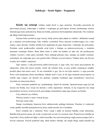 Infekcja – Scott Sigler - fragment Kiedy się ocknął, widelec nadal tkwił w jego ramieniu. Koszulka powróciła do pierwotnej pozycji, zahaczając o widelec i wyginając go pod kątem. Koniec kuchennego sztućca dotykał jego kości policzkowej. Rana nie bolała, ponieważ był kompletnie odrętwiały. Nie wiedział, jak długo leżał nieprzytomny. Grymas bólu zawitał na jego twarzy, kiedy prawą ręką złapał za widelec i delikatnie usunął go z mięśnia czworobocznego. Gdy widelec wychodził, Perry usłyszał wydobywający się z rany mokry, ssący dźwięk. Cienkie stróżki krwi popłynęły po jego obojczyku i wpłynęły mu pod pachę. Przednia część podkoszulka zmieniła swój kolor z białego na jaskrawoczerwony z cienkimi pasmami ciemnego fioletu. Rana kłuta sama w sobie nie byłaby aż taka zła, ale przekręcony widelec wyrwał z ciała spory kawałek. Perry dotknął palcami rany, starając się ustalić rozmiary uszkodzeń, nie włączając przy tym guzika bólu. Palcami wyczuł martwy Trójkąt, który nie był już twardy, lecz miękki i sprężysty. Jego szpony z całą pewnością nadal kotwiczyły w jego ciele, być może przyczepione do obojczyka, żebra lub nawet mostka. Jeżeli tak właśnie było, to przy próbie szarpnięcia mógłby przebić płuco lub nawet serce. To nie wchodziło w grę. Ale to coś było martwe i z tego powodu Perry czuł nieopisaną chorą satysfakcję. Jednak myśl o tym, że do jego ramienia przyczepione są zwłoki tego czegoś, nie dawała mu spokoju, szarpała resztkami jego normalności, kurczowo trzymała się umęczonej duszy. Perry ostrożnie podniósł się i podskakując, dotarł do łazienki. Sponiewierana noga już tak mocno nie bolała, lecz wciąż nie dawała o sobie zapomnieć. Szkoda, że tej rozgrywki nie mógł przesiedzieć na ławce rezerwowych, pozwalając zmiennikom zająć jego miejsce na boisku. Czas zabawić się z bólem. Wetrzyj ziemię w ranę i wracaj do gry. Poświęć swoje ciało. Smugi wyschniętej, brązowej krwi udekorowały podłogę linoleum. Pomimo iż większość wody opadła, kawałki pomarańczowej skóry nadal unosiły się w brodziku. Krew ściekała mu z ramienia. Perry wyjął z półki za lustrem butelkę wody utlenionej. Butelka była prawie pusta, ale wody wystarczyło na tyle, by oczyścić ranę. Postawiwszy butelkę na umywalce, Perry próbował zdjąć z siebie koszulkę, lecz powstrzymał go nagły przeszywający ból w lewym ramieniu. Powoli podniósł rękę. Była bardzo obolała, ale dzięki Bogu nadal potrafił nią poruszać. Używając tylko prawej ręki, niezgrabnie ściągnął z siebie przemoczoną krwią koszulkę, zrzucił ją na podłogę, a następnie kopniakiem posłał ją w róg, tam gdzie nie będzie musiał jej już oglądać. Perry marzył o prysznicu, jednak nie chciał czyścić brodzika, a pływające do wysokości kostki strupy przyprawiały go o mdłości. Musiał sobie jakoś poradzić. Spod umywalki wyciągnął czystą myjkę. Nie zamierzał używać niczego, co wcześniej dotykało strupów lub Upierdliwej Piątki. Z tym wyjątkiem, że teraz to już nie była przecież Upierdliwa Piątka. Na ustach Perry'ego pojawił się uśmiech zwycięstwa. Pozostała czwórka. Czwórka Jeźdźców. Czwórka Jeźdźców Apokalipsy. Uśmiech zniknął. Nowa nazwa wcale nie sprawiła, że czuł się lepiej. Głowa pulsowała jak umierająca gwiazda. Namoczył białą myjkę i spróbował zmyć zaschniętą krew z klatki piersiowej, żeber, ramienia oraz spod pachy. Przetarł również lekko ranę. Myjka w mgnieniu oka przybrała okropny odcień różu. Rana nie wyglądała aż tak strasznie, jednak Trójkąt wyglądał okropnie. Jego „twarz” była rozdarta, razem ze skórą, która go pokrywała. Na pierwszy rzut oka nie można było odróżnić kawałków ciała Trójkąta od jego własnego, ale po dokładniejszym przyjrzeniu się Perry dostrzegł, że tkanka tego czegoś była bledsza od jego własnej, miała szaro-różowy odcień przechodzący w biel. Z całą pewnością nie wyglądało to zdrowo. Perry uświadomił sobie, iż gdyby ktoś zadźgał go widelcem na śmierć, to on też nie wyglądałby zdrowo. Perry przepłukał ranę wodą utlenioną, z czego większość szybko spłynęła w dół po jego piersi, wsiąkając w spodnie i bieliznę. Była zimna. Nie przejmował się tym. Przemył syczącą ranę myjką. Zostały mu już tylko trzy plastry – w sam raz na opatrzenie rany. Chwycił za rozerwaną skórę tuż nad głową Trójkąta i okleił ranę plastrem. Białe, wsiąkliwe łatki natychmiast przybrały różowy kolor. To była powierzchowna rana, za minutę lub dwie krew powinna zakrzepnąć. Woń plastrów lekko podniosła go na duchu. Zapach przywoływał dziecięce wspomnienia. Kiedy był dzieckiem, to gdy się zadrapał lub przeciął, kiedy krwawił, jego mama zawsze przyklejała mu do rany plaster. Wówczas ból ustępował, a on mógł wrócić do zabawy. Chyba że jego ojciec chciał mu dać nauczkę za to, że płakał. Oznaki słabości nie były mile widziane w domu Dawseyów. Perry nie potrafił zliczyć, jak często dostawał lanie, poprzedzone ojcowskim „już ja ci się popłaczę”! Mimo bólu plastry dodały mu trochę pozytywnej energii. Uspokajający zapach sztucznego tworzywa wypełnił jego nozdrza. Poddając się kojącej mocy plastrów, Perry zorientował się nagle, że wokół panowała cisza. Nie tylko w jego mieszkaniu, lecz również w jego głowie. Nie słyszał niewyraźnego odgłosu, zgrzytania czy najmniejszych zakłóceń. Absolutna cisza. Nawet nie próbował sobie wmówić, że nie żyły. Nadal je w sobie wyczuwał. Czuł lekkie brzęczenie z tyłu czaszki. Nie były martwe, ale odczuwał coś dziwnego. Może one… spały. Jeżeli spały, to może mógł do kogoś zadzwonić? Wezwać gliny? Może FBI? Te małe skurczybyki przeraźliwie obawiały się ludzi w mundurach. Jednak w jakich mundurach,