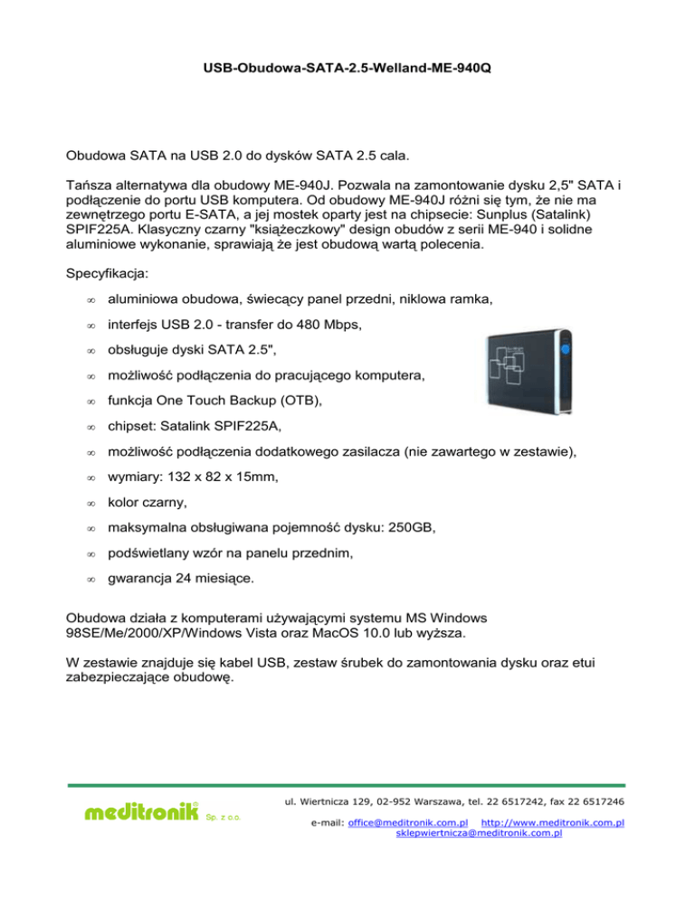 USB-Obudowa-SATA-2.5-Welland-ME-940Q Obudowa SATA na USB 2.0 do dysków SATA 2.5 cala. Tańsza alternatywa dla obudowy ME-940J. Pozwala na zamontowanie dysku 2,5" SATA i podłączenie do portu USB komputera. Od obudowy ME-940J róŜni się tym, Ŝe nie ma zewnętrzego portu E-SATA, a jej mostek oparty jest na chipsecie: Sunplus (Satalink) SPIF225A. Klasyczny czarny "ksiąŜeczkowy" design obudów z serii ME-940 i solidne aluminiowe wykonanie, sprawiają Ŝe jest obudową wartą polecenia. Specyfikacja: • aluminiowa obudowa, świecący panel przedni, niklowa ramka, • interfejs USB 2.0 - transfer do 480 Mbps, • obsługuje dyski SATA 2.5", • moŜliwość podłączenia do pracującego komputera, • funkcja One Touch Backup (OTB), • chipset: Satalink SPIF225A, • moŜliwość podłączenia dodatkowego zasilacza (nie zawartego w zestawie), • wymiary: 132 x 82 x 15mm, • kolor czarny, • maksymalna obsługiwana pojemność dysku: 250GB, • podświetlany wzór na panelu przednim, • gwarancja 24 miesiące. Obudowa działa z komputerami uŜywającymi systemu MS Windows 98SE/Me/2000/XP/Windows Vista oraz MacOS 10.0 lub wyŜsza. W zestawie znajduje się kabel USB, zestaw śrubek do zamontowania dysku oraz etui zabezpieczające obudowę. ul. Wiertnicza 129, 02-952 Warszawa, tel. 22 6517242, fax 22 6517246 e-mail: [email protected] http://www.meditronik.com.pl [email protected]