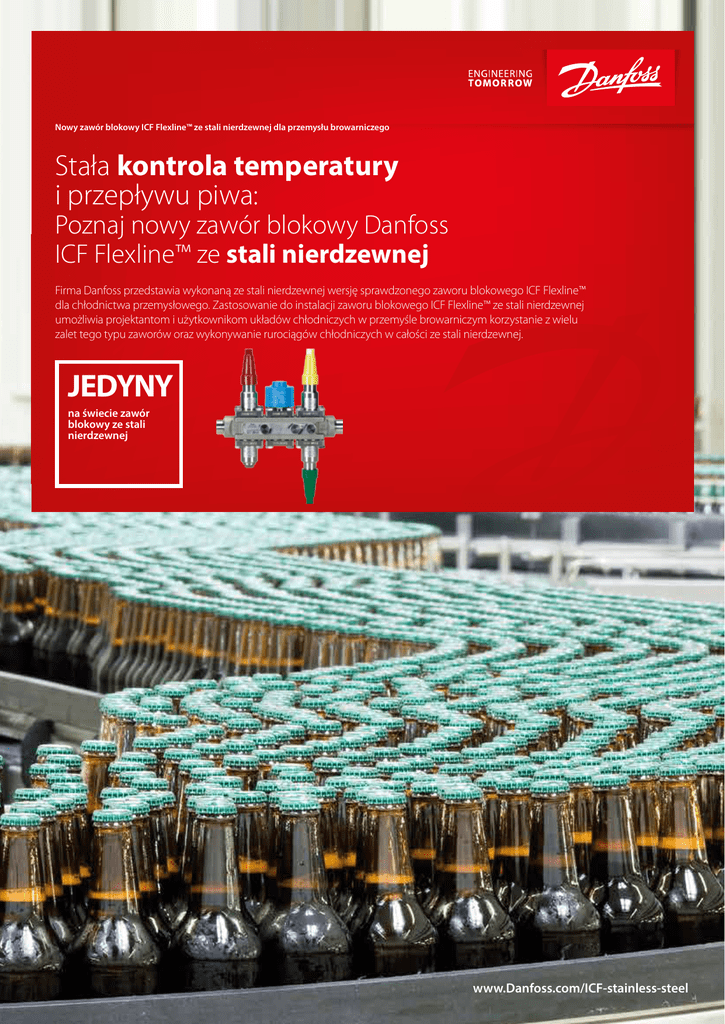 Nowy zawór blokowy ICF Flexline™ ze stali nierdzewnej dla przemysłu browarniczego Stała kontrola temperatury i przepływu piwa: Poznaj nowy zawór blokowy Danfoss ICF Flexline™ ze stali nierdzewnej Firma Danfoss przedstawia wykonaną ze stali nierdzewnej wersję sprawdzonego zaworu blokowego ICF Flexline™ dla chłodnictwa przemysłowego. Zastosowanie do instalacji zaworu blokowego ICF Flexline™ ze stali nierdzewnej umożliwia projektantom i użytkownikom układów chłodniczych w przemyśle browarniczym korzystanie z wielu zalet tego typu zaworów oraz wykonywanie rurociągów chłodniczych w całości ze stali nierdzewnej. JEDYNY na świecie zawór blokowy ze stali nierdzewnej www.Danfoss.com/ICF-stainless-steel Zawór blokowy Danfoss ICF Flexline™ ze stali nierdzewnej Korzyści dla użytkowników • Doskonale przystosowanie do pracy w instalacjach z CO2 • Niski całkowity koszt utrzymania • Precyzyjna regulacja temperatury zapewniająca optymalne bezpieczeństwo żywności • Zgodność z czynnikami chłodniczymi przyjaznymi dla środowiska, takimi jak CO2 • Mniejsza liczba spawów oznacza minimalizację ryzyka wycieków Korzyści dla wykonawców • Łatwa obsługa w ramach umów serwisowych • Jeden numer katalogowy ułatwia zamawianie i obsługę części zamiennych • Mniejsze wymagania dotyczące przestrzeni magazynowej • Lekka i zwarta konstrukcja • Mniejsza liczba spawów oznacza minimalizację ryzyka wycieków • Pełna swoboda projektowania układów DWA spawy zamiast sześciu lub więcej Wszystko w jednym miejscu • • • • • Wymagany jest tylko jeden dostawca wszystkich typów elementów Jedyny zawór blokowy ze stali nierdzewnej dostępny na rynku Innowacja rynkowego lidera w dziedzinie technologii chłodnictwa Pełna gama narzędzi wsparcia dostępna bezpłatnie Oparta na wypróbowanej i przetestowanej konstrukcji zaworu blokowego ICF ze stali nierdzewnej • Pełna zgodność ze wszystkimi komponentami firmy Danfoss wykonanymi ze stali nierdzewnej Pełny zakres produktów ze stali nierdzewnej do zastosowań w przemyśle browarniczym Magazyn słodu Śrutownik do słodu Selekcja i ważenie słodu Syrop chmielowy Odzysk ciepła Skrobia Słód Miedziana kadź zacierna Kadź zacierna Kocioł brzeczkowy Filtr zacieru Zbiornik z lejem wodnym Młóto We wszystkich procesach browarniczych regulacja temperatury ma kluczowe znaczenie dla zachowania jakości i higieny. Legenda Kierunek procesu Surowce/proces Dzięki swojemu doświadczeniu i fachowej wiedzy firma Danfoss może być kompetentnym i wiarygodnym partnerem dla browarów na całym świecie, a wprowadzenie zaworów blokowych ICF ze stali nierdzewnej sprawiło, że nasza oferta obejmuje wszystkie produkty niezbędne do budowy nowoczesnego układu chłodniczego wykonanego w całości ze stali nierdzewnej. Maszyny i urządzenia Zbiornik wyrównawczy na nadmiar drożdży Schładzacz drożdży Magazyn drożdży Odrzut drożdży Woda do warzenia Sedymen tator Schładzacz brzeczki Dodawanie drożdży Chłodnica wody odtlenionej Linia do leżakowania Zbiornik piwa jasnego Filtr Filtr Kadzie do wtórnej fermentacji (piwo leżakowe) Linia butelkująca Faza aerobowa, powietrze sterylne Schład zacz piwa Oferta produktów ze stali nierdzewnej umożliwia teraz zastosowanie bezpiecz nych czynników chłodniczych o wysokim ciśnieniu roboczym takich jak CO2 i amoniak, dzięki czemu linia produkcyjna jest bardziej przyjazna dla środowiska. Ten schemat przedstawia wybrane krytyczne procesy warzenia, w których produkty ze stali nierdzewnej firmy Danfoss umożliwiają uzyskanie wyższego poziomu bezpieczeństwa i czystości oraz znacznie większą energooszczędność. Odgazowywacz Kadzie fermentacyjne Piwo Woda odtleniona Schładzanie piwa Fermentacja Schładzanie brzeczki Zadrożdżowanie Woda odtleniona jest stosowana jako czynnik w procesie fermentacji i filtrowania. Jest również używana w procesach rozrzedzania, klarowania i płukania. Zastosowanie wody odtlenionej wymaga niezwykle precyzyjnej regulacji temperatury. Medium chłodzącym jest zwykle amoniak, CO2 lub glikol etylenowy. Po fermentacji piwo musi być przechowywane w dokładnie regulowanej temperaturze w celu zapewnienia dojrzewania i końcowej jakości produktu. Piwo musi zostać szybko schłodzone, zanim pozostanie na czas dojrzewania w butelce lub beczce. Medium chłodzącym jest zwykle amoniak, CO2 lub alkohol/woda. Precyzyjna fermentacja ma kluczowe znaczenie dla uzyskania żądanego smaku produktu i zawartości alkoholu — dokładna regulacja temperatury jest absolutnie konieczna. Medium chłodzącym jest zwykle amoniak, CO2 lub alkohol/woda. Jakość piwa zależy od dokładnego zadrożdżowania brzeczki. Aby zapewnić odpowiednią dystrybucję drożdży, gotująca się brzeczka musi zostać schłodzona bardzo szybko i bardzo precyzyjnie. Medium chłodzącym jest zwykle woda lodowa, amoniak lub CO2. Regulacja temperatury jest sprawą kluczową, gdy niezbędne jest prawidłowe zadrożdżowanie przed fermentacją. Medium chłodzącym jest zwykle amoniak lub CO2. Zawór regulacyjny REG-SA SS/REG-SB SS Seria SVL SS Flexline™: Seria SVL SS Flexline™ obejmuje wiele zaworów ze stali nierdzewnej składających się z jednego korpusu i wielu różnych elementów roboczych. Wszystkie elementy robocze mogą być zamontowane do jednego z dwóch typów korpusów (prosty lub kątowy), co pozwala na magazynowanie mniejszej liczby części zamiennych oraz szybkie i efektywne serwisowanie zaworów. Zawór regulacyjny Zakres produktów Zawór odcinający SVA-S SS SCA-X SS Zawór odcinająco-zwrotny Zawór zwrotny CHV-X SS Filtr FIA SS Nowy zawór blokowy Danfoss ICF Flexline™ ze stali nierdzewnej Zawory upustowe OFV-SS ze stali nierdzewnej Maks. ciśnienie robocze: 52 bar g (754 psig) Zakres temperatur: -60°C/+150°C (-76°F/+302°F). Jeden zawór o trzech funkcjach: zaworu upustowego, odcinającego i zwrotnego. Ciśnienierobocze do 52 bar. Z