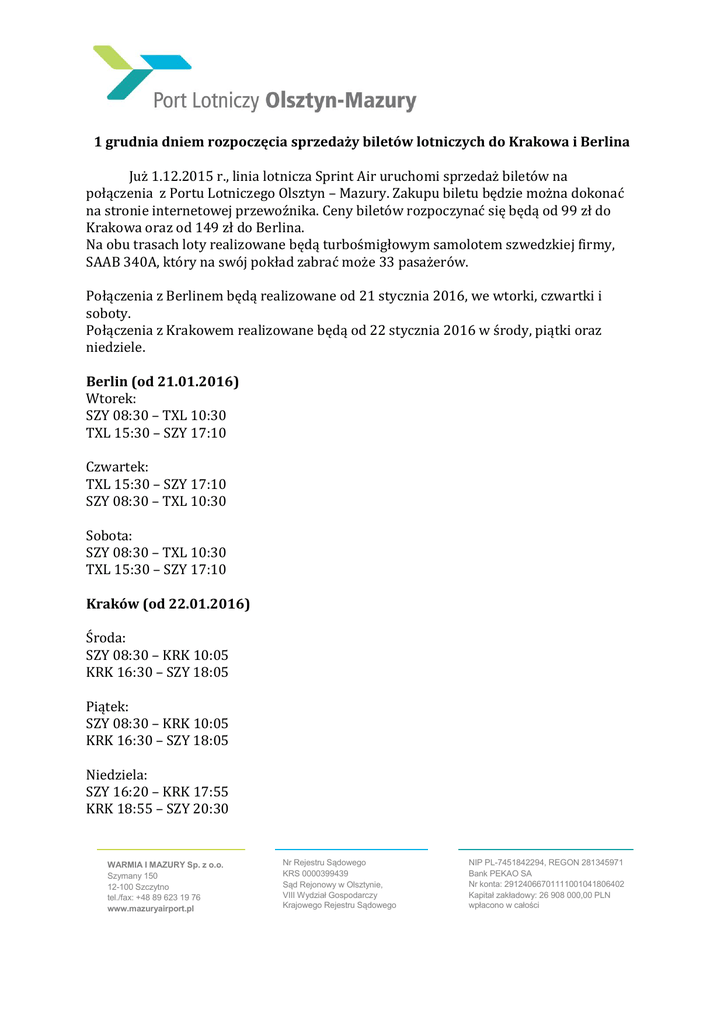 1 grudnia dniem rozpoczęcia sprzedaży biletów lotniczych do Krakowa i Berlina Już 1.12.2015 r., linia lotnicza Sprint Air uruchomi sprzedaż biletów na połączenia z Portu Lotniczego Olsztyn – Mazury. Zakupu biletu będzie można dokonać na stronie internetowej przewoźnika. Ceny biletów rozpoczynać się będą od 99 zł do Krakowa oraz od 149 zł do Berlina. Na obu trasach loty realizowane będą turbośmigłowym samolotem szwedzkiej firmy, SAAB 340A, który na swój pokład zabrać może 33 pasażerów. Połączenia z Berlinem będą realizowane od 21 stycznia 2016, we wtorki, czwartki i soboty. Połączenia z Krakowem realizowane będą od 22 stycznia 2016 w środy, piątki oraz niedziele. Berlin (od 21.01.2016) Wtorek: SZY 08:30 – TXL 10:30 TXL 15:30 – SZY 17:10 Czwartek: TXL 15:30 – SZY 17:10 SZY 08:30 – TXL 10:30 Sobota: SZY 08:30 – TXL 10:30 TXL 15:30 – SZY 17:10 Kraków (od 22.01.2016) Środa: SZY 08:30 – KRK 10:05 KRK 16:30 – SZY 18:05 Piątek: SZY 08:30 – KRK 10:05 KRK 16:30 – SZY 18:05 Niedziela: SZY 16:20 – KRK 17:55 KRK 18:55 – SZY 20:30 WARMIA I MAZURY Sp. z o.o. Szymany 150 12-100 Szczytno tel./fax: +48 89 623 19 76 www.mazuryairport.pl Nr Rejestru Sądowego KRS 0000399439 Sąd Rejonowy w Olsztynie, VIII Wydział Gospodarczy Krajowego Rejestru Sądowego NIP PL-7451842294, REGON 281345971 Bank PEKAO SA Nr konta: 29124066701111001041806402 Kapitał zakładowy: 26 908 000,00 PLN wpłacono w całości