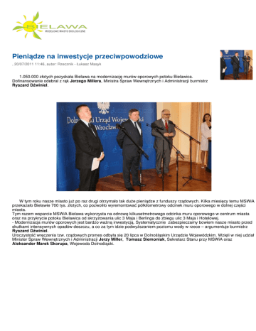 Pieniądze na inwestycje przeciwpowodziowe , 20/07/2011 11:46, autor: Rzecznik - Łukasz Masyk 1.050.000 złotych pozyskała Bielawa na modernizację murów oporowych potoku Bielawica. Dofinansowanie odebrał z rąk Jerzego Millera, Ministra Spraw Wewnętrznych i Administracji burmistrz Ryszard Dźwiniel. W tym roku nasze miasto już po raz drugi otrzymało tak duże pieniądze z funduszy rządowych. Kilka miesięcy temu MSWiA przekazało Bielawie 700 tys. złotych, co pozwoliło wyremontować półkilometrowy odcinek muru oporowego w dolnej części miasta. Tym razem wsparcie MSWiA Bielawa wykorzysta na odnowę kilkusetmetrowego odcinka muru oporowego w centrum miasta oraz na przykrycie potoku Bielawica od skrzyżowania ulic 3 Maja i Berlinga do zbiegu ulic 3 Maja i Hotelowej. - Modernizacja murów oporowych jest bardzo ważną inwestycją. Systematycznie zabezpieczamy bowiem nasze miasto przed skutkami intensywnych opadów deszczu, a co za tym idzie podwyższaniem poziomu wody w rzece – argumentuje burmistrz Ryszard Dźwiniel. Uroczystość wręczenia tzw. rządowych promes odbyła się 20 lipca w Dolnośląskim Urzędzie Wojewódzkim. Wzięli w niej udział Minister Spraw Wewnętrznych i Administracji Jerzy Miller, Tomasz Siemoniak, Sekretarz Stanu przy MSWiA oraz Aleksander Marek Skorupa, Wojewoda Dolnośląski. Przedstawiciele dolnośląskich gmin i powiatów otrzymali w sumie ponad 85 mln zł na modernizację infrastruktury, w tym na inwestycje przeciwpowodziowe. Beneficjentami było 65 jednostek samorządu terytorialnego z naszego województwa. Z powiatu dzierżoniowskiego wsparcie MSWiA oprócz Bielawy, otrzymały także sąsiednie Pieszyce. © 2010 Gmina Bielawa. Wszelkie prawa zastrzeżone. All rights reserved. Projekt: XOOOM