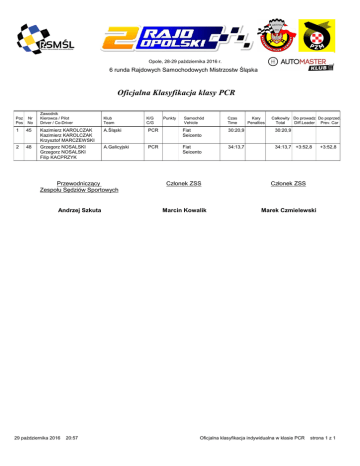 Opole, 28-29 października 2016 r. 6 runda Rajdowych Samochodowych Mistrzostw Śląska Oficjalna Klasyfikacja klasy PCR Poz Pos Nr No 1 45 2 48 Zawodnik Kierowca / Pilot Driver / Co-Driver Kazimierz KAROLCZAK Kazimierz KAROLCZAK Krzysztof MARCZEWSKI Grzegorz NOSALSKI Grzegorz NOSALSKI Filip KACPRZYK Klub Team K/G C/G Punkty Samochód Vehicle Czas Time Kary Penalties Całkowity Do prowadz Do poprzed. Total Diff.Leader Prev. Car A.Śląski PCR Fiat Seicento 30:20,9 30:20,9 A.Galicyjski PCR Fiat Seicento 34:13,7 34:13,7 +3:52,8 Przewodniczący Zespołu Sędziów Sportowych Członek ZSS Członek ZSS Andrzej Szkuta Marcin Kowalik Marek Czmielewski 29 października 2016 20:57 Oficjalna klasyfikacja indywidualna w klasie PCR +3:52,8 strona 1 z 1