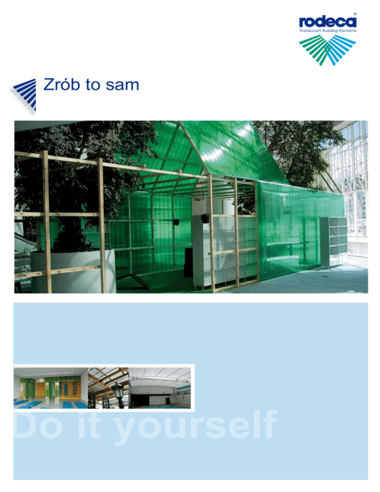 Zrób to sam Do it yourself Zrób to sam Płyty wielokomorowe Zrób to sam Zalety • Poliwęglan to bezbarwny, odporny na uderzenia termoplast • Temperatury stosowania od -40 do +115°C, chwilowo do 130°C • Niezmienna odporność na uderzenia w zakresie tych temperatur • Dobra trwałość dzięki warstwie anty UV • 10 lat gwarancji obejmującej żółknięcie, starzenie i odporność na gradobicie • przezroczysty z doskonałymi właściwościami termoizolacyjnymi Doświetla dachowe U-Panele Panele Dzięki zakończonej zamkiem typu pióro-wpust krawędzi panelu, możliwe jest stworzenie ściany lub pokrycia dachowego o dowolnych rozmiarach. Ten prosty i łatwy w montażu system jest idealny dla branży „Zrób to Sam”. 333 Panel Wsp. K [W/m2K]** Waga [ kg/m2 ] Szerokość [ mm ] Grubość [ mm ] 2333-16-4 ok. 2.1 ok. 2.4 333 +/- 1% 16 2333-20-4 ok. 2.0 ok. 2.6 333 +/- 1% 20 PC 2333-16-4 Kolory Standard: bezbarwny / opal Wersja Kolor: od 300 m² Zastosowania • • • • • • Elewacje i przeszklenia Ogrody zimowe Zadaszenia Pergole Wiaty garażowe Wewnątrz budynków: ścianki, działowe, zabudowa stoisk PC 2333-20-4 Kolory Standard: bezbarwny / opal Pióro i wpust Wersja Kolor: od 300 m² www.integartsystems.com.pl 11_12 RT-Thermolight Transparentne Elementy dla Budownictwa proszkowo w dowolnym kolorze RAL. Uszczelki systemowe z EPDM lub TPE. Okna Paneli wielofunkcyjne Akcesoria do panelu 16 mm PC 2333-16-4 / 2333-20-4 Przykład elementów systemu 1 PC 2333-16-4 / 2333-20-4 2 Kotwa 49401602 Akcesoria do paneli 16 i 20 mm Listwa dociskowa 492001 Uszczelka 902101 Zawsze należy zapoznać się z ogólnymi informacjami o systemie i z instrukcją montażu. Zrób to sam Płyty wielokomorowe Listwy końkove Zrób to sam Doświetla dachowe Panele Panele wielofunkcyjne są dostępne w grubości 3mm i 10mm. Oba można stosować na płaskie lub łukowe zadaszenia oraz na fasady. 250 Panel Wsp. K [W/m2K]** Waga [ kg/m2 ] Szerokość [ mm ] Grubość [ mm ] 2253-2 ok. 4.0 ok. 1.7 250 +/- 1% 3 2250-10-4 ok. 2.5 ok.2.2 250 +/- 1% 10 PC 2253-2 Kolory Standard: bezbarwny i srebrny Inne kolory: od 150 m² Zastosowania • • • • • • Elewacje i przeszklenia Ogrody zimowe Zadaszenia Pergole Wiaty garażowe Wewnątrz budynków: ścianki działowe, zabudowa stoisk U-Panele PC 2250-10-4 Kolory Standard: bezbarwny i opal Inne kolory: od 300 m² Tongue and groove joint www.integartsystems.com.pl 11_12 RT-Thermolight Transparentne Elementy dla Budownictwa Systemy PC 2253-2 1. PC 2253-2 4. Listwa zakończeniowa 395001 2. Uszczelka 902110 5. Kotwa 494003 PC 2250-10-4 7. Kotwa 494004 1. PC 2250-10-4 2. Uszczelka 902101 3. Listwa dociskowa 492001 5. Zaślepka 465010 8. Zaślepka 395006 9. Taśma? (Abklebung der Paneelenden) Zawsze należy zapoznać się z ogólnymi informacjami o systemie i z instrukcją montażu. Okna Paneli wielofunkcyjne Niemiecka jakość – Projektuj z Rodeca RODECA jest liderem innowacyjności i ma ponad 40letnie doświadczenie w produkcji transparentnych materiałów. Nasze wielokrotnie nagradzane transparentne materiały budowlane są Zaprojektuj z Rodeca elewację przyszłości. Integart Sp. z o.o. Błonie, ul. Maszynowa 1 55-330 Miękinia tel. +48 71 31 53 191 [email protected] www.integartbudownictwo.pl Transparentne Elementy dla Budownictwa RT-Thermolight Płyty wielokomorowe Doświetla dachowe Panele wielofunkcyjne Okna Zrób to Sam -