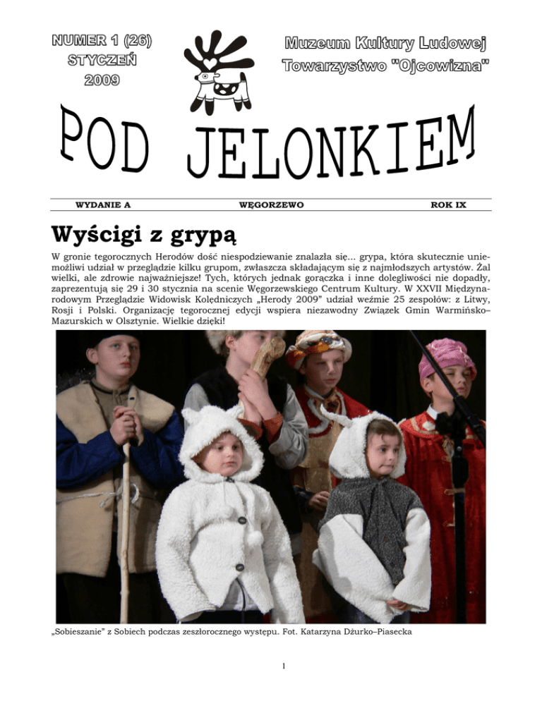 WYDANIE A WĘGORZEWO ROK IX Wyścigi z grypą W gronie tegorocznych Herodów dość niespodziewanie znalazła się... grypa, która skutecznie uniemoŜliwi udział w przeglądzie kilku grupom, zwłaszcza składającym się z najmłodszych artystów. śal wielki, ale zdrowie najwaŜniejsze! Tych, których jednak gorączka i inne dolegliwości nie dopadły, zaprezentują się 29 i 30 stycznia na scenie Węgorzewskiego Centrum Kultury. W XXVII Międzynarodowym Przeglądzie Widowisk Kolędniczych „Herody 2009” udział weźmie 25 zespołów: z Litwy, Rosji i Polski. Organizację tegorocznej edycji wspiera niezawodny Związek Gmin Warmińsko– Mazurskich w Olsztynie. Wielkie dzięki! „Sobieszanie” z Sobiech podczas zeszłorocznego występu. Fot. Katarzyna DŜurko–Piasecka 1 Maciek pare gołąbeczków takich jesce w pierzu Dej dary z tej miary dla Pana małego By nam dał po śmierci zbawienia wiecnego.” Hej kolęda, kolęda ! Współcześnie słowo kolęda rozumiane jest przez większość z nas jedynie jako religijna pieśń o BoŜym Narodzeniu. Śpiewa się ją w kościele, przy stole wigilijnym, na estradzie, w telewizji. Warto przy okazji kolejnego Przeglądu Widowisk Kolędniczych przypomnieć sobie inne, dawniejsze znaczenia słowa kolęda, a takŜe róŜne rodzaje pieśni określanych tą nazwą, a przy okazji zasygnalizować bogactwo zjawiska jakim było zimowe kolędowanie w polskiej kulturze ludowej. Odrębną grupę pieśni o BoŜym Narodzeniu stanowią ludowe kolędy apokryficzne. Pojawiają się w nich motywy stawiające w centrum Świętą Rodzinę, czyli np. motywy poszukiwania miejsca na nocleg, narodzin Jezusa, ucieczki do Egiptu. Obecna jest w tych pieśniach charakterystyczna dla folkloru i typowa w ludowych apokryfach obrazowość, nagromadzenie symboli (biały kamień, zielona lipeńka), baśniowość, cudowność (gdy np. Maryja z lodu krzesi ogień do ogrzania Pana Jezusa). Wyraz kolęda pochodzi od łacińskiego calendae, co według juliańskiego kalendarza oznaczało I dzień miesiąca. Styczniowe calendae, przypadające na początek nowego Roku, wiązały się ze zwyczajem wzajemnego obdarowywania, składania Ŝyczeń zapewniającym pomyślność. Zwyczaj ten ok. VI–VIII w. n.e. trafił do obrzędowości Słowian. Początkowo więc na gruncie polskim słowo kolęda oznaczało dar, podarunek (szczególnie noworoczny). W swoich opracowaniach dotyczących polskich kolęd ludowych Jan Adamowski wymienia wśród znaczeń tego wyrazu m.in.: 1. Dar dla kolędników, 2. Chodzenie z kolędą (kolędowanie czyli obrzędowe składanie Ŝyczeń), 3. Pieśń obrzędowa z prośbą o dary (od XVI w.), 4. Zadatek dawany na św. Szczepana (26 grudnia) dla godzonych na słuŜbę parobków, 5. Danina dla księdza pobierana w okresie BoŜego Narodzenia (współcześnie takŜe wizyta księdza w domu), 6. Mieszanina potraw wigilijnych z opłatkiem i chlebem dawana bydłu w święta, 7. W niektórych regionach okres BoŜego Narodzenia lub Wigilia, a w staropolszczyźnie takŜe Nowy Rok, 8. Garstka kłosów zboŜa przynoszona w dniu Wigilii przez gospodarza. JednakŜe najstarszą formą kolędy ludowej są pieśni Ŝyczące, związane z wymianą darów czyli z kolędowaniem. Utwory te funkcjonowały w kontekście całego obrzędu kolędniczego, którego początki upatrywać moŜna w archaicznych noworocznych obrzędach na urodzaj, oraz zapewniających pomyślność i płodność. Były to obrzędy „na dobry początek” nadchodzącego roku wegetacyjnego. W tradycji ludowej świętowanie BoŜego Narodzenia trwało aŜ do Trzech Króli, a cały cykl świąteczny nazywano Godami, Godnimi Świętami lub Szczodrymi Dniami, Dwunastnicą. Właśnie w te świąteczne dni przychodzili do domów kolędnicy. Były to kilkuosobowe grupy chłopców, młodych parobków, biednych czeladników i Ŝaków. Wchodząc do domu pozdrawiali gospodarzy, wyśpiewywali Ŝyczenia powodzenia i urodzaju (kolędy Ŝyczące), odgrywali określone scenki, a na koniec prosili o datek (kolędę). Najczęściej dostawali poŜywienie: pieczywo (np. bułki zwane „szczodraki”), kiełbasę, jabłka, orzechy, garść zboŜa, wódkę, rzadziej drobne monety. Kolędnicy dziękowali i chwalili gospodarzy, którzy wierzyli, Ŝe kolędnicy przynoszą szczęście gospodarstwu i jego mieszkańcom. Obok wspomnianego daru dla kolędników mamy tu takŜe dar od kolędników, którym jest właśnie śpiewane i recytowane słowo Ŝyczące, mające moc sprawczą. Słowo Ŝyczące – kolęda, kierowane jest do poszczególnych członków rodziny, a w szczególności do gospodarza, gospodyni, panien i kawalerów, stąd moŜemy je podzielić na kolędy gospodarskie, kolędy panieńskie i kolędy kawalerskie. Słowo Ŝyczące w kolędach gospodarskich ma sprawić dobry urodzaj w polu i przychówek w oborze. Oto fragment kolędy gospodarskiej z Warmii: „Panie gospodarzu, Pan Bóg ci wam szyrzy w waszym podwórzu wszystkie lury pocielili, złote bylki porodzili A te bylki majó złote rózki Kolędy jako pieśni religijne o BoŜym Narodzeniu upowszechniły się w Polsce w średniowieczu. Zwano je najczęściej kantykami, a ich zbiory kantyczkami. Jedna z najstarszych pieśni „Anioł pasterzom mówił” pochodzi z XV w., natomiast okresem rozkwitu tego typu utworów autorskich był wiek XVII i XVIII. Powstały wtedy np. kolędy: „W Ŝłobie leŜy” Piotra Skargi czy „Bóg się rodzi” Franciszka Karpińskiego. Odmianą kolęd o BoŜym Narodzeniu są pastorałki czyli utwory o motywach pasterskich. Części z nich ze względu na frywolny charakter nie zezwolono wykonywać w kościołach, wykonywano je w domach stąd nazywane są kolędami domowymi. Przykładem pastorałki religijnej jest „Bracia patrzcie jeno”, a oto przykład pastorałki domowej: „Kuba stary przyniósł dary masła na talerzu 2 byndziecie ich zaprzungać od Gód do naróŜki.” Współcześnie szczególnie popularną formą widowisk kolędniczyc