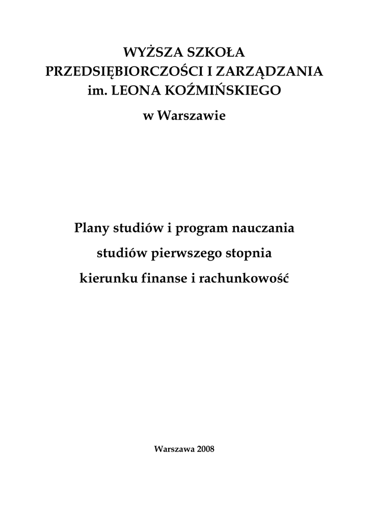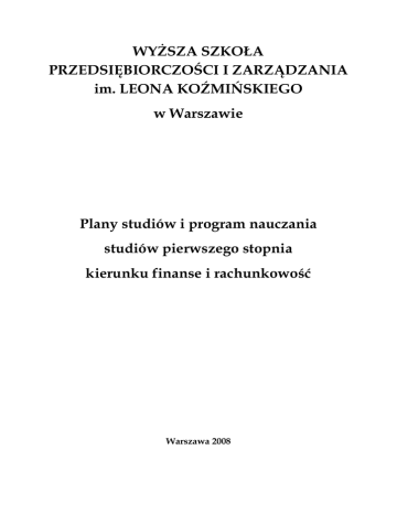 WYśSZA SZKOŁA PRZEDSIĘBIORCZOŚCI I ZARZĄDZANIA im. LEONA KOŹMIŃSKIEGO w Warszawie Plany studiów i program nauczania studiów pierwszego stopnia kierunku finanse i rachunkowość Warszawa 2008 SPIS TREŚCI 1. ZałoŜenia planów studiów i programu nauczania..…………..3 2. Sylwetka absolwenta……………………………………………...3 3. Konstrukcja planów studiów i programu nauczania…………5 4. Plany studiów………………………………………………………6 5. Programy nauczania……………………….…..…….………..….10 6. Punkty ECTS………………………………………………………38 Załącznik 1. Macierze kompetencji absolwentów i przedmiotów realizowanych na studiach pierwszego stopnia kierunku zarządzanie …………………………………………………………..43 2 1. ZAŁOśENIA PLANÓW STUDIÓW I PROGRAMU NAUCZANIA Cel podstawowy Celem studiów I stopnia na kierunku finanse i rachunkowość jest uzyskanie niezbędnej wiedzy z szeroko rozumianej rachunkowości i szeroko rozumianych finansów podmiotów, nie tylko gospodarczych, działających przede wszystkim, choć nie wyłącznie, w mikroskali, w Polsce i innych krajach, zwłaszcza naleŜących do Unii Europejskiej. Absolwent będzie znał zasady i standardy rachunkowości, zarówno krajowe, jak i międzynarodowe, będzie umiał księgować operacje gospodarcze, sporządzać sprawozdania finansowe, interpretować zawarte w nich kategorie finansowe, przeprowadzać krytyczną ich analizę, wyciągać z niej wnioski, projektować działania zmierzające do efektywniejszego funkcjonowania ocenianego podmiotu w przyszłości, identyfikować, mierzyć i zarządzać ryzykiem. Będzie znał zasady funkcjonowania instytucji i instrumentów występujących na rynkach finansowych w Polsce, UE i szeregu innych krajach.. Będzie rozumiał przyczyny oraz skutki zjawisk gospodarczych pojawiających się tak w skali mikro - jak teŜ makroekonomicznej. Będzie potrafił dokonać ich analizy, oceny i sformułować propozycje racjonalnych zachowań w obliczu tych zjawisk. Ogólne informacje o programie Program studiów finansów i rachunkowości I stopnia realizowany jest w Kolegium Zarządzania i Finansów. Program obejmuje podstawową wiedzę z zakresu ekonomii, rachunkowości, finansów , oraz szeregu innych dyscyplin, znajomość których jest niezbędna współczesnemu finansiście. Po jego ukończeniu student zostanie wyposaŜony w wiedzę pozwalającą na zrozumienie procesów biznesowych zachodzących nie tylko na poziomie lokalnym, ale takŜe na arenie europejskiej i światowej. WaŜną składową przyjętego procesu nauczania jest wyposaŜenie studentów w umiejętności praktycznego wykorzystania podstawowych narzędzi i instrumentów uŜywanych w rachunkowości i finansach do analizy kondycji finansowej i pozycji rynkowej róŜnych organizacji i ich otoczenia. W oparciu o pozyskaną w trakcie studiów wiedzę studenci będą potrafili przygotować biznes plan, ekspertyzę jak równieŜ projekt doradczy obejmujący identyfikację występujących problemów w organizacji wraz z zaproponowaniem dla nich rozwiązań. 2. SYLWETKA ABSOLWENTA Student kierunku finanse i rachunkowość w WSPiZ rozwija liczne, poszukiwane na rynkach pracy kompetencje, rozumiane jako dynamiczne powiązanie ogólnej i specjalistycznej wiedzy, zdolności jej rozumienia oraz konkretnych, profesjonalnych umiejętności: Ponadto jest wspierany w rozwoju prawidłowych postaw – tak, by wykorzystywał zdobytą wiedzę i umiejętności we właściwy sposób i w słusznych celach. 3 STUDIA PIERWSZEGO STOPNIA NA KIERUNKU FINANSE I RACHUNKOWOŚĆ KOMPETENCJE OGÓLNE Absolwent studiów pierwszego stopnia na kierunku finanse i rachunkowość w WSPiZ (na studiach realizowanych w języku polskim i angielskim): • Posiada nowoczesną wiedzę z zakresu finansów i rachunkowości oraz wybranych zagadnień z innych dziadzin (przede wszystkim ekonomii, prawa, matematyki, statystyki, ekonometrii i informatyki) budujących warsztat nowoczesnego finansisty. Rozumie najwaŜniejsze mechanizmy gospodarcze, na szczeblu mikro- i makroekonomicznym, oraz podstawowe prawidłowości funkcjonowania róŜnorodnych instytucji finansowych w warunkach gospodarki wolnorynkowej. • Potrafi znajdować materiały źródłowe z zakresu finansów i rachunkowości oraz inne niezbędne dane, rozumie je oraz potrafi wykorzystywać w przeprowadzanych, podstawowych analizach finansowych. • Jest przygotowany by, w oparciu o zdobytą wiedzę i umiejętności, rzetelnie wykonywać liczne szczegółowe zadania, z zakresu rachunkowości i finansów, a wszystko to przy pomocy bogatego zestawu specjalistycznych instrumentów oraz z wykorzystaniem zaawansowanych technik informatycznych. • Posiada umiejętność efektywnej pracy zespołowej. Potrafi przedstawiać i uzasadniać swoje opinie oraz prezentować efekty prowadzonych przez siebie analiz. Posługuje się językiem angielskim w stopniu zaawansowanym, równieŜ językiem specjalistycznym z zakresu finansów i rachunkowości. • Jest przedsiębiorczym i odpowiedzialnym obywatelem demokratycznego społeczeństwa, który dostrzega i uwzględnia związki podejmowanych decyzji i innych działań z istotnymi kwestiami etycznymi i społecznymi. Zdobyte kompetencje – czyli dynamiczne połączenie odpowiedniej wiedzy, zdolności jej rozumienia i określonych umiejętności – pozwalają absolwentowi studiów pierwszego stopnia na kierunku finanse i rachunkowość na obranie jednej z trzech podstawowych dróg: • Podjąć w kraju i za granicą (z racji zaawansowanej znajomości języka angielskiego) studia drugiego stopnia na kierunku finanse i rachunkowość bądź na kierunkach zbliŜonych – zarządzanie i ekonomia – dzięki posiadaniu wiedzy i umiejętności, w tym umiejętności uczenia się. • Prowadzić własną działalność gospodarczą – dzięki zdobyciu
