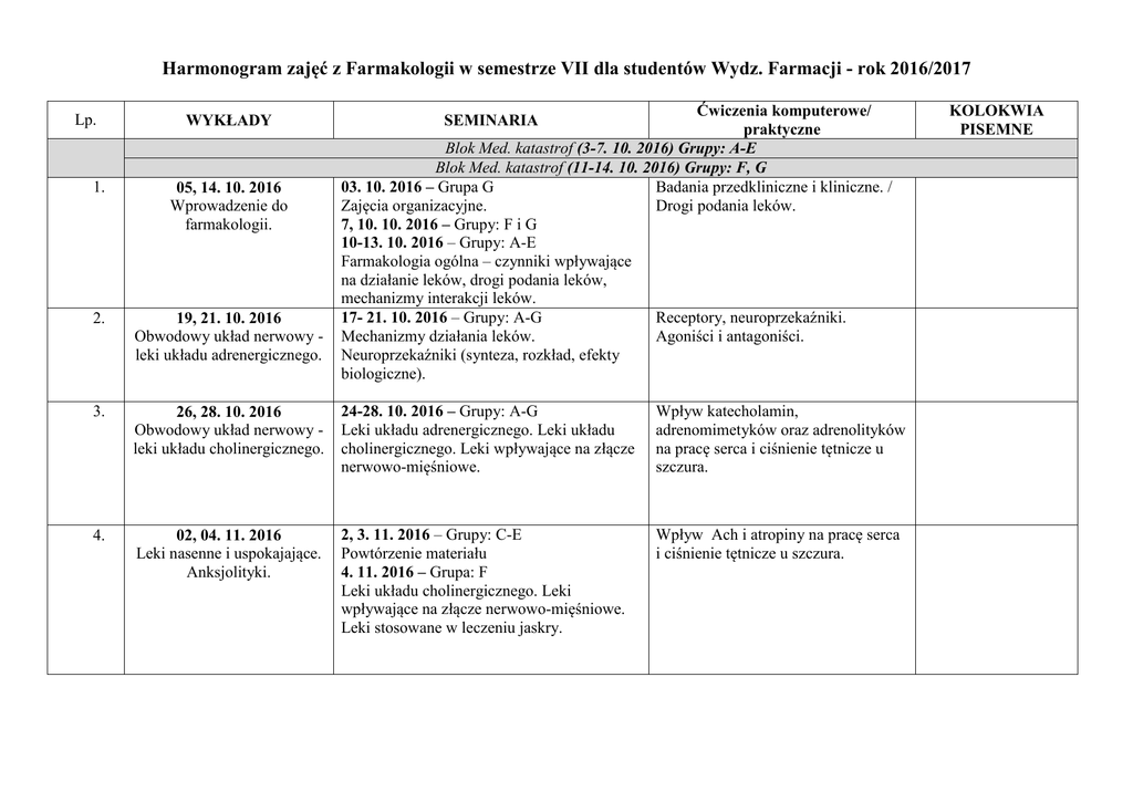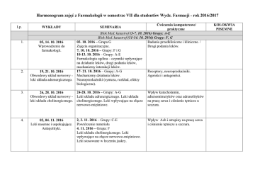 Harmonogram zajęć z Farmakologii w semestrze VII dla studentów Wydz. Farmacji - rok 2016/2017 Lp. WYKŁADY Ćwiczenia komputerowe/ praktyczne Blok Med. katastrof (3-7. 10. 2016) Grupy: A-E Blok Med. katastrof (11-14. 10. 2016) Grupy: F, G 03. 10. 2016 – Grupa G Badania przedkliniczne i kliniczne. / Zajęcia organizacyjne. Drogi podania leków. 7, 10. 10. 2016 – Grupy: F i G 10-13. 10. 2016 – Grupy: A-E Farmakologia ogólna – czynniki wpływające na działanie leków, drogi podania leków, mechanizmy interakcji leków. 17- 21. 10. 2016 – Grupy: A-G Receptory, neuroprzekaźniki. Mechanizmy działania leków. Agoniści i antagoniści. Neuroprzekaźniki (synteza, rozkład, efekty biologiczne). SEMINARIA 1. 05, 14. 10. 2016 Wprowadzenie do farmakologii. 2. 19, 21. 10. 2016 Obwodowy układ nerwowy leki układu adrenergicznego. 3. 26, 28. 10. 2016 Obwodowy układ nerwowy leki układu cholinergicznego. 24-28. 10. 2016 – Grupy: A-G Leki układu adrenergicznego. Leki układu cholinergicznego. Leki wpływające na złącze nerwowo-mięśniowe. Wpływ katecholamin, adrenomimetyków oraz adrenolityków na pracę serca i ciśnienie tętnicze u szczura. 4. 02, 04. 11. 2016 Leki nasenne i uspokajające. Anksjolityki. 2, 3. 11. 2016 – Grupy: C-E Powtórzenie materiału 4. 11. 2016 – Grupa: F Leki układu cholinergicznego. Leki wpływające na złącze nerwowo-mięśniowe. Leki stosowane w leczeniu jaskry. Wpływ Ach i atropiny na pracę serca i ciśnienie tętnicze u szczura. KOLOKWIA PISEMNE 7-10. 11. 2016 – Grupy: A- E i G Leki układu cholinergicznego. Leki wpływające na złącze nerwowo-mięśniowe. Leki stosowane w leczeniu jaskry. Wpływ Ach i atropiny na pracę serca i ciśnienie tętnicze u szczura. 16, 25. 11. 2016 Leki przeciwdepresyjne. Środki psychodysleptyczne. 14-18. 11. 2016 – Grupy: A-G Leki nasenne i uspokajające. Anksjolityki. Leki i substancje psychostymulujące. Leki nasenne. Anksjolityki. / Wpływ badanych związków na ruchliwość spontaniczną u myszy. 23. 11, 02. 12. 2016 Leki przeciwpadaczkowe. Leki stosowane w chorobie Parkinsona. 30. 11, 9. 12. 2016 Leki w chorobach neurodegeneracyjnych. Leki miejscowo – znieczul. 07, 16. 12. 2016 Narkotyczne leki przeciwbólowe. Uzależnienia i nadużywanie leków. 21-25. 11. 2016 – Grupy: A-G Neuroleptyki. Neuroleptyki / Katalepsja po haloperidolu. 28.11-02.12. 2016 – Grupy: A-G Leki przeciwdepresyjne. Leki normotymiczne. Leki przeciwdepresyjne/ Wpływ badanych związków na czas rezygnacji u myszy w teście Porsolta. 5-9. 12. 2016 – Grupy: A-G Leki stosowane w chorobach neurodegeneracyjnych. Leki nootropowe. Farmakoterapia stwardnienia rozsianego. Przechodzenie substancji do mózgu. 12-16. 12. 2016 – Grupy: A-G Leki przeciwdrgawkowe. Powtórzenie materiału z leków OUN. Badania nowych leków przeciwdrgawkowych/ Wpływ badanych związków na drgawki indukowane kardiazolem. 5. 09, 18. 11. 2016 Neuroleptyki. 6. 7. 8. 9. 10. 14. 12. 2016, 13. 01. 2017 Nienarkotyczne leki przeciwbólowe, przeciwzapalne i przeciwgorączkowe. 14-18. 11. 2016 I: Farmakologia ogólna, receptory, neuroprzekaźniki oraz obwodowy układ nerwowy. 21. 12. 2016, 20. 01. 2017 Leki przeciwhistaminowe. Alergia na leki. 04, 27. 01. 2017 Chemioterapia cz. I: β-laktamy, makrolidy, tetracykliny. 19-22. 12. 2016 – Grupy: A-E i G Narkotyczne leki przeciwbólowe. Leki znieczulenia ogólnego. Leki miejscowo – znieczulające. Leki miorelaksujące. 3-5. 01. 2017 – Grupy: B-E Powtórzenie materiału. Leki znieczulenia ogólnego. Leki miejscowo – znieczulające. Leki miorelaksujące. 13. 11. 01. 2017 Chemioterapia cz. II: Aminoglikozydy, linkozamidy, antybiotyki peptydowe 9-12. 01. 2017 – Grupy: A- E i G Działanie przeciwbólowe badanych Autakoidy. NLPZ. Leki stosowane w leczeniu związków (test „przeciągania się”). RZS i dny moczanowej. 13. 01. 2017 – Grupa F Narkotyczne leki przeciwbólowe. Leki znieczulenia ogólnego. Leki miejscowo – znieczulające. Leki miorelaksujące. 16-19. 01. 2017 – Grupy: A- E i G Leki przeciwhistaminowe. Leki przeciwleukotrienowe. Leki stosowane w leczeniu migreny. 20.01.2017 - Grupa F Autakoidy. NLPZ. Leki stosowane w leczeniu RZS i dny moczanowej. Leki przeciwhistaminowe. Leki przeciwleukotrienowe. Leki stosowane w leczeniu migreny. 13. 01. 2017 II: Ośrodkowy układ nerwowy. 14. 18. 01. 2017 Chemioterapia cz. III: pochodne nitrofuranu, sulfonamidy, nitroimidazole, chinolony, fluorochinolony 23-27. 01. 2017 – Grupy: A-G Antybiotyki cz. I: β-laktamy, makrolidy, ketolidy, tetracykliny, linkozamidy 23-27. 01. 2017 III: Leki stosowane w terapii bólu. Leki przeciwhistaminowe. Leki przeciwleukotrienowe. Leki miorelaksujące. Znieczulenie ogólne i 11. 12. 19-22. 12. 2016 II: Ośrodkowy układ nerwowy. Działanie przeciwbólowe badanych związków (test gorącej płytki). miejscowe. 15. 25. 01. 2017 Leki przeciwwirusowe. Leki przeciwgrzybicze.
