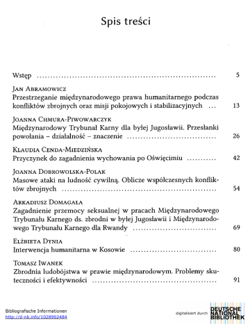 Spis treści Wstęp JAN ABRAMOWICZ Przestrzeganie międzynarodowego prawa humanitarnego podczas konfliktów zbrojnych oraz misji pokojowych i stabilizacyjnych ... JOANNA CHMURA-PIWOWARCZYK Międzynarodowy Trybunał Karny dla byłej Jugosławii. Przesłanki powołania - działalność - znaczenie KLAUDIA CENDA-MIEDZIŃSKA Przyczynek do zagadnienia wychowania po Oświęcimiu JOANNA DOBROWOLSKA-POLAK Masowe ataki na ludność cywilną. Oblicze współczesnych konflik tów zbrojnych ARKADIUSZ DOMAGAŁA Zagadnienie przemocy seksualnej w pracach Międzynarodowego Trybunału Karnego ds. zbrodni w byłej Jugosławii i Międzynarodo wego Trybunału Karnego dla Rwandy ELŻBIETA DYNIA Interwencja humanitarna w Kosowie TOMASZ IWANEK Zbrodnia ludobójstwa w prawie międzynarodowym. Problemy sku teczności i efektywności http://d-nb.info/1028902484 4 Spis treści MARCIN JASTRZĘBSKI Wolność od tortur, nieludzkiego albo poniżającego traktowania i ka rania w Polsce w świetle orzecznictwa strasburskiego 105 JOANNA MARKIEWICZ-STANNY Zastosowanie przymusu pracy i jego kwalifikacja prawna w między narodowym prawie humanitarnym 123 MICHAŁ MATYASIK Sprawiedliwość plemienna Gacaca w Ruandzie 139 MACIEJ MĄCZYŃSKI Totalitaryzm nazistowski a prawa człowieka 153 MARZENA MYŚLIŃSKA Granice obowiązywania prawa. Formuła Radbrucha 172 MARCIN PĄCZEK Prace nad zdefiniowaniem zbrodni agresji w związku z przyjęciem Statutu Międzynarodowego Trybunału Karnego 185 FILIP RADONIEWICZ Kryminalizacja handlu ludźmi na gruncie Kodeksu karnego z 1997 roku - wybrane zagadnienia 200 RENATA RUNIEWICZ-JASIŃSKA Handel ludźmi - współczesna zbrodnia przeciwko godności. Kazus europejskich szlaków handlowych 210 EWELINA SITARSKA Za milczącą zgodą. Refleksja nad konfliktem rosyjsko-czeczeńskim 228 WITOLD STAŃKOWSKI Szymon Wiesenthal - doświadczony przez II wojnę światową i nie dościgniony tropiciel hitlerowskich zbrodniarzy 240 AGNIESZKA WEDEŁ-DOMARADZKA Pochówek i cmentarze wojenne- uwagi na tle prawa międzynarodo wego 262 WIESŁAW WACŁAWCZYK Czytając Mein Kampf... Kilka uwag o retoryce nienawiści 276 KRZYSZTOF ŻARNA Geneza międzynarodowej odpowiedzialności karnej jednostki 292 Autorzy 312