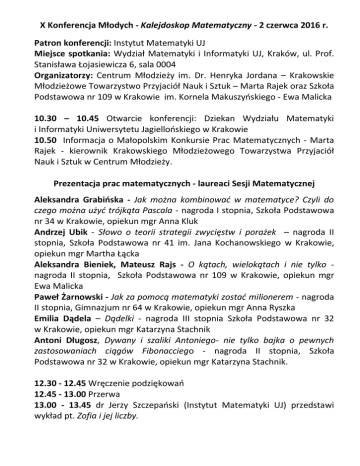 X Konferencja Młodych - Kalejdoskop Matematyczny - 2 czerwca 2016 r. Patron konferencji: Instytut Matematyki UJ Miejsce spotkania: Wydział Matematyki i Informatyki UJ, Kraków, ul. Prof. Stanisława Łojasiewicza 6, sala 0004 Organizatorzy: Centrum Młodzieży im. Dr. Henryka Jordana – Krakowskie Młodzieżowe Towarzystwo Przyjaciół Nauk i Sztuk – Marta Rajek oraz Szkoła Podstawowa nr 109 w Krakowie im. Kornela Makuszyńskiego - Ewa Malicka 10.30 – 10.45 Otwarcie konferencji: Dziekan Wydziału Matematyki i Informatyki Uniwersytetu Jagiellońskiego w Krakowie 10.50 Informacja o Małopolskim Konkursie Prac Matematycznych - Marta Rajek - kierownik Krakowskiego Młodzieżowego Towarzystwa Przyjaciół Nauk i Sztuk w Centrum Młodzieży. Prezentacja prac matematycznych - laureaci Sesji Matematycznej Aleksandra Grabińska - Jak można kombinować w matematyce? Czyli do czego można użyć trójkąta Pascala - nagroda I stopnia, Szkoła Podstawowa nr 34 w Krakowie, opiekun mgr Anna Kluk Andrzej Ubik - Słowo o teorii strategii zwycięstw i porażek – nagroda II stopnia, Szkoła Podstawowa nr 41 im. Jana Kochanowskiego w Krakowie, opiekun mgr Martha Łącka Aleksandra Bieniek, Mateusz Rajs - O kątach, wielokątach i nie tylko nagroda II stopnia, Szkoła Podstawowa nr 109 w Krakowie, opiekun mgr Ewa Malicka Paweł Żarnowski - Jak za pomocą matematyki zostać milionerem - nagroda II stopnia, Gimnazjum nr 64 w Krakowie, opiekun mgr Anna Ryszka Emilia Dądela – Dądelki - nagroda III stopnia Szkoła Podstawowa nr 32 w Krakowie, opiekun mgr Katarzyna Stachnik Antoni Długosz, Dywany i szaliki Antoniego- nie tylko bajka o pewnych zastosowaniach ciągów Fibonacciego - nagroda II stopnia, Szkoła Podstawowa nr 32 w Krakowie, opiekun mgr Katarzyna Stachnik. 12.30 - 12.45 Wręczenie podziękowań 12.45 - 13.00 Przerwa 13.00 - 13.45 dr Jerzy Szczepański (Instytut Matematyki UJ) przedstawi wykład pt. Zofia i jej liczby.