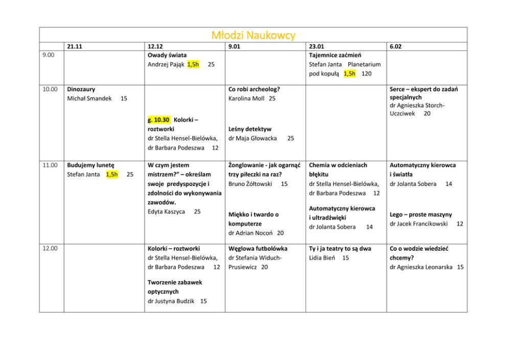 Młodzi Naukowcy 21.11 12.12 Owady świata Andrzej Pająk 1,5h 9.00 10.00 Dinozaury Michał Smandek 9.01 25 15 12.00 Budujemy lunetę Stefan Janta 1,5h 25 Leśny detektyw dr Maja Głowacka 25 W czym jestem mistrzem?” – określam swoje predyspozycje i zdolności do wykonywania zawodów. Edyta Kaszyca 25 Żonglowanie - jak ogarnąć trzy piłeczki na raz? Bruno Żółtowski 15 Kolorki – roztworki dr Stella Hensel-Bielówka, dr Barbara Podeszwa 12 Węglowa futbolówka dr Stefania WiduchPrusiewicz 20 Tworzenie zabawek optycznych dr Justyna Budzik 15 6.02 Serce – ekspert do zadań specjalnych dr Agnieszka StorchUczciwek 20 Co robi archeolog? Karolina Moll 25 g. 10.30 Kolorki – roztworki dr Stella Hensel-Bielówka, dr Barbara Podeszwa 12 11.00 23.01 Tajemnice zaćmień Stefan Janta Planetarium pod kopułą 1,5h 120 Miękko i twardo o komputerze dr Adrian Nocoń 20 Chemia w odcieniach błękitu dr Stella Hensel-Bielówka, dr Barbara Podeszwa 12 Automatyczny kierowca i ultradźwięki dr Jolanta Sobera 14 Ty i ja teatry to są dwa Lidia Bień 15 Automatyczny kierowca i światła dr Jolanta Sobera 14 Lego – proste maszyny dr Jacek Francikowski 12 Co o wodzie wiedzieć chcemy? dr Agnieszka Leonarska 15 13.00 Komety - archeologia kosmiczna dr Tomasz Rożek Gady świata Andrzej Pająk Misja Rosetta Katarzyna Drozd Po co czytać książki? prof. Ryszard Koziołek 14.00 Dlaczego mydło myje? dr Iwona Nowak 20 Możesz uratować czyjeś życie - podstawy pierwszej pomocy dr Krystyna BochenekKlimczyk 20 Chemia w odcieniach błękitu dr Stella Hensel-Bielówka, dr Barbara Podeszwa 12 Świadome odżywianie dr Bogdan Ogrodnik 25 Tangramy Sabina Celder-Dudek 20 Wyrażanie własnego zdania Halina Skrzecz 25
