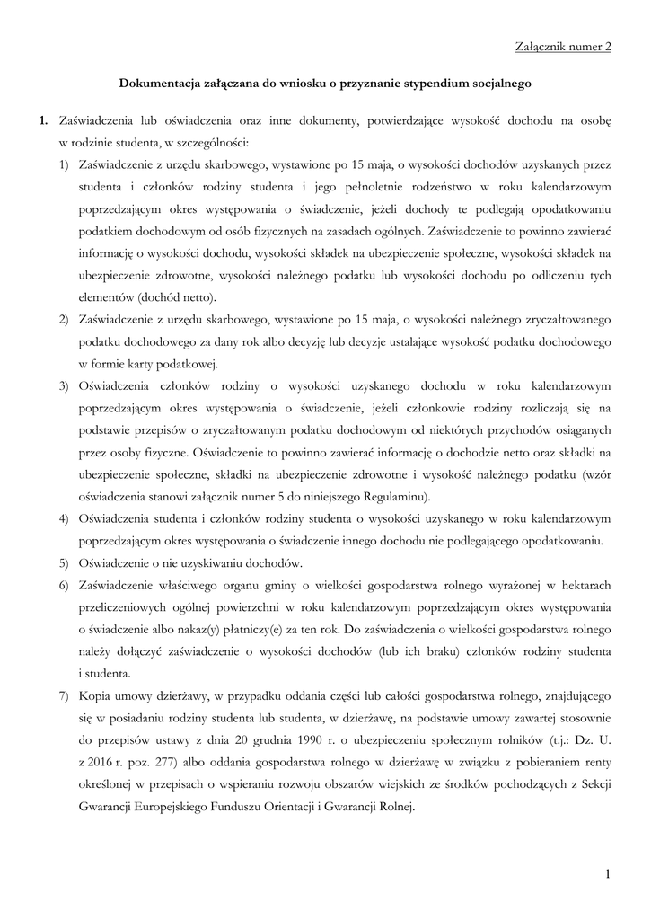 Załącznik numer 2 Dokumentacja załączana do wniosku o przyznanie stypendium socjalnego 1. Zaświadczenia lub oświadczenia oraz inne dokumenty, potwierdzające wysokość dochodu na osobę w rodzinie studenta, w szczególności: 1) Zaświadczenie z urzędu skarbowego, wystawione po 15 maja, o wysokości dochodów uzyskanych przez studenta i członków rodziny studenta i jego pełnoletnie rodzeństwo w roku kalendarzowym poprzedzającym okres występowania o świadczenie, jeżeli dochody te podlegają opodatkowaniu podatkiem dochodowym od osób fizycznych na zasadach ogólnych. Zaświadczenie to powinno zawierać informację o wysokości dochodu, wysokości składek na ubezpieczenie społeczne, wysokości składek na ubezpieczenie zdrowotne, wysokości należnego podatku lub wysokości dochodu po odliczeniu tych elementów (dochód netto). 2) Zaświadczenie z urzędu skarbowego, wystawione po 15 maja, o wysokości należnego zryczałtowanego podatku dochodowego za dany rok albo decyzję lub decyzje ustalające wysokość podatku dochodowego w formie karty podatkowej. 3) Oświadczenia członków rodziny o wysokości uzyskanego dochodu w roku kalendarzowym poprzedzającym okres występowania o świadczenie, jeżeli członkowie rodziny rozliczają się na podstawie przepisów o zryczałtowanym podatku dochodowym od niektórych przychodów osiąganych przez osoby fizyczne. Oświadczenie to powinno zawierać informację o dochodzie netto oraz składki na ubezpieczenie społeczne, składki na ubezpieczenie zdrowotne i wysokość należnego podatku (wzór oświadczenia stanowi załącznik numer 5 do niniejszego Regulaminu). 4) Oświadczenia studenta i członków rodziny studenta o wysokości uzyskanego w roku kalendarzowym poprzedzającym okres występowania o świadczenie innego dochodu nie podlegającego opodatkowaniu. 5) Oświadczenie o nie uzyskiwaniu dochodów. 6) Zaświadczenie właściwego organu gminy o wielkości gospodarstwa rolnego wyrażonej w hektarach przeliczeniowych ogólnej powierzchni w roku kalendarzowym poprzedzającym okres występowania o świadczenie albo nakaz(y) płatniczy(e) za ten rok. Do zaświadczenia o wielkości gospodarstwa rolnego należy dołączyć zaświadczenie o wysokości dochodów (lub ich braku) członków rodziny studenta i studenta. 7) Kopia umowy dzierżawy, w przypadku oddania części lub całości gospodarstwa rolnego, znajdującego się w posiadaniu rodziny studenta lub studenta, w dzierżawę, na podstawie umowy zawartej stosownie do przepisów ustawy z dnia 20 grudnia 1990 r. o ubezpieczeniu społecznym rolników (t.j.: Dz. U. z 2016 r. poz. 277) albo oddania gospodarstwa rolnego w dzierżawę w związku z pobieraniem renty określonej w przepisach o wspieraniu rozwoju obszarów wiejskich ze środków pochodzących z Sekcji Gwarancji Europejskiego Funduszu Orientacji i Gwarancji Rolnej. 1 8) Kopia umowy sprzedaży gospodarstwa rolnego lub jego części, jeżeli powierzchnia gospodarstwa uległa zmianie z tego tytułu w roku kalendarzowym poprzedzającym rok akademicki, w którym student ubiega się o świadczenia pomocy materialnej. 9) Kopia umowy zawartej w formie aktu notarialnego, w przypadku wniesienia gospodarstwa rolnego do użytkowania przez rolniczą spółdzielnię produkcyjną. 10) Kopia odpisu podlegającego wykonaniu orzeczenia sądu zasądzającego alimenty na rzecz osób w rodzinie lub poza rodziną lub odpis protokołu posiedzenia zawierającego treść ugody sądowej lub odpis zatwierdzonej przez sąd ugody zawartej przed mediatorem, zobowiązujących do alimentów na rzecz osób w rodzinie lub poza rodziną. 11) Przekazy lub przelewy pieniężne dokumentujące wysokość alimentów, jeżeli członkowie rodziny są zobowiązani wyrokiem sądu, ugodą sądową lub ugodą zawartą przed mediatorem do ich płacenia na rzecz osoby spoza rodziny. 12) W przypadku, gdy osoba uprawniona nie otrzymała alimentów albo otrzymała je w wysokości niższej od ustalonej w wyroku sądu, ugodzie sądowej lub ugodzie zawartej przed mediatorem: a) zaświadczenie organu prowadzącego postępowanie egzekucyjne o całkowitej lub częściowej bezskuteczności egzekucji alimentów, a także o wysokości wyegzekwowanych alimentów lub b) informację właściwego sądu lub właściwej instytucji o podjęciu przez osobę uprawnioną czynności związanych z wykonaniem tytułu wykonawczego za granicą albo o niepodjęciu tych czynności, w szczególności w związku z brakiem podstawy prawnej do ich podjęcia lub brakiem możliwości wskazania przez osobę uprawnioną miejsca zamieszkania dłużnika alimentacyjnego za granicą, jeżeli dłużnik zamieszkuje za granicą. 13) Zaświadczenie o wysokości ponoszonej opłaty za pobyt członka rodziny studenta, przebywającego w roku kalendarzowym poprzedzającym okres stypendialny, w instytucji zapewniającej całodobowe utrzymanie. 14) Dokument określający datę utraty dochodu oraz miesięczną wysokość utraconego dochodu przez studenta lub członka rodziny studenta. 15) Dokument określający wysokość dochodu uzyskanego przez członka rodziny oraz liczbę miesięcy, w których dochód ten był osiągany - dokument jest bezwzględnie wymagany, jeżeli liczba miesięcy uzyskiwanego dochodu w roku kalendarzowym poprzedzającym rok akademicki, w którym student ubiega się o świadczenia pomocy materialnej wynosiła mniej niż 12 miesięcy. 16) Dokument określający wysokość uzyskanego dochodu przez członka rodziny z miesiąca następującego po miesiącu, w którym dochód został osiągnięty - w przypadku uzyskania dochodu po roku kalendarzowym poprzedzającym rok akademicki, w którym student ubiega się o świadczenia pomocy materialnej. 17) Kopia odpisu zupełnego lub skróconego aktów zgonu rodziców lub kopia odpisu podlegającego wykonaniu orzeczenia sądu zasądzającego alimenty lub odpis protokołu posiedzenia zawierającego treść 2 ugody sądowej lub kopia odpisu zatwierdzonej przez 