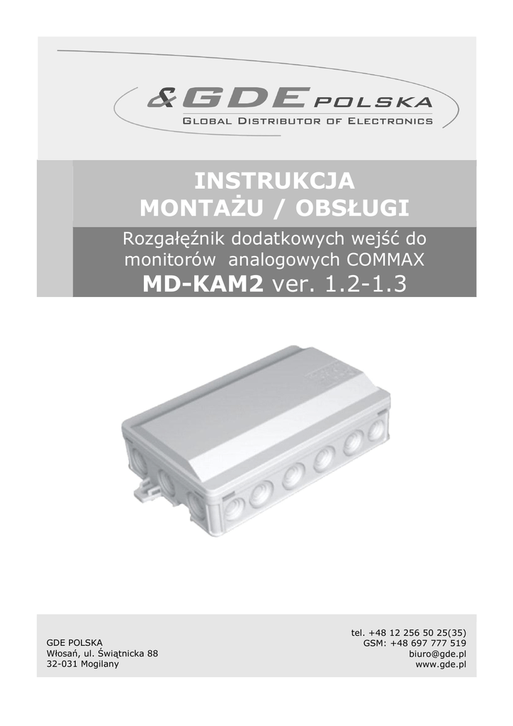 INSTRUKCJA MONTAŻU / OBSŁUGI Rozgałęźnik dodatkowych wejść do monitorów analogowych COMMAX MD-KAM2 ver. 1.2-1.3 GDE POLSKA Włosań, ul. Świątnicka 88 32-031 Mogilany tel. +48 12 256 50 25(35) GSM: +48 697 777 519 [email protected] www.gde.pl MD-KAM2 UWAGA! Niniejsza instrukcja powinna być przeczytana przed montażem. Moduł rozgałęźnika MD-KAM2 (2 wejścia/1 wyjście). Wygląd płytki i obudowy może odbiegać od zdjęcia poglądowego produktu (zależy od wersji). Przeznaczenie Moduł przekaźnikowy MD-KAM2 przeznaczony jest do stosowania w instalacjach niskonapięciowych. Moduły umożliwiają zwiększenie ilości obsługiwanych wejść przez monitory, bez dodatkowych przewodów (poza lokalnym zasilaniem modułów 12VDC). Współpracuje z wszystkimi modelami monitorów analogowych COMMAX oraz z wejściem analogowym monitorów systemu cyfrowego Gate View COMMAX, moduł działa prawidłowo z kamerami wideo domofonowymi COMMAX (4 żyłowe) jak i z kamerami CCTV służącymi tylko do podglądu (2 żyły). Współpracuje z systemem analogowym COMMAX co ogranicza jego możliwości na dużych odległościach. W typowych instalacjach odległości kamera-moduł-monitor nie powinny przekraczać 100m dla przewodów prostych 0,5mm (do przesyłania wideo zalecane okablowanie ekranowane). MD-KAM2 dostarczany jest w uniwersalnej obudowie-puszce elektrycznej natynkowej IP54 (zalecana gdy układ narażony jest na uszkodzenia typu zapylenie czy wilgoć itp., zalecany montaż wewnątrz pomieszczeń. Opis działania Aktualny stan modułu jest sygnalizowany przez stan dwóch diod LED (czerwona i zielona). -moduł zasilony i świeci dioda czerwona, oznacza to gotowość do wyświetlenia obrazu z wejścia 1 (czyli wywołanie podglądu z monitora wyświetli obraz z wejścia 1). Po zakończeniu podglądu/rozmowy moduł przełączy się na wejście 2. -moduł zasilony i świeci dioda zielona, oznacza to gotowość do wyświetlenia obrazu z wejścia 2 (czyli wywołanie podglądu z monitora wyświetli obraz z wejścia 2). Po zakończeniu podglądu/rozmowy moduł przełączy się na wejście 1. W trybie czuwania dioda, która świeci kolorem czerwonym oznacza ostatnio aktywne wejście, to wejście będzie też dostępne do podglądu od strony monitora. Ilość modułów można zwiększyć stosując odpowiednie połączenie (jak na schematach poniżej). Zasilanie modułu a) Zalecane zasilanie z zasilacza RF-1A (jeden zasilacz może zasilać kilka modułów). Napięcie na zaciskach modułu nie może być poniżej 11,8VDC. b) Moduły są przewidziane do pracy w systemie analogowym COMMAX, którego orientacyjne odległości nie powinny przekraczać 100m dla 4x0,5mm i 150m dla 4x0,8mm (więcej w instrukcjach obsługi kamer i monitorów) Uwagi - problemy z działaniem: Do prawidłowej pracy moduł potrzebuje napięcia zasilania 12VDC (diody w module nie sygnalizują obecności napięcia zasilania tylko stan aktualny wejść). Brak świecenia jakiejkolwiek diody nie musi być oznaką usterki, po upewnieniu się, że napięcie zasilające moduł jest prawidłowe wystarczy wywołać podgląd lub nacisnąć przycisk na panelu wejściowym (co powoduje uaktywnienie losowej kamery i rozpoczęcie pracy). Podłączenie W zależności od potrzeb klienta i wymogów dalszej rozbudowy przykłady połączeń wraz z opisami jak będzie działać przycisk podglądu poniżej: -2- MD-KAM2 Rys 1. Opis wyprowadzeń sygnalizacja wejścia 2 MD-KAM2 v.1_2 MD-KAM2 v.1_3 Masa Audio wyjście Audio Masa Video +12V Masa Audio wejście 1 Video +12V Masa Audio wyjście +12V +12V Masa Masa +12V Masa Audio Video +12V Masa Audio +12V Video +12V wejście 2 Video Video wejście 2 sygnalizacja wejścia 1 sygnalizacja wejścia 2 wejście 1 sygnalizacja wejścia 1 Rys 2. Przykład podłączenia (dla każdej wersji płytki układu idea działania jest ta sama). sygnal izacja wejścia 2 2 MD-KAM2 zasilacz RF-1A wejście 2 sygnal izacja wejścia 1 4 K2 DRC-4xx wejście 1 wyjście 4 4 K1 DRC-4xx CDV-xxx Podgląd od strony monitora, kolejne naciśnięcie przycisku podglądu VIDE O K1 bra k vid eo wyłączony VIDE O K2 bra k vid eo wyłączony Podgląd od strony monitora, kolejne naciśnięcie przycisku podglądu (wyłączone gniazdo kamery 2 w monitorze, opcja w wybranych monitorach, patrz instrukcje monitorów) VIDE O K1 wyłączony VIDE O K2 -3- wyłączony MD-KAM2 Rys 3. Przykład podłączenia sygna liza cja wej ścia 1 w ejści e 2 2 MD-KAM2 zasil acz RF-1A wyjście K2 sygna liza cja wej ścia 2 WBL -11S (lu b inn a CC TV PAL) 2 wej ście 1 2 4 K1 WBL -11S (lu b inn a CC TV PAL) 2 CD V-xxx Podgląd od strony monitora, kolejne naciśnięcie przycisku podglądu VID EO K 1 b rak vi de o w yłą czon y VID EO K 2 b rak vi de o w yłą czon y Podgląd od strony monitora, kolejne naciśnięcie przycisku podglądu (wyłączone gniazdo kamery 2 w monitorze , opcja w wybranych monitorach, patrz instrukcje monitorów) VID EO K 1 w yłą czon y VID EO K 2 wył ączo ny -4- MD-KAM2 Rys 4 Przykład podłączenia sygna liza cja wej ścia 1 sygna liza cja wej ścia 2 w ejści e 2 2 MD-KAM2 zasil acz RF-1A wyjście K3 2 2 wej ście 1 4 2 K2 WBL -11S (lu b inn a CC TV PAL) 4 2 K1 DR C-4xx CDV-xxx zasil acz RF-1A Podgląd od strony monitora, kolejne naciśnięcie przycisku podglądu VID EO K 1 VID EO K 2 w yłą czon y VID EO K 1 -5- VID EO K 3 w yłą czon y MD-KAM2 Rys 5 Przykład podłączenia zasi lacz RF-1A sygna liza cj a wej ścia 2 wej ście 1 MD-KAM2 sygna liza cj a wej ścia 1 wyjście 2 2 brak video VIDEO K2 wyłączony wyłączony VIDEO K3 K2 4 2 DR C-4xx 4 VIDEO K3 wyłączony sygna liza cj a wej ścia 1 sygna liza cj a wej ścia 2 4 DR C-4xx VIDEO K1 K1 wyłączony VIDEO K2 wej ście 2 wyłączony 4 wej ście 1 MD-KAM2 wyjście 4 CDV-xxx brak video VIDEO K1 -6- K3 WBL-11S (l ub inn a CCTV PAL) zasi lacz RF-1A VIDEO K1 wyłączony VIDEO K1 2.Podgląd od strony monitora, kolejne naciśnięcie przycisku podglądu (Gdy jest wyłączone gniazdo kamery 