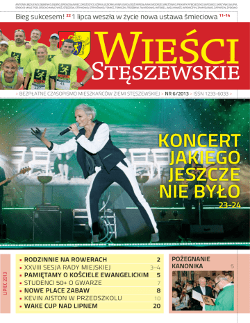 ANTONIN, BĘDLEWO, DĘBIENKO, DĘBNO, DROGOSŁAWIEC, DROŻDŻYCE, GÓRKA, JEZIORKI, KRĄPLEWO, ŁÓDŹ, MIROSŁAWKI, MODRZE, SMĘTÓWKO, PIEKARY, RYBOJEDZKO, SAPOWICE, SKRZYNKI, SŁUPIA, SROCKO MAŁE PGR, SROCKO MAŁE WIEŚ, STĘSZEW, STRYKOWO, STRYKÓWKO, TOMICE, TOMICZKI, TRZEBAW, TWARDOWO, WITOBEL, WIELKAWIEŚ, WRONCZYN, ZAMYSŁOWO, ZAPARCIN, ŻYDOWO Bieg sukcesem! 22 1 lipca weszła w życie nowa ustawa śmieciowa 11-14 > BEZPŁATNE CZASOPISMO MIESZKAŃCÓW ZIEMI STĘSZEWSKIEJ > NR 6/2013 > ISSN 1233-6033 > KONCERT JAKIEGO JESZCZE NIE BYŁO LIPIEC 2013 23-24 • RODZINNIE NA ROWERACH 2 • XXVIII SESJA RADY MIEJSKIEJ 3–4 • PAMIĘTAMY O KOŚCIELE EWANGELICKIM 5 • STUDENCI 50+ O GWARZE 7 • NOWE PLACE ZABAW 8 • KEVIN AISTON W PRZEDSZKOLU 10 • WAKE CUP NAD LIPNEM 20 POŻEGNANIE KANONIKA 5 2 TURYSTYKA Rodzinnie na rowerach 2 czerwca odbył się Rodzinny Rajd Rowerowy do Jezior. Organizatorem jego był burmistrz gminy Stęszew czestnicy rajdu wyruszyli o godzinie 10 ze Stacji Turystycznej w Stęszewie ul. Poznańską, Mosińską, następnie wzdłuż Jeziora Witobelskiego, przez Górkę do Siedziby WPN–u w Jeziorach. Tam czekało na rowerzystów wiele atrakcji, m.in. NR 6 / 2013 LIPIEC 2013 U pieczenie kiełbasek przy ognisku oraz wizyta w muzeum przyrodniczym. Nie brakowało również atrakcji dla dzieci, jak np. malowanie twarzy, modelowanie balonów, łowienie rybek czy też kręcenie talerzy. Po krótkim odpoczynku i dobrej zaba- wie rowerzyści wrócili do Stęszewa. Ponad 120 uczestników niedzielnego rajdu miało do pokonania łącznie ok. 25 km. Pomimo iż trasa rajdu nie należała do najłatwiejszych, kolarze z niecierpliwością oczekują już na kolejny stęszewski rajd. RED Z OBRAD SESJI 3 XXVIII Sesja Rady Miejskiej Gminy Stęszew Podczas XXVIII Sesji, Rada Miejska Gminy Stęszew udzieliła burmistrzowi Włodzimierzowi Pinczakowi absolutorium z tytułu wykonania budżetu 5 w Szachach. Gmina ma silną grupę szachistów, która ściągnęła na te mistrzostwa graczy z ościennych miejscowości. Burmistrz poinformował, że w minionym czasie odbył się mecz KS Lipno Stęszew z KS Dyskobolia Grodzisk Wlkp., podczas którego grodziscy „kibice” zachowywali się w nienależyty sposób. W sprawie meczu odbyły się liczne spotkania z władzami klubu oraz komendantem policji. Włodarz gminy podziękował komendantowi policji w Stęszewie za szybką i skuteczną interwencję podczas tego meczu, wyjaśnił również, że on jako burmistrz nie ma żadnych możliwości prawnych ani fizycznych, by reagować podczas organizacji meczu o podwyższonym ryzyku. Jest mi niezmiernie przykro, że stęszewski klub tego nie rozumie i gra nie fair mówiąc, że burmistrz celowo nie pomógł – tłumaczył włodarz gminy. W ostatnim czasie na dość uczęszczanej drodze, w samo południe zginęły włazy od studzienek kanalizacyjnych, co stanowi bardzo duże zagrożenie dla samochodów i pieszych. Ustalono już sprawców kradzieży dzięki współpracy wykonawcy robót z policją. Gospodarz gminy uczulił, aby w tego typu sytuacjach spisywać numery pojazdów, zainteresować się sprawą, bo to nie tylko wartość złomu, czy włazów, ale czasami jest to zdrowie i życie ludzkie. Na zakończenie sprawozdania, burmistrz odniósł się do spraw odpadowych. Poinformował, że 1 lipca br. wejdzie w życie nowa ustawa. Jesteśmy po przetargu, została wybrana firma, która będzie odbierać od nas odpady. Postawiono bardzo niską cenę, w związku z tym mogą pojawić się problemy z jakością świadczonych usług. Jednakże przetarg został ogłoszony na pół roku, wobec tego po tym okresie będzie ewentualnie możliwość zmiany operatora, również w drodze przetargu. Analizując sytuację na terenie Związku Selekt można zaobserwować, że nastąpił podział rynku wśród kilku największych operatorów śmieciowych. Małe czy też gminne spółki tych przetargów nie wygrały. Zaproponowane ceny są tak rażąco niskie, że nie pokrywają kosztów, które są wyliczane czy to w związku, czy to w gminach, czy w zakładach komunalnych. Pozostało nam LIPIEC 2013 regionu WPN i Centrum Zagospodarowania Odpadów Selekt. Wtedy też odbyły się przetargi na wybór firmy odbierającej odpady. Nowy system gospodarowania odpadami zaczął obwiązywać od 1 lipca br. Terminy przetargów są bardzo długie, ze względu na to, że są to przetargi unijne. Powoduje to szereg uciążliwości. Jeśli chodzi o sektor, w którym jest gmina Stęszew, przetarg został rozstrzygnięty. Wygrała go firma TEW z Kiełcza. 18 maja na plaży strykowskiej odbyła się impreza z okazji Dnia Samorządowca dla wszystkich mieszkańców gminy, połączona z otwarciem sezonu ośrodka Feniks w Strykowie. 22 maja w Tomiczkach mieszkańcy gminy Stęszew świętowali Dzień Matki i Ojca, podczas którego zespół „Wesoła Gromada” obchodził 20–lecie pracy artystycznej. 10 maja w Słupi odbyła się uroczysta msza podczas której poświęcono sztandar Kółka Rolniczego w Słupi. Po mszy, wszyscy członkowie gminnych kółek rolniczych spotkali się z posłem do Parlamentu Europejskiego – Andrzejem Grzybem. W maju zorganizowano również dwa rajdy rowerowe do źródełka w Żarnowcu oraz siedziby WPN-u do Jezior, które cieszyły się dużą frekwencją. Miniony okres to czas wielu jubileuszy m.in. z okazji 550–lecia kościoła i parafii Tomice. 25 maja odbyła się kolejna edycja ogólnopolskiej akcji Cała Polska Biega. Wzięli w niej udział uczniowie naszych gminnych szkół, a także dorośli z całego terenu gminy – mówił burmistrz. Tego samego dnia odbyło się także Walne Zgromadzenie Związku Emerytów, Rencistów i Inwalidów. Podczas zgromadzenia Janusz Minkisiewicz wieloletni prezes koła, zrezygnował z pełnienia funkcji. Nowym prezesem został wybrany Jerzy Pieszak. 2 czerwca w Drożdżycach otwarto teren rekreacyjny, który był przygotowywany przez mieszkańców tej miejscowości