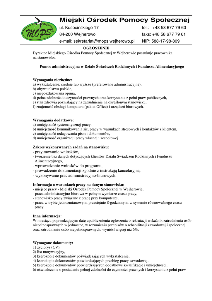 Miejski Ośrodek Pomocy Społecznej ul. Kusocińskiego 17 tel.: +48 58 677 79 60 84-200 Wejherowo faks: +48 58 677 79 61 e-mail: [email protected] NIP: 588-17-98-809 OGŁOSZENIE Dyrektor Miejskiego Ośrodka Pomocy Społecznej w Wejherowie poszukuje pracownika na stanowisko: Pomoc administracyjna w Dziale Świadczeń Rodzinnych i Funduszu Alimentacyjnego Wymagania niezbędne: a) wykształcenie: średnie lub wyższe (preferowane administracyjne), b) obywatelstwo polskie, c) nieposzlakowana opinia, d) pełna zdolność do czynności prawnych oraz korzystanie z pełni praw publicznych, e) stan zdrowia pozwalający na zatrudnienie na określonym stanowisku, f) znajomość obsługi komputera (pakiet Office) i urządzeń biurowych. Wymagania dodatkowe: a) umiejętność systematycznej pracy, b) umiejętność komunikowania się, pracy w warunkach stresowych i kontaktów z klientem, c) umiejętność redagowania pism i dokumentów, d) umiejętność organizacji pracy własnej i zespołowej. Zakres wykonywanych zadań na stanowisku: - przyjmowanie wniosków, - tworzenie baz danych dotyczących klientów Działu Świadczeń Rodzinnych i Funduszu Alimentacyjnego, - wprowadzanie wniosków do programu, - prowadzenie dokumentacji zgodnie z instrukcją kancelaryjną, - wykonywanie prac administracyjno-biurowych. Informacja o warunkach pracy na danym stanowisku: - miejsce pracy - Miejski Ośrodek Pomocy Społecznej w Wejherowie, - praca administracyjno-biurowa w pełnym wymiarze czasu pracy, - stanowisko pracy związane z pracą przy komputerze, - praca w trybie jednozmianowym, przeciętnie 8-godzinnym, w systemie równoważnego czasu pracy. Inna informacja: W miesiącu poprzedzającym datę upublicznienia ogłoszenia o rekrutacji wskaźnik zatrudnienia osób niepełnosprawnych w jednostce, w rozumieniu przepisów o rehabilitacji zawodowej i społecznej oraz zatrudnianiu osób niepełnosprawnych, wyniósł więcej niż 6%. Wymagane dokumenty: 1) życiorys (CV), 2) list motywacyjny, 3) kserokopie dokumentów poświadczających wykształcenie, 4) kserokopie dokumentów potwierdzających przebieg pracy zawodowej, 5) kserokopie dokumentów potwierdzających dodatkowe kwalifikacje i umiejętności, 6) oświadczenie o posiadaniu pełnej zdolności do czynności prawnych i korzystaniu z pełni praw publicznych, 7) oświadczenie o braku przeciwwskazań zdrowotnych do pracy na stanowisku, 8) referencje (opinie) z dotychczasowych miejsc pracy (jeśli kandydat posiada), 9) kserokopia dowodu osobistego, 10) kwestionariusz osobowy dla osoby ubiegającej się o zatrudnienie. Przewidywany termin zawarcia umowy o pracę – 16.09.2014 r. Wymiar czasu pracy: pełny etat. Przewidywany okres zatrudnienia do 31.12.2014 r. Wymagane dokumenty należy składać osobiście w sekretariacie MOPS w Wejherowie lub pocztą na adres Miejskiego Ośrodka Pomocy Społecznej w Wejherowie, ul. Kusocińskiego 17 84-200 Wejherowo, z dopiskiem „Pomoc administracyjna” w terminie do dnia 12.09.2014 r. Aplikacje, które wpłyną do Ośrodka po wyżej określonym terminie nie będą rozpatrywane. Dokumenty kandydatów będą przechowywane w Dziale Administracyjnym Ośrodka przez okres przewidziany w Instrukcji kancelaryjnej. W okresie tym, kandydaci będą mogli dokonywać odbioru swoich dokumentów. Miejski Ośrodek Pomocy Społecznej nie odsyła dokumentów kandydatom. Po upływie okresu przewidzianego Instrukcją kancelaryjną nieodebrane przez kandydatów dokumenty zostaną protokolarnie zniszczone. p.o. Dyrektor Miejskiego Ośrodka Pomocy Społecznej w Wejherowie Anna Kosmalska Wejherowo, dnia 08.09.2014 r.