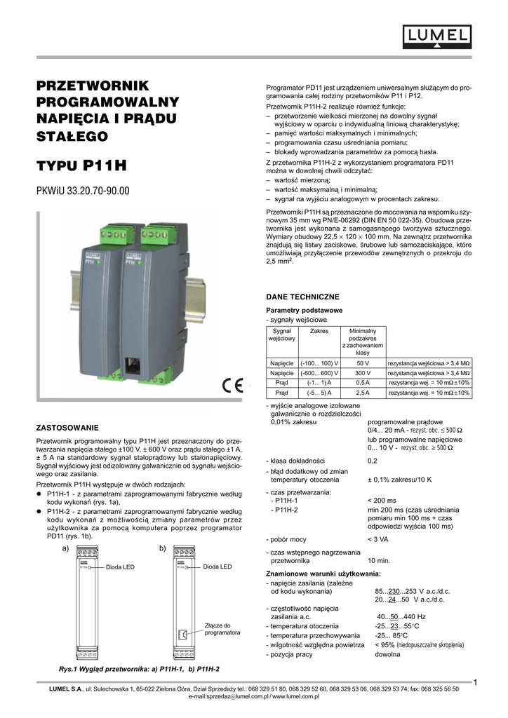 PRZETWORNIK PROGRAMOWALNY NAPIÊCIA I PR¥DU STA£EGO Programator PD11 jest urz¹dzeniem uniwersalnym s³u¿¹cym do programowania ca³ej rodziny przetworników P11 i P12. Przetwornik P11H-2 realizuje równie¿ funkcje: przetworzenie wielkoci mierzonej na dowolny sygna³ wyjciowy w oparciu o indywidualn¹ liniow¹ charakterystykê; pamiêæ wartoci maksymalnych i minimalnych; programowania czasu uredniania pomiaru; blokady wprowadzania parametrów za pomoc¹ has³a. TYPU P11H Z przetwornika P11H-2 z wykorzystaniem programatora PD11 mo¿na w dowolnej chwili odczytaæ: wartoæ mierzon¹; wartoæ maksymaln¹ i minimaln¹; sygna³ na wyjciu analogowym w procentach zakresu. PKWiU 33.20.70-90.00 Przetworniki P11H s¹ przeznaczone do mocowania na wsporniku szynowym 35 mm wg PN/E-06292 (DIN EN 50 022-35). Obudowa przetwornika jest wykonana z samogasn¹cego tworzywa sztucznego. Wymiary obudowy 22,5 ´ 120 ´ 100 mm. Na zewn¹trz przetwornika znajduj¹ siê listwy zaciskowe, rubowe lub samozaciskaj¹ce, które umo¿liwiaj¹ przy³¹czenie przewodów zewnêtrznych o przekroju do 2,5 mm2. DANE TECHNICZNE Parametry podstawowe - sygna³y wejciowe ZASTOSOWANIE Przetwornik programowalny typu P11H jest przeznaczony do przetwarzania napiêcia sta³ego ±100 V, ± 600 V oraz pr¹du sta³ego ±1 A, ± 5 A na standardowy sygna³ sta³opr¹dowy lub sta³onapiêciowy. Sygna³ wyjciowy jest odizolowany galwanicznie od sygna³u wejciowego oraz zasilania. Przetwornik P11H wystêpuje w dwóch rodzajach: l P11H-1 - z parametrami zaprogramowanymi fabrycznie wed³ug kodu wykonañ (rys. 1a), l P11H-2 - z parametrami zaprogramowanymi fabrycznie wed³ug kodu wykonañ z mo¿liwoci¹ zmiany parametrów przez u¿ytkownika za pomoc¹ komputera poprzez programator PD11 (rys. 1b). a) b) P11H Dioda LED P11H Dioda LED Z³¹cze do programatora Sygna³ wejciowy Zakres Minimalny podzakres z zachowaniem klasy Napiêcie (-100... 100) V 50 V rezystancja wejciowa > 3,4 MW Napiêcie (-600... 600) V 300 V rezystancja wejciowa > 3,4 MW Pr¹d (-1... 1) A 0,5 A rezystancja wej. = 10 mW±10% Pr¹d (-5... 5) A 2,5 A rezystancja wej. = 10 mW±10% - wyjcie analogowe izolowane galwanicznie o rozdzielczoci 0,01% zakresu programowalne pr¹dowe 0/4... 20 mA - rezyst. obc. £ 500 W lub programowalne napiêciowe 0... 10 V - rezyst. obc. ³ 500 W - klasa dok³adnoci 0,2 - b³¹d dodatkowy od zmian temperatury otoczenia ± 0,1% zakresu/10 K - czas przetwarzania: - P11H-1 - P11H-2 < 200 ms min 200 ms (czas uredniania pomiaru min 100 ms + czas odpowiedzi wyjcia 100 ms) - pobór mocy < 3 VA - czas wstêpnego nagrzewania przetwornika 10 min. Znamionowe warunki u¿ytkowania: - napiêcie zasilania (zale¿ne od kodu wykonania) 85...230...253 V a.c./d.c. 20...24...50 V a.c./d.c. - czêstotliwoæ napiêcia zasilania a.c. 40...50...440 Hz - temperatura otoczenia -25...23...55°C - temperatura przechowywania -25... 85°C - wilgotnoæ wzglêdna powietrza < 95% (niedopuszczalne skroplenia) - pozycja pracy dowolna Rys.1 Wygl¹d przetwornika: a) P11H-1, b) P11H-2 LUMEL S.A., ul. Sulechowska 1, 65-022 Zielona Góra, Dzia³ Sprzeda¿y tel.: 068 329 51 80, 068 329 52 60, 068 329 53 06, 068 329 53 74; fax: 068 325 56 50 e-mail:[email protected] / www.lumel.com.pl 1 PO£¥CZENIA ELEKTRYCZNE OBWODÓW ZEWNÊTRZNYCH 10 In, 2 Un (< 1000 V) 20% Parametry komunikacyjne z komputerem (tylko P11H-2): - interfejs RS232 tryb 8N1 - bity danych 8 - parzystoæ brak - bit stopu 1 - prêdkoæ 9600 bit/s - sterowanie przep³ywem brak Zapewniony stopieñ ochrony: IP 50 w wykonaniu P11H-1 IP 40 w wykonaniu P11H-2 IP 20 od strony zacisków 0,125 kg Wymiary 22,5 ´ 120 ´ 100 mm Mocowanie na wsporniku szynowym 35 mm Odpornoæ na zaniki zasilania wg PN-EN 50082-2 Kompatybilnoæ elektromagnetyczna: - odpornoæ na zak³ócenia elektromagnetyczne wg PN-EN 50082-2 - emisja zak³óceñ elektromagnetycznych wg PN-EN 50081-2 Wymagania bezpieczeñstwa wed³ug l kategoria instalacji l stopieñ zanieczyszczenia l napiêcie pracy wzglêdem ziemi normy PN-IEC 61010-1: III, 2, 600 V a.c. 41 93 120,7 35 120 6 wyjœcie 7 + - 8 9 zasilanie 6 3 2 GND Sygna³ mierzony 1 4 ± 100 V 6 7 ±1A 2 8 9 zasilanie wyjœcie + - 8 9 6 4 1 3 2 3 4 ± 600 V ±5A P11H 1 - GND ±1A zasilanie + P11H P11H 1 7 wyjœcie 7 wyjœcie + - 8 9 P11H GND ±5A 2 3 4 GND KOD WYKONAÑ X XX X X X XX X Rodzaj przetwornika: zaprogramowany fabrycznie ........ 1 programowalny* ............................ 2 15,24 5,08 zasilanie PRZETWORNIKI P11H WYMIARY ZEWNÊTRZNE I MONTA¯OWE ± 600 V ± 100 V Sposób po³¹czenia Masa Sygna³ mierzony Sposób po³¹czenia Przeci¹¿alnoæ: - krótkotrwa³a (3s) - d³ugotrwa³a 22,5 100 SPOSÓB PO£¥CZENIA PRZETWORNIKA P11H-2 Z KOMPUTEREM 16 x max 8 x max P11H DB 25 DB 25 DB 9 RS232 RJ 12 adapter DB9 / DB25 Zestaw programatora PD11 Sygna³ wejciowy: - 100... 100 V ...................................... 00 - 600... 600 V ...................................... 01 - 1... 1 A .............................................. 02 - 5... 5 A .............................................. 03 na zamówienie** ................................ XX Sygna³ wyjciowy: napiêcie 0... 10 V ........................................ pr¹d 0... 20 mA ........................................... pr¹d 4... 20 mA ........................................... pr¹d 0... 5 mA ............................................. na zamówienie** ......................................... 1 2 3 4 9 Zasilanie: 85... 253 V a.c./d.c. ............................................ 1 20... 50 V a.c./ d.c. ............................................. 2 Rodzaj zacisków: gniazdo - wtyki rubowe ............................................. 0 gniazdo - wtyki samozaciskowe ................................. 1 Wykonanie: standardowe ..................................................................... 00 specjalne** ........................................................................ XX Próby odbiorcze: bez dodatkowych wymagañ ...........................