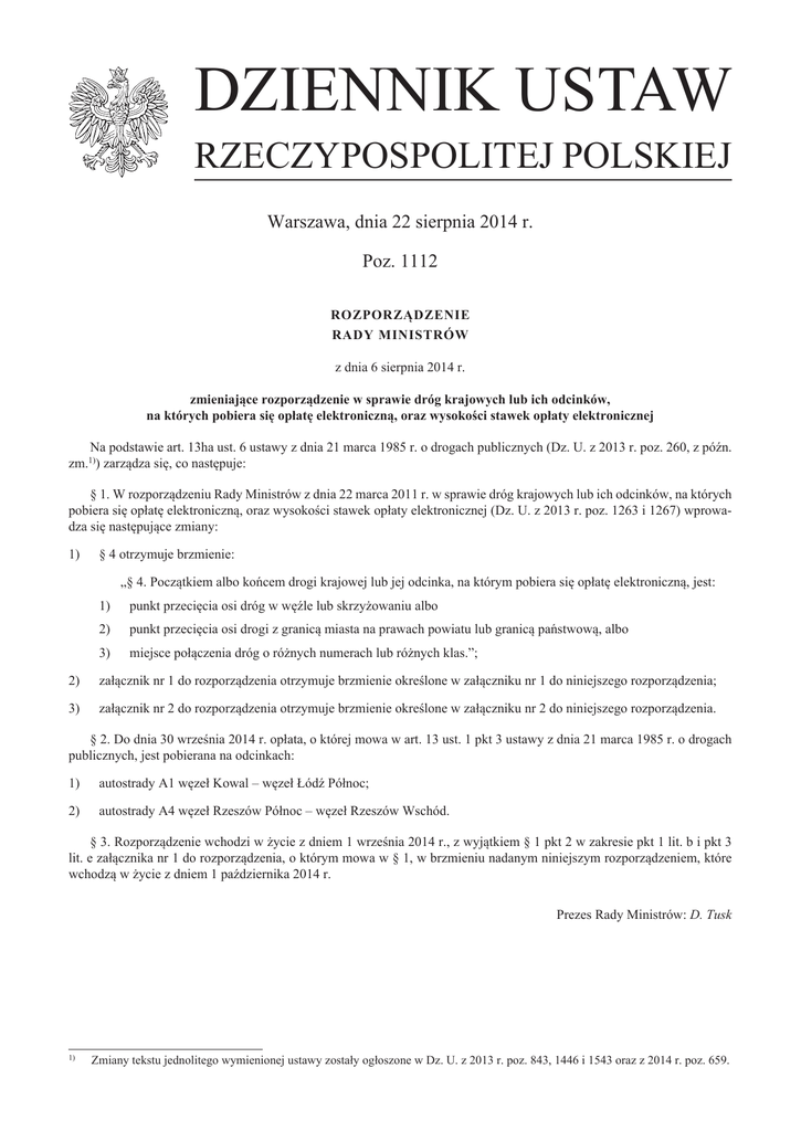 DZIENNIK USTAW RZECZYPOSPOLITEJ POLSKIEJ Warszawa, dnia 22 sierpnia 2014 r. Poz. 1112 ROZPORZĄDZENIE RADY MINISTRÓW z dnia 6 sierpnia 2014 r. zmieniające rozporządzenie w sprawie dróg krajowych lub ich odcinków, na których pobiera się opłatę elektroniczną, oraz wysokości stawek opłaty elektronicznej Na podstawie art. 13ha ust. 6 ustawy z dnia 21 marca 1985 r. o drogach publicznych (Dz. U. z 2013 r. poz. 260, z późn. zm.1)) zarządza się, co następuje: § 1. W rozporządzeniu Rady Ministrów z dnia 22 marca 2011 r. w sprawie dróg krajowych lub ich odcinków, na których pobiera się opłatę elektroniczną, oraz wysokości stawek opłaty elektronicznej (Dz. U. z 2013 r. poz. 1263 i 1267) wprowadza się następujące zmiany: 1) § 4 otrzymuje brzmienie: „§ 4. Początkiem albo końcem drogi krajowej lub jej odcinka, na którym pobiera się opłatę elektroniczną, jest: 1) punkt przecięcia osi dróg w węźle lub skrzyżowaniu albo 2) punkt przecięcia osi drogi z granicą miasta na prawach powiatu lub granicą państwową, albo 3) miejsce połączenia dróg o różnych numerach lub różnych klas.”; 2) załącznik nr 1 do rozporządzenia otrzymuje brzmienie określone w załączniku nr 1 do niniejszego rozporządzenia; 3) załącznik nr 2 do rozporządzenia otrzymuje brzmienie określone w załączniku nr 2 do niniejszego rozporządzenia. § 2. Do dnia 30 września 2014 r. opłata, o której mowa w art. 13 ust. 1 pkt 3 ustawy z dnia 21 marca 1985 r. o drogach publicznych, jest pobierana na odcinkach: 1) autostrady A1 węzeł Kowal – węzeł Łódź Północ; 2) autostrady A4 węzeł Rzeszów Północ – węzeł Rzeszów Wschód. § 3. Rozporządzenie wchodzi w życie z dniem 1 września 2014 r., z wyjątkiem § 1 pkt 2 w zakresie pkt 1 lit. b i pkt 3 lit. e załącznika nr 1 do rozporządzenia, o którym mowa w § 1, w brzmieniu nadanym niniejszym rozporządzeniem, które wchodzą w życie z dniem 1 października 2014 r. Prezes Rady Ministrów: D. Tusk 1) Zmiany tekstu jednolitego wymienionej ustawy zostały ogłoszone w Dz. U. z 2013 r. poz. 843, 1446 i 1543 oraz z 2014 r. poz. 659. Dziennik Ustaw –2– Poz. 1112 Załączniki do rozporządzenia Rady Ministrów z dnia 6 sierpnia 2014 r. (poz. 1112) Załącznik nr 1 DROGI KRAJOWE LUB ICH ODCINKI KLASY A I S, NA KTÓRYCH POBIERA SIĘ OPŁATĘ ELEKTRONICZNĄ 1) autostrada A1 na odcinkach: a) węzeł Czerniewice – węzeł Włocławek Zachód, b) węzeł Włocławek Zachód – węzeł Łódź Północ, c) węzeł Tuszyn – węzeł Piotrków Trybunalski Południe, d) węzeł Pyrzowice – Gorzyczki (granica państwowa); 2) autostrada A2 na odcinkach: a) Modła (skrzyżowanie z drogą gminną nr 48203P) – węzeł Konotopa, b) Choszczówka Dębska (skrzyżowanie z drogą gminną nr 220207W) – węzeł Kałuszyn; 3) autostrada A4 na odcinkach: a) Zgorzelec (granica państwowa) – węzeł Bielany Wrocławskie, b) węzeł Bielany Wrocławskie – węzeł Kleszczów, c) węzeł Kleszczów – węzeł Murckowska, d) węzeł Balice I – węzeł Tarnów Północ, e) węzeł Dębica Wschód – węzeł Rzeszów Wschód, f) węzeł Jarosław Zachód – węzeł Korczowa; 4) autostrada A6 na odcinku Kołbaskowo (granica państwowa) – węzeł Szczecin Dąbie; 5) autostrada A8 na odcinku węzeł Wrocław Południe – węzeł Wrocław Psie Pole; 6) autostrada A18 na odcinku węzeł Golnice – węzeł Krzyżowa; 7) droga ekspresowa S1 na odcinkach: a) węzeł Bielsko-Biała Komorowice – Cieszyn-Boguszowice (połączenie z drogą krajową nr 1), b) węzeł Dąbrowa Górnicza Pogoria – Tychy (skrzyżowanie z drogą krajową nr 86), c) węzeł Pyrzowice – węzeł Podwarpie; 8) droga ekspresowa S2 na odcinku węzeł Konotopa – węzeł Puławska; 9) droga ekspresowa S3 na odcinkach: a) węzeł Goleniów Północ – węzeł Szczecin Dąbie, b) węzeł Klucz – węzeł Gorzów Wielkopolski Południe, c) węzeł Międzyrzecz Południe – węzeł Nowa Sól Zachód; 10) droga ekspresowa S5 na odcinkach: a) węzeł Bydgoszcz Południe – węzeł Bydgoszcz Błonie, b) węzeł Gniezno Południe – skrzyżowanie z drogą powiatową nr 2440P; 11) droga ekspresowa S6 na odcinku Gdynia (skrzyżowanie z drogą wojewódzką nr 468) – połączenie z autostradą A1; 12) droga ekspresowa S7 na odcinkach: a) węzeł Gdańsk Południe – węzeł Żuławy Zachód, b) węzeł Elbląg Południe – węzeł Miłomłyn Południe, Dziennik Ustaw –3– Poz. 1112 c) węzeł Olsztynek Zachód – węzeł Rączki, d) obwodnicy Płońska: węzeł Ciechanów – węzeł Siedlin, e) Zakroczym (połączenie z drogą krajową nr 7) – Czosnów (skrzyżowanie z drogą powiatową nr 2405W), f) węzeł Głuchów – Kępiny (skrzyżowanie z drogą powiatową nr 1133W), g) Skarżysko-Kamienna (połączenie z drogą krajową nr 7) – węzeł Kielce Południe, h) węzeł Jędrzejów Północ – Jędrzejów (skrzyżowanie z drogą krajową nr 78), i) Kraków Rybitwy (połączenie z drogą krajową nr 7) – węzeł Kraków Bieżanów, j) Myślenice (połączenie z drogą krajową nr 7) – Lubień (połączenie z drogą krajową nr 7); 13) droga ekspresowa S8 na odcinkach: a) węzeł Wrocław Psie Pole – węzeł Wieluń, b) węzeł Łask – węzeł Rzgów, c) węzeł Piotrków Trybunalski Zachód – węzeł Radziejowice, d) węzeł Konotopa – węzeł Powązkowska, e) węzeł Modlińska – węzeł Marki, f) Radzymin (skrzyżowanie z drogą gminną nr 430731W) – węzeł Wyszków Północ, g) obwodnicy Ostrowi Mazowieckiej: węzeł Brok – Podborze (połączenie z drogą krajową nr 8), h) obwodnic Zambrowa i Wiśniewa: skrzyżowanie z drogą powiatową nr 2000B – skrzyżowanie z drogą powiatową nr 2012B; 14) droga ekspresowa S10 na odcinkach: a) obwodnicy Stargardu Szczecińskiego: węzeł Stargard Szczeciński Zachód – węzeł Stargard Szczeciński Wschód, b) węzeł Toruń Zachód – węzeł Czerniewice; 15) droga ekspresowa 