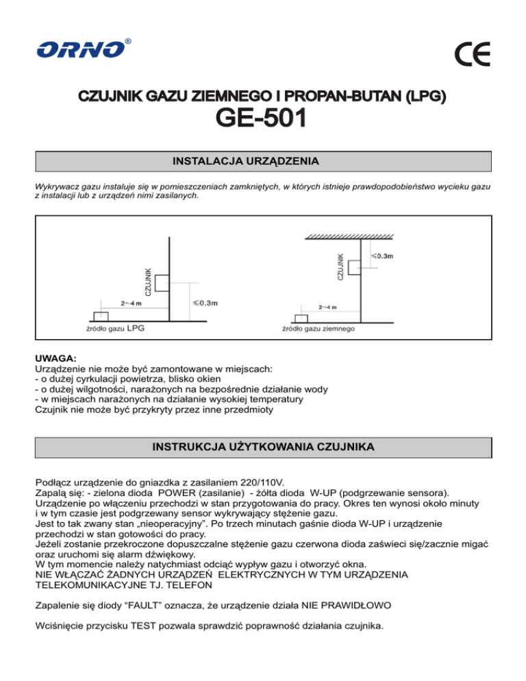 ® CE CZUJNIK GAZU ZIEMNEGO I PROPAN-BUTAN (LPG) GE-501 INSTALACJA URZĄDZENIA CZUJNIK CZUJNIK Wykrywacz gazu instaluje się w pomieszczeniach zamkniętych, w których istnieje prawdopodobieństwo wycieku gazu z instalacji lub z urządzeń nimi zasilanych. źródło gazu LPG źródło gazu ziemnego UWAGA: Urządzenie nie może być zamontowane w miejscach: - o dużej cyrkulacji powietrza, blisko okien - o dużej wilgotności, narażonych na bezpośrednie działanie wody - w miejscach narażonych na działanie wysokiej temperatury Czujnik nie może być przykryty przez inne przedmioty INSTRUKCJA UŻYTKOWANIA CZUJNIKA Podłącz urządzenie do gniazdka z zasilaniem 220/110V. Zapalą się: - zielona dioda POWER (zasilanie) - żółta dioda W-UP (podgrzewanie sensora). Urządzenie po włączeniu przechodzi w stan przygotowania do pracy. Okres ten wynosi około minuty i w tym czasie jest podgrzewany sensor wykrywający stężenie gazu. Jest to tak zwany stan „nieoperacyjny”. Po trzech minutach gaśnie dioda W-UP i urządzenie przechodzi w stan gotowości do pracy. Jeżeli zostanie przekroczone dopuszczalne stężenie gazu czerwona dioda zaświeci się/zacznie migać oraz uruchomi się alarm dźwiękowy. W tym momencie należy natychmiast odciąć wypływ gazu i otworzyć okna. NIE WŁĄCZAĆ ŻADNYCH URZĄDZEŃ ELEKTRYCZNYCH W TYM URZĄDZENIA TELEKOMUNIKACYJNE TJ. TELEFON Zapalenie się diody “FAULT” oznacza, że urządzenie działa NIE PRAWIDŁOWO Wciśnięcie przycisku TEST pozwala sprawdzić poprawność działania czujnika. OPIS DIÓD KONTROLNYCH 1. POWER - Zasilanie - zielony 2. W- UP - dioda podgrzewania sensora - żółty 1 2 3 4 4. Alarm - czerwony 5 5. Przycisk testu naciśnij celem sprawdzenia alarmu 3. FAULT - Błąd - żółty SPECYFIKACJA TECHNICZNA 1. 2. 2. 3. 4. 5. 6. 7. 8. Rodzaje wykrywanych gazów: gaz ziemny, propan-butan (LPG) Zasilanie: AC 220V/110V ± 10% 50 Hz Zużycie energi: Ł 3W 0 0 Temperatura i dopuszczalna wilgotność: 0 C ~ 55 C, <95% Czas reakcji: Ł 30 sek. załączany automatycznie Poziom alarmowy 10% LEL Poziom głośności: ł 70 dB Waga: 230 g Wymiary: 123 x 81 x 44 mm Sygnalizatory obecności gazu ze względu na uwarunkowania techniczne (np. możliwość okresowych zaników lub zmian napięcia w sieci, awaria urządzenia, itp.) oraz specyfikę pomieszczeń, w których urządzenia te mogą być montowane, nie dają całkowitej pewności wykrycia gazu, a jedynie znacznie podnoszą prawdopodobieństwo wcześniejszego wykrycia jego niebezpiecznego stężenia. Stąd należy pamiętać, iż urządzenia te należy testować zgodnie z załączoną instrukcja obsługi oraz dokonywać okresowych przeglądów stanu instalacji gazowych. Wszelkie reklamacje należy zgłaszać bezpośrednio do dystrybutora: ORNO POLSKA ul. Cieszyńska 21, 43-170 Łaziska Górne tel. 0-32 43 43 110, [email protected], www.orno.pl Zużyte urządzenie elektryczne nie może być składowane wraz z innymi odpadami. Zużyte urządzenie należy składować w miejscach do tego przeznaczonych. DYREKTYWA 2002/96/WE z dnia 27.01.2003 r