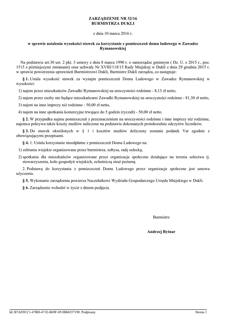 ZARZĄDZENIE NR 32/16 BURMISTRZA DUKLI z dnia 10 marca 2016 r. w sprawie ustalenia wysokości stawek za korzystanie z pomieszczeń domu ludowego w Zawadce Rymanowskiej Na podstawie art.30 ust. 2 pkt. 3 ustawy z dnia 8 marca 1990 r. o samorządze gminnym ( Dz. U. z 2015 r., poz. 1515 z późniejszymi zmianami) oraz uchwały Nr XVIII/118/15 Rady Miejskiej w Dukli z dnia 29 grudnia 2015 r. w sprawie powierzenia uprawnień Burmistrzowi Dukli, Burmistrz Dukli zarządza, co następuje: § 1. Ustala wysokość stawek za wynajm pomieszczeń Domu Ludowego w Zawadce Rymanowskiej w wysokości: 1) najem przez mieszkańców Zawadki Rymanowskiej na uroczystości rodzinne - 8,13 zł netto, 2) najem przez osoby nie będące mieszkańcami Zawadki Rymanowskiej na uroczystości rodzinne - 81,30 zł netto, 3) najem na inne imprezy niż rodzinne - 50,00 zł netto, 4) najem na inne spotkania komercyjne trwające do 5 godzin (ryczałt) - 50,00 zł netto. § 2. W przypadku najmu pomieszczeń z przeznaczeniem na uroczystości rodzinne i inne imprezy niż rodzinne, najemca pokrywa także koszty mediów naliczone na podstawie dokonanych protokoralnie odczytów liczników. § 3. Do stawek określonych w § 1 i kosztów mediów doliczony zostanie podatek Vat zgodnie z obowiązującymi przepisami. § 4. 1. Ustala korzystanie nieodpłatne z pomieszczeń Domu Ludowego na: 1) zebrania wiejskie organizowane przez burmistrza, sołtysa, radę sołecką, 2) spotkania dla mieszkańców organizowane przez organizacje społeczne działające na terenia sołectwa tj. stowarzyszenia, koło gospodyń wiejskich, ochotniczą straż pożarną. 2. Podstawą do korzystania z pomieszczeń Domu Ludowego przez organizacje społeczne jest umowa użyczenia. § 5. Wykonanie zarządzenia powierza Naczelnikowi Wydziału Gospodarczego Urzędu Miejskiego w Dukli. § 6. Zarządzenie wchodzi w życie z dniem podjęcia. Burmistrz Andrzej Bytnar Id: B7AE9CC1-47BD-471E-B49F-051BB4357198. Podpisany Strona 1