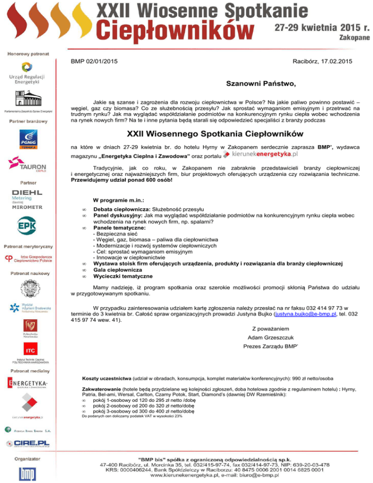 Racibórz, 17.02.2015 BMP 02/01/2015 Szanowni Państwo, Jakie są szanse i zagrożenia dla rozwoju ciepłownictwa w Polsce? Na jakie paliwo powinno postawić – węgiel, gaz czy biomasa? Co ze służebnością przesyłu? Jak sprostać wymaganiom emisyjnym i przetrwać na trudnym rynku? Jak ma wyglądać współdziałanie podmiotów na konkurencyjnym rynku ciepła wobec wchodzenia na rynek nowych firm? Na te i inne pytania będą starali się odpowiedzieć specjaliści z branży podczas XXII Wiosennego Spotkania Ciepłowników na które w dniach 27-29 kwietnia br. do hotelu Hyrny w Zakopanem serdecznie zaprasza BMP’, wydawca magazynu „Energetyka Cieplna i Zawodowa” oraz portalu Tradycyjnie, jak co roku, w Zakopanem nie zabraknie przedstawicieli branży ciepłowniczej i energetycznej oraz najważniejszych firm, biur projektowych oferujących urządzenia czy rozwiązania techniczne. Przewidujemy udział ponad 600 osób! W programie m.in.: • • • • • • Debata ciepłownicza: Służebność przesyłu Panel dyskusyjny: Jak ma wyglądać współdziałanie podmiotów na konkurencyjnym rynku ciepła wobec wchodzenia na rynek nowych firm, np. spalarni? Panele tematyczne: - Bezpieczna sieć - Węgiel, gaz, biomasa – paliwa dla ciepłownictwa - Modernizacje i rozwój systemów ciepłowniczych - Cel: sprostać wymaganiom emisyjnym - Innowacje w ciepłownictwie Wystawa stoisk firm oferujących urządzenia, produkty i rozwiązania dla branży ciepłowniczej Gala ciepłownicza Wycieczki tematyczne Mamy nadzieję, iż program spotkania oraz szerokie możliwości promocji skłonią Państwa do udziału w przygotowywanym spotkaniu. W przypadku zainteresowania udziałem kartę zgłoszenia należy przesłać na nr faksu 032 414 97 73 w terminie do 3 kwietnia br. Całość spraw organizacyjnych prowadzi Justyna Bujko ([email protected], tel. 032 415 97 74 wew. 41). Z poważaniem Adam Grzeszczuk Prezes Zarządu BMP’ Koszty uczestnictwa (udział w obradach, konsumpcja, komplet materiałów konferencyjnych): 990 zł netto/osoba Zakwaterowanie (hotele będą przydzielane wg kolejności zgłoszeń, doba hotelowa zgodnie z regulaminem hotelu) : Hyrny, Patria, Bel-ami, Wersal, Carlton, Czarny Potok, Start, Diamond’s (dawniej DW Rzemieślnik): • pokój 1-osobowy od 120 do 295 zł netto /dobę • pokój 2-osobowy od 200 do 320 zł netto/dobę • pokój 3-osobowy od 300 do 400 zł netto/dobę Do podanych cen doliczamy podatek VAT w wysokości 23% KARTA ZGŁOSZENIA UCZESTNICTWA Zgłaszamy udział w konferencji: imię i nazwisko stanowisko adres e-mail imię i nazwisko stanowisko adres e-mail imię i nazwisko stanowisko adres e-mail imię i nazwisko stanowisko adres e-mail Rezerwacja miejsc noclegowych: Dla ilu osób nocleg: 27/28.04.2015 pokój 1-osobowy pokój 2-osobowy pokój 3-osobowy 28/29.04.2015 pokój 1-osobowy pokój 2-osobowy pokój 3-osobowy DANE FIRMY: nazwa firmy ulica kod numer NIP telefon osoba kontaktowa miejscowość fax adres e-mail na który zostanie wysłane potwierdzenie oraz proforma * Wyrażamy zgodę na wystawienie faktury VAT bez naszego podpisu ** Oświadczamy, iż zapoznaliśmy się z regulaminem sympozjum/konferencji firmy „BMP bis” Spółka z ograniczoną odpowiedzialnością Sp. k. (regulamin jest dostępny na stronie: www.kierunekenergetyka.pl) *** Na podstawie art. 23 ust. 1 pkt 1 ustawy z dn. 29.08.1997 r. o ochronie danych osobowych (Dz. U. z 2002 r. Nr 101, poz. 926 z późn. zm.) oraz w związku z zapisami zawartymi w regulaminie sympozjum, wyrażam zgodę na przetwarzanie moich danych osobowych zawartych w karcie uczestnictwa złożonej organizatorowi w celach jak w ww. regulaminie. ORGANIZATOR: „BMP bis” Spółka z ograniczoną odpowiedzialnością Sp. k., 47-400 Racibórz, ul. Morcinka 35, NIP: 639-20-03-478 Kontakt: Justyna Bujko, tel. 32/ 415 97 74 w. 41; fax 32 414 97 73 e-mail: [email protected] ………………......................................................... (pieczęć firmy) ………………......................................................... (podpis i pieczęć osoby upoważnionej do reprezentowania firmy)