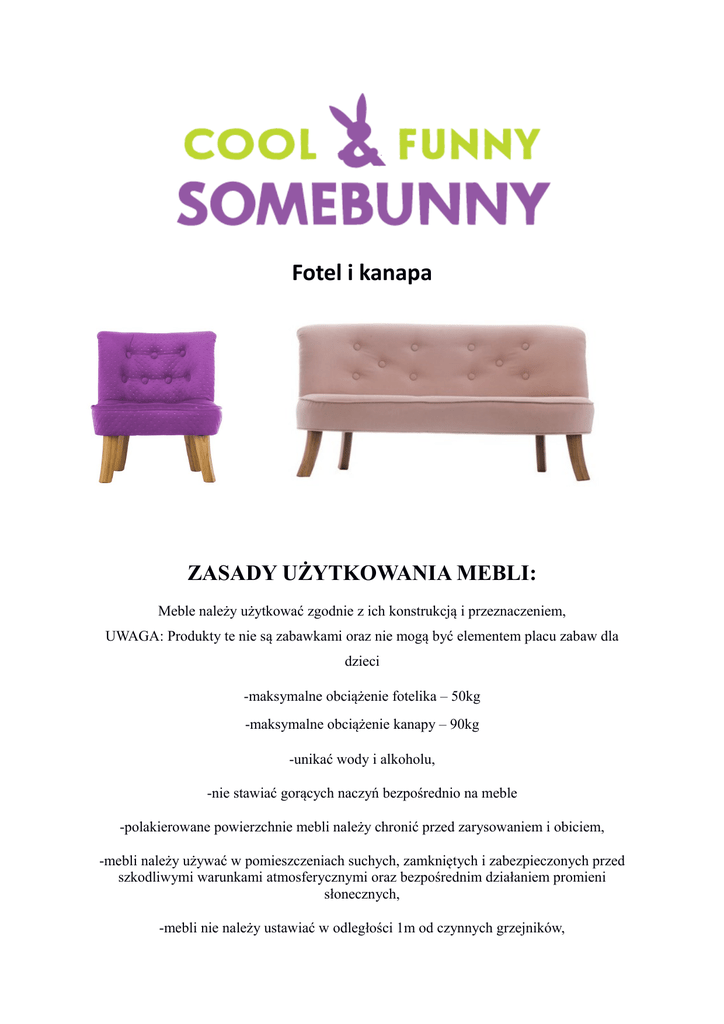 Fotel i kanapa ZASADY UŻYTKOWANIA MEBLI: Meble należy użytkować zgodnie z ich konstrukcją i przeznaczeniem, UWAGA: Produkty te nie są zabawkami oraz nie mogą być elementem placu zabaw dla dzieci -maksymalne obciążenie fotelika – 50kg -maksymalne obciążenie kanapy – 90kg -unikać wody i alkoholu, -nie stawiać gorących naczyń bezpośrednio na meble -polakierowane powierzchnie mebli należy chronić przed zarysowaniem i obiciem, -mebli należy używać w pomieszczeniach suchych, zamkniętych i zabezpieczonych przed szkodliwymi warunkami atmosferycznymi oraz bezpośrednim działaniem promieni słonecznych, -mebli nie należy ustawiać w odległości 1m od czynnych grzejników, -kanapę i fotelik należy użytkować na równych powierzchniach, ZASADY KONSERWACJI MEBLI: Regularna pielęgnacja elementów drewnianych znacznie przedłuży żywotność produktu, dlatego należy utrzymywać go w higienicznym stanie. Używać zasadniczo wyłącznie łagodnych i rozpuszczalnych w wodzie środków czyszczących, które w swojej informacji o produkcie wyraźnie przeznaczone są do drewnianych powierzchni lakierowanych mebli: -używać miękkiej szmatki lub gąbki, -nie używać ścierek powodujących zarysowania, -usuwać zabrudzenia tak szybko jak to możliwe, świeże plamy dają się zazwyczaj lżej i najczęściej w całości usunąć, -w żadnym przypadku nie używać rozpuszczalników, proszków do czyszczenia, ponieważ zniszczą powierzchnie tak silnie, że przywrócenie jej do stanu pierwotnego będzie niemożliwe, -powierzchnie drewniane należy czyścić lekko wilgotną ścierką, następnie dokładnie wytrzeć do sucha zgodnie z kierunkiem usłojenia, -tkaninę należy czyścić za pomocą wilgotnej szmatki lub gąbki, -elementów drewnianych oraz tkaniny nie należy czyścić agresywnymi środkami i rozpuszczalnikami, -unikać długotrwałego działania wody – może to spowodować zbielenie lub zmarszczenie, które nie podlega reklamacji. Producent ZPH LITEX STANISŁAW LITWIN 63-400 Ostrów Wielkopolski ul. Staroprzygodzka 117 Wyprodukowano w Polsce Firma ZPH Litex Stanisław Litwin dokłada wszelkich starań aby do produktu była dołączona aktualna instrukcja obsługi.