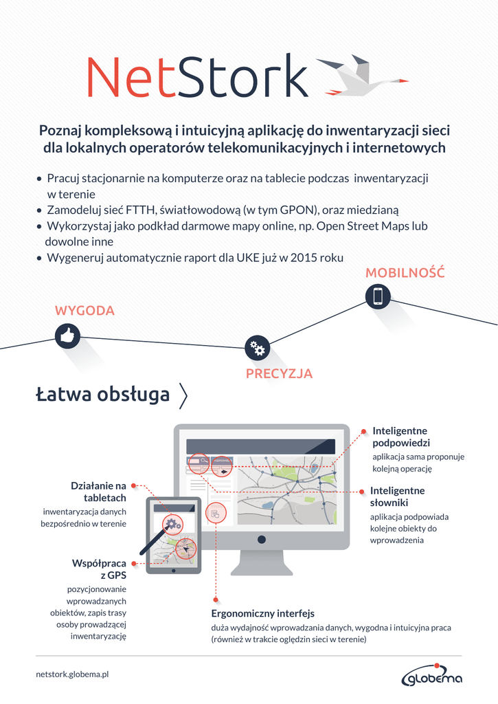 Poznaj kompleksową i intuicyjną aplikację do inwentaryzacji sieci dla lokalnych operatorów telekomunikacyjnych i internetowych • Pracuj stacjonarnie na komputerze oraz na tablecie podczas inwentaryzacji . w terenie • Zamodeluj sieć FTTH, światłowodową (w tym GPON), oraz miedzianą • Wykorzystaj jako podkład darmowe mapy online, np. Open Street Maps lub . dowolne inne • Wygeneruj automatycznie raport dla UKE już w 2015 roku MOBILNOŚĆ WYGODA PRECYZJA Łatwa obsługa Inteligentne podpowiedzi PODPOWIEDZI Działanie na tabletach aplikacja sama proponuje kolejną operację Inteligentne słowniki inwentaryzacja danych bezpośrednio w terenie aplikacja podpowiada kolejne obiekty do wprowadzenia Współpraca z GPS pozycjonowanie wprowadzanych obiektów, zapis trasy osoby prowadzącej inwentaryzację netstork.globema.pl Ergonomiczny interfejs duża wydajność wprowadzania danych, wygodna i intuicyjna praca (również w trakcie oględzin sieci w terenie) Mapy Aplikacja NetStork umożliwia import podkładów rastrowych i wektorowych w formacie DXF, a także wyświetlanie on-line danych pochodzących z publicznych serwisów mapowych, np. Open Street Maps. Dane Do poszczególnych elementów sieci można przypisać zdjęcia wykonane w trakcie przeglądu sieci lub inne dokumenty (np. karty katalogowe, dokumentację powykonawczą, etc.). W zakresie kontroli danych, aplikacja na bieżąco monitoruje poprawność wstawianych obiektów; możliwe jest również wykonanie weryfikacji dla wybranego obszaru czy też całej bazy danych. Wymagania techniczne Windows XP / Windows 7 oraz platforma .NET Framework 4. Baza danych systemu może pracować na maszynach z rodziny MS Windows. NetStork umożliwia również graficzne modelowanie połączeń włókien w złączach optycznych oraz połączeń pomiędzy portami przełącznic. NetStork wykorzystuje bazę Microsoft SQL Server Express Edition, dzięki czemu wdrożenie systemu nie wymaga zakupu dodatkowych licencji bazodanowych. Na podstawie przechowywanego modelu sieci, w aplikacji tworzone są schematy logiczne sieci na poziomie włókien i kabli światłowodowych. Do pracy nie jest wymagane połączenie internetowe. Zmobilizuj swoją sieć netstork.globema.pl Globema jest wiodącym dostawcą systemów paszportyzacji sieci telekomunikacyjnych i zarządzania pracownikami w terenie w Polsce i Europie Środkowo-Wschodniej. Na rynku od 1998 roku. www.globema.pl [email protected] +48 22 848 73 13