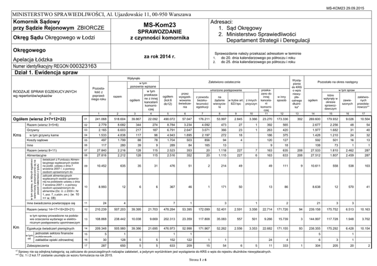 MS-KOM23 29.09.2015 MINISTERSTWO SPRAWIEDLIWOŚCI, Al. Ujazdowskie 11, 00-950 Warszawa Komornik Sądowy MS-Kom23 przy Sądzie Rejonowym ZBIORCZE SPRAWOZDANIE Okręg Sądu Okręgowego w Łodzi z czynności komornika Adresaci: 1. Sąd Okręgowy 2. Ministerstwo Sprawiedliwości Departament Strategii i Deregulacji Okręgowego Sprawozdanie należy przekazać adresatom w terminie do 20. dnia kalendarzowego po półroczu i roku do 25. dnia kalendarzowego po półroczu i roku za rok 2014 r. Apelacja Łódzka 1. 2. Numer identyfikacyjny REGON 000323163 Dział 1. Ewidencja spraw Wpłynęło Załatwiono ostatecznie w tym Pozostałość z poprzedniego roku RODZAJE SPRAW EGZEKUCYJNYCH wg repertoriów/wykazów 0 Kmp 4 5 6 7 na żądanie w trybie art. z innych wierzycie823 kpc przyczyn la 8 przekazano do innej kancelarii komorniczej 11 w inny sposób 9 10 22.092 490.072 57.047 176.211 53.997 2.845 3.366 23.270 173.336 Razem (wiersz 3+5+6) 02 2.779 8.682 344 274 8.784 3.234 4.092 473 27 1 392 Grzywny 03 2.165 6.603 217 187 6.791 2.647 3.071 366 23 1 263 04 1.533 4.838 117 96 4.943 1.895 2.197 272 18 Koszty sądowe 05 497 1.799 88 78 1.704 503 856 94 4 Inne 06 117 280 39 9 289 84 165 13 Razem (wiersz 8+11) 07 27.840 2.216 128 115 2.523 353 20 1.118 227 Alimentacyjne 08 27.816 2.212 128 115 2.516 352 20 1.115 227 09 10.452 635 35 31 476 51 2 214 10 8.993 12 6 6 367 46 1 171 świadczeń z Funduszu Alimentacyjnego wypłacanych osobie na podst. ustawy z dnia 7 września 2007 r. o pomocy osobom uprawnionym do alimentów (Dz. U. z 2009 r. Nr zaliczek alimentacyjnych wypłacanych osobie uprawnionej na podstawie ustawy z dnia 7 września 2007 r. o pomocy osobom upoważnionym do alimentów (Dz. U. z 2009 r. Nr 1, poz. 7, z późn. zm.) (w. 10 3 z powodu bezskuteczności egzekucji 39.867 w tym grzywny karne 2 umorzono postępowanie przez wyegzekwowanie świadczenia ogółem (kol.6 do12) 518.604 12 13 Pozostało na okres następny w tym spraw które wpłynęły w okresie sprawozdawczym ogółem 14 302 15 zawieszonych 16 załatwionych przedstanowczo** 17 269.600 179.932 9.026 10.504 565 2.677 2.256 48 54 420 1.977 1.682 31 40 186 375 1.428 1.210 24 32 120 127 592 501 16 13 9 18 108 73 1 1 7 163 635 208 27.533 1.810 2.462 287 6 163 633 208 27.512 1.807 2.459 287 49 49 111 9 10.611 558 538 103 50 13 86 8.638 12 570 41 <= w. 08) Inne świadczenia powtarzające się 11 24 4 7 1 21 3 3 Razem (wiersz 14+17+18+20+21) 12 210.239 507.203 39.395 21.703 478.284 53.395 172.099 52.401 2.591 3.358 22.714 171.726 94 239.158 175.752 6.513 10.163 13 108.868 238.442 10.038 9.669 202.313 23.359 117.808 35.083 557 501 9.266 15.739 3 144.997 117.728 1.948 3.702 Egzekucja świadczeń pieniężnych 14 209.348 505.980 39.386 21.695 476.973 52.998 171.967 52.262 2.556 3.353 22.682 171.155 93 238.355 175.292 6.428 10.154 jednostek sektora finansów w tym publicznych od zakładów opieki zdrowotnej 15 5 1 1 1 16 30 128 5 5 152 122 1 1 17 287 650 5 5 633 209 15 54 w tym sprawy prowadzone na podstawie orzeczenia wydanego w elektronicznym postępowaniu upominawczym Km ogółem w tym przekazane z innej kancelarii komorniczej 241.068 w tym sprawy, w których egzekwowane kwoty przeznaczone są na poczet należności z tytułu Kms razem 01 Ogółem (wiersz 2+7+12+22) 1 ponownie wpisane Wystąpienie do KRS o wpis niewypłacalnego dłużnika* Zabezpieczenia 3 1 2 5 6 5 24 4 11 333 *) Sprawy nie są odrębną kategorią; są zaliczane do poszczególnych rodzajów załatwień, a jedynym wyróżnikiem jest wystąpienie do KRS o wpis do rejestru dłużników niewypłacalnych. **) Dz. 1 i 2 kol.17 zostanie usunięta ze wzoru formularza na rok 2015. Strona 1 z 6 1 1 6 3 1 304 205 20 2 MS-KOM23 29.09.2015 Dział 1. Ewidencja spraw (dok.) Załatwiono ostatecznie Wpłynęło w tym ponownie wpisane Pozostałość z poprzedniego roku RODZAJE SPRAW EGZEKUCYJNYCH wg repertoriów/wykazów 0 Km (dok.) w tym przekazane z ogółem innej kancelarii komorniczej razem 1 2 3 ogółem (kol.6 do12) z powodu bezskuteczności egzekucji na żądanie wierzyciela 5 6 7 8 4 Opróżnienie lokali mieszkalnych 18 476 392 2 w tym na podstawie tytułu wykonawczego, z którego nie wynika prawo dłużnika do lokalu socjalnego lub zamiennego 19 107 62 1 Egzekucja innych świadczeń niepieniężnych 20 127 180 2 Inne 21 1 1 22 210 503 23 187 265 24 4 Kmn Wykaz OZ umorzono postępowanie przez wyegzekwowanie świadczenia 1 2 w trybie art. z innych 823 kpc przyczyn 9 przekazano do innej kancelarii komorniczej 10 w inny sposób 11 12 27 Pozostało na okres następny w tym spraw ogółem 13 które wpłynęły w okresie sprawozdawczym zawieszonych załatwionych przedstanownowczo** 15 16 17 14 466 111 109 75 24 20 127 402 195 62 7 91 24 5 13 6 2 41 78 32 14 1 211 77 8 10 5 1 110 96 59 3 1 1 1 1 410 232 114 3 12 24 158 78 7 37 2.697 3.212 1 102 Wystąpienie do KRS o wpis niewypłacalnego dłużnika* 481 65 294 33 5 218 4 2 1 1 europejskiego tytułu egzekucyjnego (art. 1153 kpc) w tym postępowania prowadzone na podst. 4 europejskiego nakazu zapłaty (art. 1153 kpc) 2 1 1 2 25 orzeczeń wydanych w europejskim post. w sprawie 26 drobnych roszczeń (art. 11537 kpc) tytułów egzekucyjnych określonych w rozporządzeniu Rady (WE) nr 4/2009 z dn. 18 grudnia 2008 r. w sprawie jurysdykcji, prawa właściwego, uznawania i 27 wykonywania orzeczeń oraz współpracy w zakresie zobowiązań alimentacyjnych (Dz. U. UE.L. Nr 7, poz. 1, z późn. zm.) Wykaz W Kmo 28 1 2 153.949 241.896 5.672 3.744 237.690 25.583 28.742 87 28.742 29 130.821 41.781 568 91 14.258 24.588 22 3 1 158.155 116.054 28.655 Dział 2. Sprawy z wyboru wierzyciela na podstawie art. 8 ust. 5 ustawy o komornikach sądowych i egzekucji Wpłynęło RODZAJE SPRAW EGZEKUCYJNYCH wg repertoriów/wykazów (sprawy te są składowymi dz. 1., tzn. muszą być wykazane w poszczególnych repertoriach, a także zgodne z wykazem W, w dz. 1. w. 23) 0 Załatwiono ostatecznie w tym Pozostałość z poprzedniego roku razem ogółem (kol.6 do12) 5 z powodu bezs