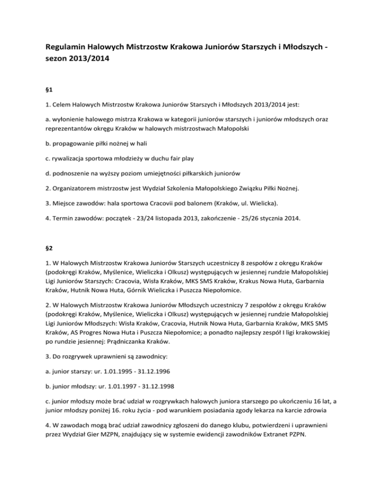 Regulamin Halowych Mistrzostw Krakowa Juniorów Starszych i Młodszych sezon 2013/2014