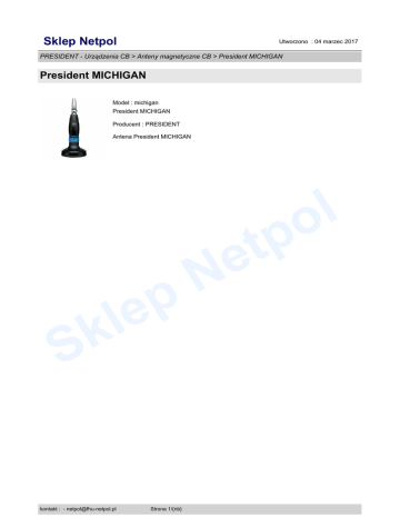 Sklep Netpol Utworzono : 04 marzec 2017 PRESIDENT - Urządzenia CB > Anteny magnetyczne CB > President MICHIGAN President MICHIGAN Model : michigan President MICHIGAN Producent : PRESIDENT Antena President MICHIGAN S N p e l k kontakt : - [email protected] p t e Strona 1/{nb} l o Sklep Netpol Utworzono : 04 marzec 2017 PRESIDENT - Urządzenia CB > Anteny magnetyczne CB > President MICHIGAN President MICHIGAN S N p e l k kontakt : - [email protected] p t e Strona 2/{nb} l o Sklep Netpol Utworzono : 04 marzec 2017 PRESIDENT - Urządzenia CB > Anteny magnetyczne CB > President MICHIGAN President MICHIGAN Antena na podstawie magnetycznej o średnicy 77 mm. Parametry: długość anteny 870 mm możliwość przechylenia anteny pod kątem długość fali 1/4 Cena : 335.00 zł Brutto ( 272.36 zł Netto) S N p e l k kontakt : - [email protected] Strona 3/{nb} l o p t e Dostępność: Produkt dostępny w naszym sklepie od 28 kwiecień 2015