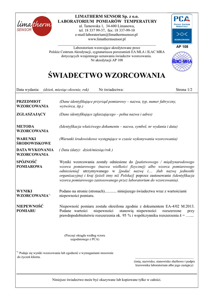 LIMATHERM SENSOR Sp. z o.o. LABORATORIUM POMIARÓW TEMPERATURY ul. Tarnowska 1, 34-600 Limanowa, tel. 18 337 99-37, fax: 18 337-99-10 e-mail:[email protected] www.limathermsensor.pl ____________________________________________________ Laboratorium wzorcujące akredytowane przez Polskie Centrum Akredytacji, sygnatariusza porozumień EA MLA i ILAC MRA dotyczących wzajemnego uznawania świadectw wzorcowania. Nr akredytacji AP 108 AP 108 ŚWIADECTWO WZORCOWANIA Data wydania: (dzień, miesiąc-słownie, rok) Nr świadectwa: Strona 1/2 PRZEDMIOT WZORCOWANIA (Dane identyfikujące przyrząd pomiarowy – nazwa, typ, numer fabryczny, wytwórca, itp.) ZGŁASZAJĄCY (Dane identyfikujące zgłaszającego – pełna nazwa i adres) METODA WZORCOWANIA (Identyfikacja właściwego dokumentu – nazwa, symbol, nr wydania i data) WARUNKI ŚRODOWISKOWE (Warunki środowiskowe występujące w czasie wykonywania wzorcowania) DATA WYKONANIA WZORCOWANIA ( Data (daty): dzień/miesiąc/rok ) SPÓJNOŚĆ POMIAROWA Wyniki wzorcowania zostały odniesione do [państwowego / międzynarodowego wzorca pomiarowego (nazwa wielkości fizycznej) albo wzorca pomiarowego odniesienia] utrzymywanego w [podać nazwę (.... )lub nazwę jednostki organizacyjnej i kraj (jeżeli inny niż Polska)] poprzez zastosowanie (identyfikacja wzorca pomiarowego zastosowanego przez laboratorium do wzorcowania). WYNIKI WZORCOWANIA*) Podano na stronie (stronach)............ niniejszego świadectwa wraz z wartościami niepewności pomiaru. NIEPEWNOŚĆ POMIARU Niepewność pomiaru została określona zgodnie z dokumentem EA-4/02 M:2013. Podane wartości niepewności stanowią niepewności rozszerzone przy prawdopodobieństwie rozszerzenia ok.-95-% i współczynniku rozszerzenia k = ….... (Pieczęć okrągła według wzoru uzgodnionego z PCA) *) Podaje się wyniki wzorcowania lub zgodność z wymaganiami stosownie do życzeń klienta. ................................................................. (imię, nazwisko, stanowisko służbowe i podpis kierownika laboratorium albo jego zastępcy) Niniejsze świadectwo może być okazywane lub kopiowane tylko w całości. ŚWIADECTWO WZORCOWANIA wydane przez LABORATORIUM AKREDYTOWANE Nr AP 108 Data wydania: (dzień, miesiąc-słownie, rok) WYNIKI WZORCOWANIA Nr świadectwa: Strona 2/2 Wyniki przeprowadzonego wzorcowania przedstawiono poniżej. Nr Wartość temperatury odniesienia Wartość rezystancji czujnika wzorcowanego Błąd pomiaru Niepewność pomiaru t R Δt U °C Ω °C °C 1 2 3 4 Głębokość zanurzenia czujnika wzorcowanego: …...... mm. Rodzaj połączenia: .... Wzorcowanie wykonano dla prądu pomiarowego .... Δt - różnica między wartością temperatury obliczoną na podstawie normy PN-EN 60751:2009 z wyznaczonej wartości rezystancji czujnika wzorcowanego, a wartością temperatury odniesienia. Podane wartości temperatury odnoszę się do Międzynarodowej Skali Temperatury z 1990 r. (MST-90). Charakterystykę termometryczną wzorcowanego platynowego czujnika termometru rezystancyjnego Pt-100 wyznaczono z wielomianu: - w zakresie od (temperatura ujemna) do 0 °C Rt= Ro[1+ At + Bt2 + C(t-100 °C)t3] - w zakresie od 0 °C do (temperatura dodatnia) °C Rt = Ro(1+ At + Bt2 ) gdzie : Rt - rezystancja czujnika w temperaturze t Ro - rezystancja czujnika w 0 °C. Parametry równania charakterystyki termometrycznej czujnika wzorcowanego, wyznaczone na podstawie wyników wzorcowania, wynoszą: Ro = A = B = C = Autoryzował(a): [podpis osoby odpowiedzialnej za merytoryczną treść świadectwa]