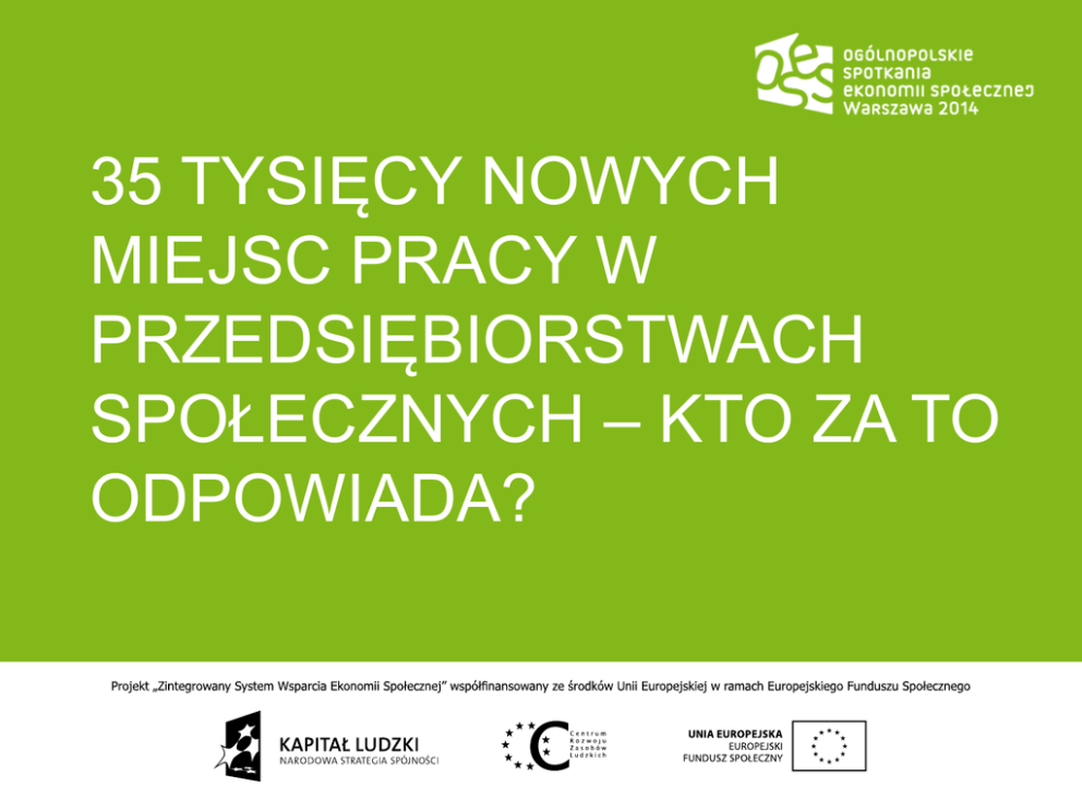 35 TYSIĘCY NOWYCH MIEJSC PRACY W PRZEDSIĘBIORSTWACH SPOŁECZNYCH – KTO ZA TO ODPOWIADA? PERSPEKTYWA EUROPEJSKA Wieloletnie ramy finansowe Strategia Europa 2020 Europejski semestr Zalecenia dla poszczególnych krajów Krajowy Program Reform Polityka spójności EFS, EFRR, FS Wspólne Ramy Strategiczne Umowa Partnerstwa Strategia Rozwoju Kraju 2020 WPR WP Ryb. Regulacje prawne POWER RPO SRKL, SRKS i inne horyzontalne Krajowy Program Rozwoju Ekonomii Społecznej PERSPEKTYWA POLSKA Cel nadrzędny: W roku 2020 ekonomia społeczna stanowi ważny czynnik wzrostu zatrudnienia, spójności społecznej oraz rozwoju kapitału społecznego. Cel główny: Do roku 2020 podmioty ekonomii społecznej staną się ważnym elementem aktywizacji osób w trudnej sytuacji oraz dostarczycielem usług użyteczności publicznej działającym we wspólnotach samorządowych Cel operacyjny 1: Wspólnota Cel operacyjny 2: Otoczenie Cel operacyjny 3: Przywództwo Cel operacyjny 4: Kompetencje Wzmocnienie roli podmiotów ekonomii społecznej we wspólnotach samorządowych Powstanie i utrzymanie 35 tys. miejsc pracy w przedsiębiorstwach społecznych Wzrost skuteczności mechanizmów zarządzania i koordynacji polityki ekonomii społecznej Wzrost kompetencji w obszarze ekonomii społecznej w społeczeństwie PERSPEKTYWA POLSKA O 40 tys. wzrośnie liczba osób zatrudnionych w podmiotach ekonomii społecznej (poza przedsiębiorstwami) Wartość zadań zlecanych w trybie konkursowym przez JST podmiotom ekonomii społecznej wzrasta do 3,5 mld zł, zaś 15% realizowanych jest w trybie powierzania zadań 30% JST rozlicza realizację zadań na podstawie rezultatów PERSPEKTYWA LEGISLACYJNA Cel główny: Do roku 2020 podmioty ekonomii społecznej staną się ważnym elementem aktywizacji osób w trudnej sytuacji oraz dostarczycielem usług użyteczności publicznej działającym we wspólnotach samorządowych Rezultat 2: Powstanie i utrzymanie 35 tys. miejsc pracy w przedsiębiorstwach społecznych Przyjęcie przepisów regulujących status przedsiębiorstwa społecznego Wprowadzenie zmian do ustawy o spółdzielniach socjalnych, ustawy o rehabilitacji zawodowej i społecznej oraz zatrudnianiu osób niepełnosprawnych, a także w Prawie spółdzielczym Wprowadzenie w przepisach o zamówieniach publicznych zmian prawnych wynikających z dyrektywy w sprawie zamówień publicznych, oraz wzrost kompetencji pracowników RIO oraz 30% pracowników JST odpowiedzialnych za zamówienia publiczne Udzielenie 38,5 tys. dotacji na stworzenie miejsc pracy w przedsiębiorstwach społecznych 1,5 tys. przedsiębiorstw społecznych skorzystało z instrumentów zwrotnych W 2016 r. w każdym województwie działa sieć usług wsparcia ekonomii społecznej posiadających akredytację ministra pracy i polityki społecznej Utworzenie ok. 10 tys. miejsc pracy w PES dla osób w wieku 50+ i 10 tys. dla młodzieży Powstanie ok. 20 tys. miejsc pracy związanych ze świadczeniem usług polityki rodzinnej i usług opiekuńczych Powstanie ok. 5 tys. zielonych miejsc pracy PERSPEKTYWA OPERACYJNA 1120 2100 1050 2079 945 1974 1225 2352 700 1386 910 1743 1645 3360 1995 4053 1260 2436 1155 2331 1470 2940 525 1113 3255 5019 595 1281 1085 2163 1295 2520 EFS JAKO ŹRÓDŁO FINANSOWANIA 68% EFS Regionalne Programy Operacyjne Tworzenie miejsc pracy w sektorze ES poprzez: wsparcie bezzwrotne (utworzenie + ekonomizacja) usługi OWES Regionalne usługi wsparcia rozwoju ES: wsparcie inwestycyjne PES koordynowanie na poziomie regionalnym działań w regionie, – dostęp usług OWES – dostęp do dotacji – kooperacja, sieciowanie, klastry na poziomie regionalny 23% EFS PO WER • zwrotne instrumenty finansowe dla PES – rozwój oferty pożyczkowej, wdrożenie nowych instrumentów (m.in. poręczenia, social ventrue capital) • ponadregionalne sieci PES, • rozwijanie i tworzenie znaków jakości • edukacja PES z PSZ PERSPEKTYWA REGIONALNA PO WER Instrumenty zwrotne Samorząd Województwa ROPS Regionalny Komitet ES Regionalny Program Rozwoju ES Operator regionalny Regionalny Program Operacyjny owe s owe s owe s PUP P S P S P S OPS Samorządy gmin i powiatów P S P S
