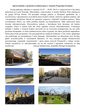 Sprawozdanie z praktyki zrealizowanej w ramach Programu Erasmus Swoją praktykę odbyłam w terminie 01.07. – 30.09. 2015r w miejscowości Cap Salou położonej na Costa Dourada. Mieszkałam i pracowałam w hotelu Molinos Park należącym do grupy H*Top Hotels. Od początku mojego pobytu w Hiszpanii spotkałam się z życzliwością i uprzejmością wszystkich pracowników hotelu. Zarówno opiekun praktyk jak i bezpośredni przełożeni dawali mi ogromne wsparcie i udzielali wszelkiej pomocy. Moje wcześniejsze obawy czy sobie poradzę okazały się bezpodstawne. Miło zaskoczyła mnie kwestia zakwaterowania. Dwuosobowe pokoje z łazienkami były skromne, ale bardzo wygodne. Praca w hotelu była dla mnie zupełnie nowym doświadczeniem. Codzienny kontakt z ludźmi z różnych krajów pozwolił mi na ćwiczenie posługiwania się nie tylko językiem hiszpański, co było podstawowym celem wyjazdu, ale także językiem angielskim. Sama praca była przyjemna i nie przysparzała mi żadnych trudności. Czas wolny spędzałam zaś podróżując po przepięknym Costa Dourada. Odwiedziłam też Barcelonę oraz Sevillę, gdzie uczestniczyłam w warsztatach flamenco. Te trzy miesiące minęły błyskawicznie pozostawiając wspaniałe wspomnienia i spore grono nowych Przyjaciół z całego świata. Jestem szczęśliwa, że zdecydowałam się na ten wyjazd i ogromnie wdzięczna za taką możliwość. Justyna Jakubowska, studentka filologii hiszpańskiej