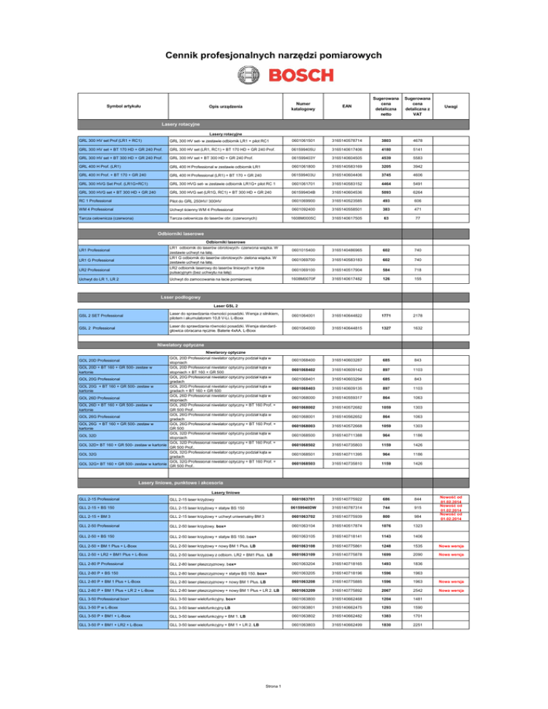 Cennik profesjonalnych narzędzi pomiarowych Symbol artykułu Opis urządzenia Numer katalogowy EAN Sugerowana cena detaliczna netto Sugerowana cena detaliczna z VAT Uwagi Lasery rotacyjne Lasery rotacyjne GRL 300 HV set Prof (LR1 + RC1) GRL 300 HV set- w zestawie odbiornik LR1 + pilot RC1 0601061501 3165140578714 3803 4678 GRL 300 HV set + BT 170 HD + GR 240 Prof. GRL 300 HV set (LR1, RC1) + BT 170 HD + GR 240 Prof. 061599405U 3165140617406 4180 5141 GRL 300 HV set + BT 300 HD + GR 240 Prof. GRL 300 HV set + BT 300 HD + GR 240 Prof. 061599403Y 3165140604505 4539 5583 GRL 400 H Prof. (LR1) GRL 400 H Professional w zestawie odbiornik LR1 0601061800 3165140583169 3205 3942 GRL 400 H Prof. + BT 170 + GR 240 GRL 400 H Professional (LR1) + BT 170 + GR 240 061599403U 3165140604406 3745 4606 GRL 300 HVG Set Prof. (LR1G+RC1) GRL 300 HVG set- w zestawie odbiornik LR1G+ pilot RC 1 0601061701 3165140583152 4464 5491 GRL 300 HVG set + BT 300 HD + GR 240 GRL 300 HVG set (LR1G, RC1) + BT 300 HD + GR 240 061599404B 3165140604536 5093 6264 RC 1 Professional Pilot do GRL 250HV/ 300HV 0601069900 3165140523585 493 606 WM 4 Professional Uchwyt ścienny WM 4 Professional 0601092400 3165140558501 383 471 Tarcza celownicza (czerwona) Tarcza celownicza do laserów obr. (czerwonych) 1608M0005C 3165140617505 63 77 0601015400 3165140486965 602 740 0601069700 3165140583183 602 740 0601069100 3165140517904 584 718 1608M0070F 3165140617482 126 155 Odbiorniki laserowe Odbiorniki laserowe LR1 odbiornik do laserów obrotowych- czerwona wiązka. W zestawie uchwyt na łatę. LR1 G odbiornik do laserów obrotowych- zielona wiązka. W zestawie uchwyt na łatę. LR2 odbiornik laserowy do laserów liniowych w trybie pulsacyjnym (bez uchwytu na łatę) LR1 Professional LR1 G Professional LR2 Professional Uchwyt do zamocowania na łacie pomiarowej Uchwyt do LR 1, LR 2 Lsser podłogowy Laser GSL 2 GSL 2 SET Professional Laser do sprawdzania równości posadzki. Wersja z silnikiem, pilotem i akumulatorem 10,8 V-Li. L-Boxx 0601064001 3165140644822 1771 2178 GSL 2 Professional Laser do sprawdzania równości posadzki. Wersja standardgłowica obracana ręcznie. Baterie 4xAA. L-Boxx 0601064000 3165140644815 1327 1632 0601068400 3165140603287 685 843 0601068402 3165140609142 897 1103 0601068401 3165140603294 685 843 0601068403 3165140609135 897 1103 0601068000 3165140559317 864 1063 0601068002 3165140572682 1059 1303 0601068001 3165140562652 864 1063 0601068003 3165140572668 1059 1303 0601068500 3165140711388 964 1186 0601068502 3165140735803 1159 1426 0601068501 3165140711395 964 1186 0601068503 3165140735810 1159 1426 Niwelatory optyczne Niwelarory optyczne GOL 20D Professional niwelator optyczny podział kąta w stopniach GOL 20D + BT 160 + GR 500- zestaw w GOL 20D Professional niwelator optyczny podział kąta w kartonie stopniach + BT 160 + GR 500 GOL 20G Professional niwelator optyczny podział kąta w GOL 20G Professional gradach GOL 20G + BT 160 + GR 500- zestaw w GOL 20G Professional niwelator optyczny podział kąta w kartonie gradach + BT 160 + GR 500 GOL 26D Professional niwelator optyczny podzial kąta w GOL 26D Professional stopniach GOL 26D + BT 160 + GR 500- zestaw w GOL 26D Professional niwelator optyczny + BT 160 Prof. + kartonie GR 500 Prof.. GOL 26G Professional niwelator optyczny podział kąta w GOL 26G Professional gradach GOL 26G + BT 160 + GR 500- zestaw w GOL 26G Professional niwelator optyczny + BT 160 Prof. + kartonie GR 500 GOL 32D Professional niwelator optyczny podzial kąta w GOL 32D stopniach GOL 32D Professional niwelator optyczny + BT 160 Prof. + GOL 32D+ BT 160 + GR 500- zestaw w kartonie GR 500 Prof.. GOL 32G Professional niwelator optyczny podział kąta w GOL 32G gradach GOL 32G Professional niwelator optyczny + BT 160 Prof. + GOL 32G+ BT 160 + GR 500- zestaw w kartonie GR 500 Prof.. GOL 20D Professional Lasery liniowe, punktowe i akcesoria Lasery liniowe Nowość od 01.02.2014 Nowość od 01.02.2014 Nowość od 01.02.2014 GLL 2-15 Professional GLL 2-15 laser krzyżowy 0601063701 3165140775922 686 844 GLL 2-15 + BS 150 GLL 2-15 laser krzyżowy + statyw BS 150 06159940DW 3165140787314 744 915 GLL 2-15 + BM 3 GLL 2-15 laser krzyżowy + uchwyt uniwersalny BM 3 0601063702 3165140775939 800 984 GLL 2-50 Professional GLL 2-50 laser krzyżowy. box+ 0601063104 3165140517874 1076 1323 GLL 2-50 + BS 150 GLL 2-50 laser krzyżowy + statyw BS 150. box+ 0601063105 3165140718141 1143 1406 GLL 2-50 + BM 1 Plus + L-Boxx GLL 2-50 laser krzyżowy + nowy BM 1 Plus. LB 0601063108 3165140775861 1248 1535 Nowa wersja GLL 2-50 + LR2 + BM1 Plus + L-Boxx GLL 2-50 laser krzyzowy z odbiorn. LR2 + BM1 Plus. LB 0601063109 3165140775878 1699 2090 Nowa wersja GLL 2-80 P Professional GLL 2-80 laser płaszczyznowy. box+ 0601063204 3165140718165 1493 1836 GLL 2-80 P + BS 150 GLL 2-80 laser płaszczyznowy + statyw BS 150. box+ 0601063205 3165140718196 1596 1963 GLL 2-80 P + BM 1 Plus + L-Boxx GLL 2-80 laser plaszczyznowy + nowy BM 1 Plus. LB 0601063208 3165140775885 1596 1963 Nowa wersja GLL 2-80 P + BM 1 Plus + LR 2 + L-Boxx GLL 2-80 laser płaszczyznowy + nowy BM 1 Plus + LR 2. LB 0601063209 3165140775892 2067 2542 Nowa wersja GLL 3-50 Professional box+ GLL 3-50 laser wielofunkcyjny. box+ 0601063800 3165140662468 1204 1481 GLL 3-50 P w L-Boxx GLL 3-50 laser wielofunkcyjny LB 0601063801 3165140662475 1293 1590 GLL 3-50 P + BM1 + L-Boxx GLL 3-50 laser wielofunkcyjny + BM 1. LB 0601063802 3165140662482 1383 1701 GLL 3-50 P + BM1 + LR2 + L-Boxx GLL 3-50 laser wielofunkcyjny + BM 1 + LR 2. LB 0601063803 3165140662499 1830 2251 Strona 1 GLL 3-80 P Professional GLL 3-80 laser płaszczyznowy. box+ 0601063305 3165140718172 1910 2349 GLL 3-80 P + BS 150 GLL 3-80 laser płaszczyznowy + statyw BS 150. box+ 0601063306 3165140718189 2029 2496 GLL 3-80 P + BM1 + L-Boxx GLL 3-80 laser płaszczyznowy + nowy BM 1 Plus 1. LB 0601063309 3165140775908 2029 2496 Nowa wersja GLL 3-80 P + BM1 + LR2 + L-Boxx GLL 3-80 laser płaszczyznowy +nowy BM 1 Plus 