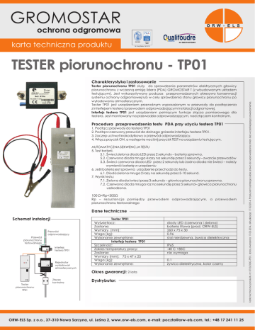 GROMOSTAR ochrona odgromowa karta techniczna produktu Nr Certyfikatu: NC-310 TESTER piorunochronu - TP01 Tester piorunochronu TP01 służy do sprawdzania parametrów elektrycznych głowicy piorunochronu z wczesną emisją lidera (PDA) GROMOSTAR T (z wbudowanym układem testującym). Jest wykorzystywany podczas przeprowadzanych okresowo konserwacji systemu ochrony odgromowej lub w celu sprawdzenia stanu głowicy piorunochronu po wyładowaniu atmosferycznym. Tester TP01 jest urządzeniem przenośnym wyposażonym w przewody do podłączenia z interfejsem testera i przewodem odprowadzającym instalacji odgromowej. Interfejs testera TP01 jest urządzeniem pełniącym funkcje złącza pomiarowego dla testera. Jest montowany na przewodzie odprowadzającym, nad złączem kontrolnym. Procedura przeprowadzenia testu PDA przy użyciu testera TP01 1. Podłącz przewody do testera TP01 2. Podłącz czerwony przewód do dolnego gniazda interfejsu testera TP01. 3. Zaczep uchwyt krokodylkowy o przewód odprowadzający. 4. Włącz przycisk ON, a następnie naciśnij przycisk TEST na urządzeniu testującym. AUTOMATYCZNA SEKWENCJA TESTU 5. Test baterii. 5.1. Świeci zielona dioda LED przez 2 sekundy – bateria sprawna. 5.2. Czerwona dioda mruga 4 razy na sekundę przez 3 sekundy – zwarcie przewodów 5.3. Świeci czerwona dioda LED przez 2 sekundy lub żadna dioda nie świeci – należy wymienić baterię w urządzeniu 6. Jeśli bateria jest sprawna urządzenie przechodzi do testu. 6.1. Dioda zielona mruga 2 razy na sekundę przez 5-10 sekund. 7. Wynik testu: 7.1. Zielona dioda świeci przez 3 sekundy – głowica piorunochronu sprawna. 7.2. Czerwona dioda mruga raz na sekundę przez 5 sekund– głowica piorunochronu uszkodzona. 100 Ω<Rp<300Ω Rp – rezystancja pomiędzy przewodem odprowadzającym, a przewodem piorunochronu testowalnego Dane techniczne Schemat instalacji Przewód odprowadzający Przewód piorunochronu testowalnego Interfejs testera TP01 0 0 0 1 Rejestrator wyładowań atmosferycznych Tester TP01 Wyświetlacz: Zasilanie: Wymiary [mm]: Waga [kg]: Wykonanie zewnętrzne: Interfejs testera TP01 Szczelność: Zakres temperatury pracy: Zasilanie: Wymiary [mm]: 75 x 47 x 25 Waga [kg]: Wykonanie zewnętrzne: diody LED (czerwona i zielona) bateria litowa (prod. ORW-ELS) 260 x 75 x 30 0.96 stal nierdzewna, żywica dielektryczna IP65 -40 C +85C nie wymaga 0.1 żywica dielektryczna, kolor czarny Okres gwarancji: 2 lata Tester piorunochronu TP01 Złącze kontrolne Dystrybutor: ORW-ELS Sp. z o.o., 37-310 Nowa Sarzyna, ul. Leśna 2, www.orw-els.com, e-mail: [email protected], tel.: +48 17 241 11 25 Karta techniczna produktu nr: KT15/ODG-TP01, data utworzenia: 17-02-2014, aktualizacja: 17-02-2014. Producent zastrzega sobie prawo do wprowadzania zmian bez wcześniejszego zawiadomienia. Charakterystyka i zastosowanie