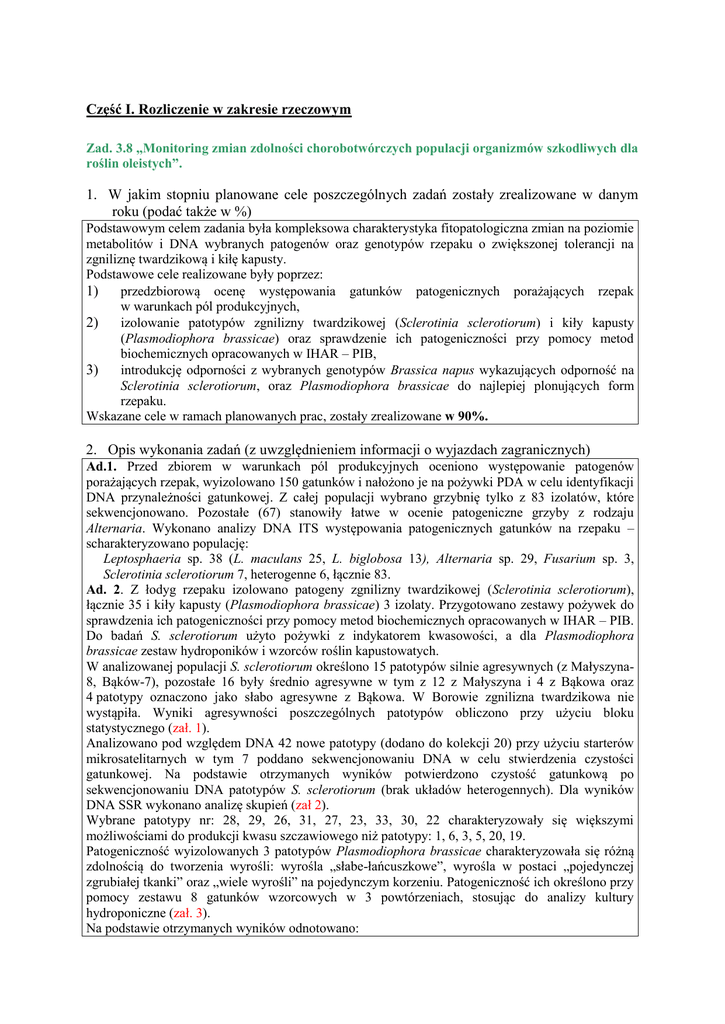 Część I. Rozliczenie w zakresie rzeczowym Zad. 3.8 „Monitoring zmian zdolności chorobotwórczych populacji organizmów szkodliwych dla roślin oleistych”. 1. W jakim stopniu planowane cele poszczególnych zadań zostały zrealizowane w danym roku (podać także w %) Podstawowym celem zadania była kompleksowa charakterystyka fitopatologiczna zmian na poziomie metabolitów i DNA wybranych patogenów oraz genotypów rzepaku o zwiększonej tolerancji na zgniliznę twardzikową i kiłę kapusty. Podstawowe cele realizowane były poprzez: 1) przedzbiorową ocenę występowania gatunków patogenicznych porażających rzepak w warunkach pól produkcyjnych, 2) izolowanie patotypów zgnilizny twardzikowej (Sclerotinia sclerotiorum) i kiły kapusty (Plasmodiophora brassicae) oraz sprawdzenie ich patogeniczności przy pomocy metod biochemicznych opracowanych w IHAR – PIB, 3) introdukcję odporności z wybranych genotypów Brassica napus wykazujących odporność na Sclerotinia sclerotiorum, oraz Plasmodiophora brassicae do najlepiej plonujących form rzepaku. Wskazane cele w ramach planowanych prac, zostały zrealizowane w 90%. 2. Opis wykonania zadań (z uwzględnieniem informacji o wyjazdach zagranicznych) Ad.1. Przed zbiorem w warunkach pól produkcyjnych oceniono występowanie patogenów porażających rzepak, wyizolowano 150 gatunków i nałożono je na pożywki PDA w celu identyfikacji DNA przynależności gatunkowej. Z całej populacji wybrano grzybnię tylko z 83 izolatów, które sekwencjonowano. Pozostałe (67) stanowiły łatwe w ocenie patogeniczne grzyby z rodzaju Alternaria. Wykonano analizy DNA ITS występowania patogenicznych gatunków na rzepaku – scharakteryzowano populację: Leptosphaeria sp. 38 (L. maculans 25, L. biglobosa 13), Alternaria sp. 29, Fusarium sp. 3, Sclerotinia sclerotiorum 7, heterogenne 6, łącznie 83. Ad. 2. Z łodyg rzepaku izolowano patogeny zgnilizny twardzikowej (Sclerotinia sclerotiorum), łącznie 35 i kiły kapusty (Plasmodiophora brassicae) 3 izolaty. Przygotowano zestawy pożywek do sprawdzenia ich patogeniczności przy pomocy metod biochemicznych opracowanych w IHAR – PIB. Do badań S. sclerotiorum użyto pożywki z indykatorem kwasowości, a dla Plasmodiophora brassicae zestaw hydroponików i wzorców roślin kapustowatych. W analizowanej populacji S. sclerotiorum określono 15 patotypów silnie agresywnych (z Małyszyna8, Bąków-7), pozostałe 16 były średnio agresywne w tym z 12 z Małyszyna i 4 z Bąkowa oraz 4 patotypy oznaczono jako słabo agresywne z Bąkowa. W Borowie zgnilizna twardzikowa nie wystąpiła. Wyniki agresywności poszczególnych patotypów obliczono przy użyciu bloku statystycznego (zał. 1). Analizowano pod względem DNA 42 nowe patotypy (dodano do kolekcji 20) przy użyciu starterów mikrosatelitarnych w tym 7 poddano sekwencjonowaniu DNA w celu stwierdzenia czystości gatunkowej. Na podstawie otrzymanych wyników potwierdzono czystość gatunkową po sekwencjonowaniu DNA patotypów S. sclerotiorum (brak układów heterogennych). Dla wyników DNA SSR wykonano analizę skupień (zał 2). Wybrane patotypy nr: 28, 29, 26, 31, 27, 23, 33, 30, 22 charakteryzowały się większymi możliwościami do produkcji kwasu szczawiowego niż patotypy: 1, 6, 3, 5, 20, 19. Patogeniczność wyizolowanych 3 patotypów Plasmodiophora brassicae charakteryzowała się różną zdolnością do tworzenia wyrośli: wyrośla „słabe-łańcuszkowe”, wyrośla w postaci „pojedynczej zgrubiałej tkanki” oraz „wiele wyrośli” na pojedynczym korzeniu. Patogeniczność ich określono przy pomocy zestawu 8 gatunków wzorcowych w 3 powtórzeniach, stosując do analizy kultury hydroponiczne (zał. 3). Na podstawie otrzymanych wyników odnotowano: Najsłabiej porażane były wzorce przez zarodniki pływkowe pochodzące z „dużych wyrośli”, które wyrastały na wielu korzeniach, średnia liczba porażeń dotyczyła „pojedynczej wyrośli”. Najwięcej porażeń odnotowano z wyrośli „słabych-łańcuszkowych” (1 test). Ad. 3. Podjęto próby przeniesienia odporności poprzez krzyżowanie z wybranych genotypów Brassica napus wykazujących odporność na Sclerotinia sclerotiorum (udanych krzyżowań 20), oraz Plasmodiophora brassicae (udanych krzyżowań 12) do najlepiej plonujących form rzepaku. Otrzymane nasiona przeselekcjonowanych genotypów rzepaku wysiano w warunkach szklarniowych. Z uwagi na etiologię patogena dopiero w okresie kwitnienia roślin zostanie wykonana inokulacja i analiza odporności na porażenie powodowane przez Sclerotinia sclerotiorum. Ponadto w warunkach polowych wykonano badania odporności na porażenie powodowane przez S. sclerotiorum na 21 odmianach rzepaku (1 test). Do inokulacji użyto średnio agresywnego patotypu (Ss-3), którego czystość gatunkową potwierdzono analizą DNA. Najodporniejsze były odmiany: 1-Marcopolos, 2-DH I, 3-DK Exquisite, 4-DK Exstorm, 5-Inspiration, 6-Tores, 7-SY Kolumb, 8-Visby F1, 9-NK Petrol, 10-Monolit, Silnie porażone: 11-DK Explicit, 12-DK Excellium, 13-PR44W29, 14-Marathon, 15-Bonanza,16-Arsenal F1, 17-DH II, 18-Idol, 19-SY Cassidy, 20-Star 105, 127, Chic 11, 21-Bolko. Po badaniach wyniki oszacowano statystycznie (wykres statystyczny bloku zał. 4) i wskazano najodporniejsze odmiany rzepaku ozimego na zgniliznę twardzikową. Testem hydroponicznym (mieszaniną patotypów) sprawdzono odporność roślin z krzyżowań B. napus na Plasmodiophora brassicae. Po analizie wyników stwierdzono: najbardziej odporne rośliny to te, których formy mateczne pochodziły z odmian: Pamela x B.n., Lohana x B.n., Sherpa x B.n. Silnie porażane: DK Explicit x B.n., DK Excellium x B.n. (1 test). Podczas ekspedycji na pola produkcyjne z rzepakiem prowadzono badania występowania najgroźniejszych patogenów B. napus oraz pobierano eksplantaty porażonych roślin w celu ich izolacji oraz bonitowano odporność wybranych genotypów rzepaku: 15.07.2015. Małyszyn, bonitacja S. scle