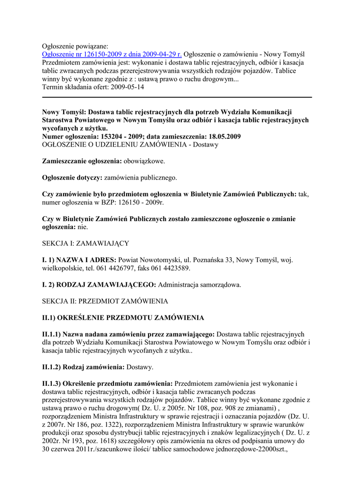Ogłoszenie powiązane: Ogłoszenie nr 126150-2009 z dnia 2009-04-29 r. Ogłoszenie o zamówieniu - Nowy Tomyśl Przedmiotem zamówienia jest: wykonanie i dostawa tablic rejestracyjnych, odbiór i kasacja tablic zwracanych podczas przerejestrowywania wszystkich rodzajów pojazdów. Tablice winny być wykonane zgodnie z : ustawą prawo o ruchu drogowym... Termin składania ofert: 2009-05-14 Nowy Tomyśl: Dostawa tablic rejestracyjnych dla potrzeb Wydziału Komunikacji Starostwa Powiatowego w Nowym Tomyślu oraz odbiór i kasacja tablic rejestracyjnych wycofanych z uŜytku. Numer ogłoszenia: 153204 - 2009; data zamieszczenia: 18.05.2009 OGŁOSZENIE O UDZIELENIU ZAMÓWIENIA - Dostawy Zamieszczanie ogłoszenia: obowiązkowe. Ogłoszenie dotyczy: zamówienia publicznego. Czy zamówienie było przedmiotem ogłoszenia w Biuletynie Zamówień Publicznych: tak, numer ogłoszenia w BZP: 126150 - 2009r. Czy w Biuletynie Zamówień Publicznych zostało zamieszczone ogłoszenie o zmianie ogłoszenia: nie. SEKCJA I: ZAMAWIAJĄCY I. 1) NAZWA I ADRES: Powiat Nowotomyski, ul. Poznańska 33, Nowy Tomyśl, woj. wielkopolskie, tel. 061 4426797, faks 061 4423589. I. 2) RODZAJ ZAMAWIAJĄCEGO: Administracja samorządowa. SEKCJA II: PRZEDMIOT ZAMÓWIENIA II.1) OKREŚLENIE PRZEDMOTU ZAMÓWIENIA II.1.1) Nazwa nadana zamówieniu przez zamawiającego: Dostawa tablic rejestracyjnych dla potrzeb Wydziału Komunikacji Starostwa Powiatowego w Nowym Tomyślu oraz odbiór i kasacja tablic rejestracyjnych wycofanych z uŜytku.. II.1.2) Rodzaj zamówienia: Dostawy. II.1.3) Określenie przedmiotu zamówienia: Przedmiotem zamówienia jest wykonanie i dostawa tablic rejestracyjnych, odbiór i kasacja tablic zwracanych podczas przerejestrowywania wszystkich rodzajów pojazdów. Tablice winny być wykonane zgodnie z ustawą prawo o ruchu drogowym( Dz. U. z 2005r. Nr 108, poz. 908 ze zmianami) , rozporządzeniem Ministra Infrastruktury w sprawie rejestracji i oznaczania pojazdów (Dz. U. z 2007r. Nr 186, poz. 1322), rozporządzeniem Ministra Infrastruktury w sprawie warunków produkcji oraz sposobu dystrybucji tablic rejestracyjnych i znaków legalizacyjnych ( Dz. U. z 2002r. Nr 193, poz. 1618) szczegółowy opis zamówienia na okres od podpisania umowy do 30 czerwca 2011r./szacunkowe ilości/ tablice samochodowe jednorzędowe-22000szt., samochodowe dwurzędowe-1000szt., jednorzędowe do przyczep-2000szt., dwurzędowe do przyczep-300szt., motocyklowe-800szt., motorowerowe-400szt., tymczasowe samochodowe jednorzędowe-100szt., zabytkowe samochodowe jednorzędowe-10szt., zabytkowe samochodowe dwurzędowe-10szt., zabytkowe motocyklowe-10szt., indywidualne samochodowe jednorzędowe-50szt., indywidualne samochodowe dwurzędowe-5szt., indywidualne motocyklowe-5szt., Miejscem dostawy i odbioru tabli jest Starostwo Powiatowe w Nowym Tomyślu przy ul. Poznańskiej 33, budynek D, Wydział Komunikacji. Wykonawca udzieli gwarancji na okres 36 miesięcy na dostarczony towar. Wielkość i zakres ilości i rodzaju zamawianych tablic wynikać będzie z bieŜących potrzeb. Czas dostawy do 5 dni od daty otrzymania zamówienia. Wykonawca ponosi pełną odpowiedzialność za wykonanie zadania. Wykonawca zobowiązuje się do odbierania i złomowania tablic rejestracyjnych zebranych przez Zamawiającego w czasie przerejestrowywania i wycofywania pojazdów z ruchu w ciągu siedmiu dni od powiadomienia, na swój własny koszt.. II.1.4) Wspólny Słownik Zamówień (CPV): 44.42.34.00-5. II.1.5) Całkowita końcowa wartość zamówienia (bez VAT) obejmująca wszystkie zamówienia i części: 491260.00 PLN. SEKCJA IV: PROCEDURA IV.1) TRYB UDZIELENIA ZAMÓWIENIA: Przetarg nieograniczony IV.2) INFORMACJE ADMINISTRACYJNE • Zamówienie dotyczy projektu/programu finansowanego ze środków Unii Europejskiej: nie SEKCJA V: UDZIELENIE ZAMÓWIENIA V.1) DATA UDZIELENIA ZAMÓWIENIA: 15.05.2009. V.2) LICZBA OTRZYMANYCH OFERT: 1. V.3) NAZWA I ADRES WYKONAWCY, KTÓREMU UDZIELONO ZAMÓWIENIA: • UTAL sp. z o.o., Gruszczyn, ul. Katarzyńska 9,, 62-006 Kobylnica, kraj/woj. wielkopolskie. V.4) INFORMACJA O CENIE WYBRANEJ OFERTY ORAZ O NIE PODLEGAJĄCYCH ODRZUCENIU OFERTACH Z NAJNIśSZĄ I NAJWYśSZĄ CENĄ (bez VAT) • • • Cena wybranej oferty: 491260.00 Oferta z najniŜszą ceną: 491260.00 oferta z najwyŜszą ceną: 491260.00 Waluta: PLN.