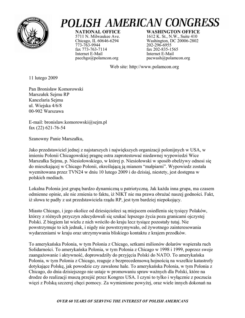 NATIONAL OFFICE 5711 N. Milwaukee Ave. Chicago, IL 60646-6294 773-763-9944 fax 773-763-7114 Internet E-Mail [email protected] WASHINGTON OFFICE 1612 K. St., N.W., Suite 410 Washington, DC 20006-2802 202-296-6955 fax 202-835-1565 Internet E-Mail [email protected] Web site: http://www.polamcon.org 11 lutego 2009 Pan Bronisław Komorowski Marszałek Sejmu RP Kancelaria Sejmu ul. Wiejska 4/6/8 00-902 Warszawa E-mail: [email protected] fax (22) 621-76-54 Szanowny Panie Marszałku, Jako przedstawiciel jednej z najstarszych i największych organizacji polonijnych w USA, w imieniu Polonii Chicagowskiej pragnę ostra zaprotestować niedawnej wypowiedzi Wice Marszałka Sejmu, p. Niesiołowskiego, w której p. Niesiołowski w sposób obelżywy odnosi się do mieszkającej w Chicago Polonii, określającą ją mianem “małpiarni”. Wypowiedz została wyemitowana przez TVN24 w dniu 10 lutego 2009 i do dzisiaj, niestety, jest dostępna w polskich mediach. Lokalna Polonia jest grupą bardzo dynamiczną u patriotyczną. Jak każda inna grupa, ma czasem odmienne opinie, ale nie zmienia to faktu, iż NIKT nie ma prawa obrażać naszej godności. Fakt, iż słowa te padły z ust przedstawiciela rządu RP, jest tym bardziej niepokojący. Miasto Chicago, i jego okolice od dziesięcioleci są miejscem osiedlenia się tysięcy Polaków, którzy z różnych przyczyn zdecydowali się szukać lepszego życia poza granicami ojczystej Polski. Z biegiem lat wielu z nich wróciło do kraju lecz tysiące pozostały tutaj. Nie powstrzymuje to ich jednak, i nigdy nie powstrzymywało, od żywotnego zainteresowania wydarzeniami w kraju oraz utrzymywania bliskiego kontaktu z krajem przodków. To amerykańska Polonia, w tym Polonia z Chicago, setkami milionów dolarów wspierała ruch Solidarności. To amerykańska Polonia, w tym Polonia z Chicago w 1998 i 1999, poprzez swoje zaangażowanie i aktywność, doprowadziły do przyjęcia Polski do NATO. To amerykańska Polonia, w tym Polonia z Chicago, reaguje z bezprecedensową hojnością na wszelkie katastrofy dotykające Polskę, jak powodzie czy zawalone hale. To amerykańska Polonia, w tym Polonia z Chicago, do dnia dzisiejszego nie ustaje w promowaniu spraw ważnych dla Polski, które na drodze do realizacji muszą przejść przez Kongres USA. I czyni to tylko i wyłącznie z poczucia więzi z Polską szczerej chęci pomocy. Za wymienione powyżej, oraz wiele innych dokonań na OVER 60 YEARS OF SERVING THE INTEREST OF POLISH AMERICANS rzecz Polski, których ze względu na obszerność nie będę wymieniał, amerykańska Polonia, w tym Polonia z Chicago, zasługuje na nieustające uznanie. Od chwili wypowiedzi p. Niesiołowskiego, biura naszej organizacji zostały dosłownie zasypane lawiną telefonów, faxów i wiadomości e-mail od oburzonych, rozgoryczonych i głęboko dotkniętych członków lokalnej Polonii. W trakcie jednej z wypowiedzi p. Niesiołowski powiedział: “wylewanie pomyj na wspaniałych ludzi jest polską normą polityczną”. Jak widać, i niestety, zachowanie p. Niesiołowskiego doskonale mieści się w zakresie tej normy. Rozumiem, iż w późniejszych wypowiedziach p. Niesiołowski próbował załagodzić obelżywość sformułowania. Obawiam się jednak, iż samo “łagodzenie” wypowiedzi nie wystarczy. Oczekujemy ze strony p. Niesiołowskiego oficjalnych, szybkich, i wyczerpujących przeprosin w mediach polskich i lokalnych w Chicago. Z poważaniem, Frank J. Spula Prezes