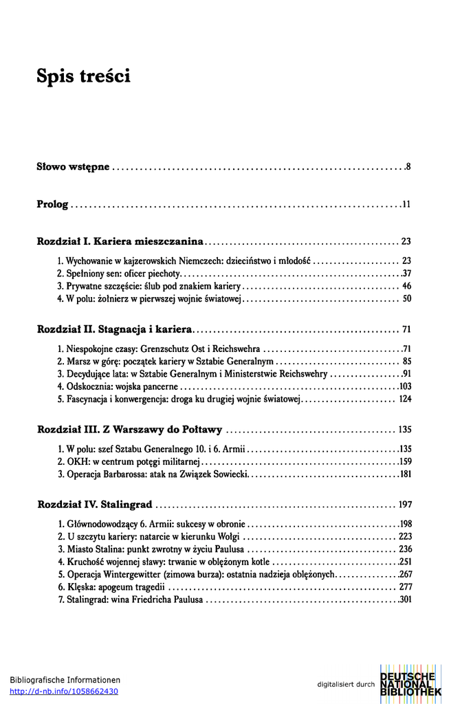 Spis treści Słowo wstępne 8 Prolog 11 Rozdział I. Kariera mieszczanina 23 1. Wychowanie w kajzerowskich Niemczech: dzieciństwo i młodość 2. Spełniony sen: oficer piechoty 3. Prywatne szczęście: ślub pod znakiem kariery 4. W polu: żołnierz w pierwszej wojnie światowej Rozdział II. Stagnacja i kariera 1. Niespokojne czasy: Grenzschutz Ost i Reichswehra 2. Marsz w górę: początek kariery w Sztabie Generalnym 3. Decydujące lata: w Sztabie Generalnym i Ministerstwie Reichswehry 4. Odskocznia: wojska pancerne 5. Fascynacja i konwergencja: droga ku drugiej wojnie światowej Rozdział III. Z Warszawy do Połtawy 1. W polu: szef Sztabu Generalnego 10. i 6. Armii 2. OKH: w centrum potęgi militarnej 3. Operacja Barbarossa: atak na Związek Sowiecki Rozdział IV. Stalingrad 1. Głównodowodzący 6. Armii: sukcesy w obronie 2. U szczytu kariery: natarcie w kierunku Wołgi 3. Miasto Stalina: punkt zwrotny w życiu Paulusa 4. Kruchość wojennej sławy: trwanie w oblężonym kotle 5. Operacja Wintergewitter (zimowa burza): ostatnia nadzieja oblężonych 6. Klęska: apogeum tragedii 7. Stalingrad: wina Friedricha Paulusa http://d-nb.info/1058662430 23 37 46 50 71 71 85 91 103 124 135 135 159 181 197 198 223 236 251 267 277 301 Rozdział V. Dziesięć lat sowieckiej niewoli 1. „Apolityczny": krnąbrny jeniec 2. Zrozumienie: wstąpienie do Związku Oficerów Niemieckich i skutki tego kroku 3. Zdrada czy autorefleksja? Procesy norymberskie 4. W złotej klatce: zmagania o powrót Rozdział VI. W domu, w zupełnie innym świecie 1. Nowy brzeg: powrót do kraju 2. Samoobrona: życie feldmarszałka w NRD 3. Misja: Paulus jako historyk wojskowy 4. Figura na szachownicy: element w politycznych kalkulacjach NRD 5. Ostatnia ofensywa: spotkanie oficerów 6. W głębokiej depresji: choroba i śmierć 305 308 324 351 370 385 385 397 413 424 440 456 Epilog 463 Przypisy 469 Ważniejsze skróty 533 Skrótowe określenia wydziałów w sztabach dowodzenia Wojsk Lądowych Zarząd do spraw Wojsk (Reichswehra/Wojska Lądowe) Wykaz źródeł i literatury I. Wykorzystane archiwa i zbiory archiwalne II. Źródła drukowane i literatura III. Niepublikowane materiały i manuskrypty IV. Wywiady ze świadkami historii 534 535 536 536 542 565 566 Spis map 567 Źródła zdjęć 568