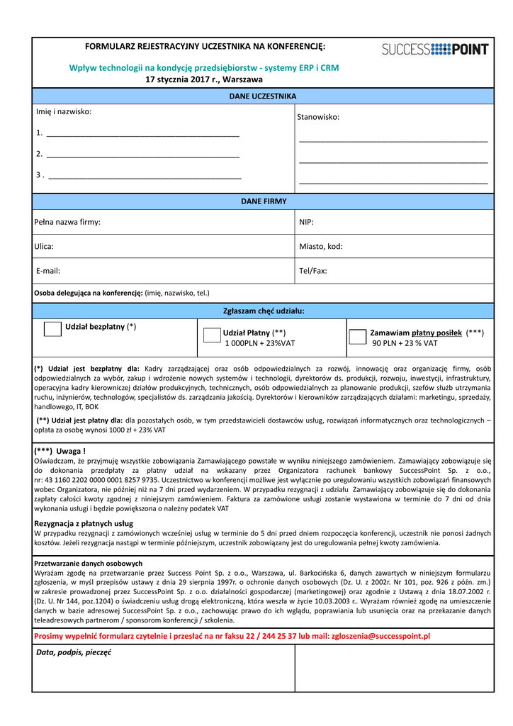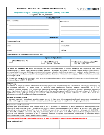 FORMULARZ REJESTRACYJNY UCZESTNIKA NA KONFERENCJĘ: Wpływ technologii na kondycję przedsiębiorstw - systemy ERP i CRM 17 stycznia 2017 r., Warszawa DANE UCZESTNIKA Imię i nazwisko: Stanowisko: 1. _____________________________________________ ____________________________________________ 2. _____________________________________________ ____________________________________________ 3 . _____________________________________________ ____________________________________________ DANE FIRMY Pełna nazwa firmy: NIP: Ulica: Miasto, kod: E-mail: Tel/Fax: Osoba delegująca na konferencję: (imię, nazwisko, tel.) Zgłaszam chęć udziału: Udział bezpłatny (*) Udział Płatny (**) 1 000PLN + 23%VAT Zamawiam płatny posiłek (***) 90 PLN + 23 % VAT (*) Udział jest bezpłatny dla: Kadry zarządzającej oraz osób odpowiedzialnych za rozwój, innowację oraz organizację firmy, osób odpowiedzialnych za wybór, zakup i wdrożenie nowych systemów i technologii, dyrektorów ds. produkcji, rozwoju, inwestycji, infrastruktury, operacyjna kadry kierowniczej działów produkcyjnych, technicznych, osób odpowiedzialnych za planowanie produkcji, szefów służb utrzymania ruchu, inżynierów, technologów, specjalistów ds. zarządzania jakością. Dyrektorów i kierowników zarządzających działami: marketingu, sprzedaży, handlowego, IT, BOK (**) Udział jest płatny dla: dla pozostałych osób, w tym przedstawicieli dostawców usług, rozwiązań informatycznych oraz technologicznych – opłata za osobę wynosi 1000 zł + 23% VAT (***) Uwaga ! Oświadczam, że przyjmuję wszystkie zobowiązania Zamawiającego powstałe w wyniku niniejszego zamówieniem. Zamawiający zobowiązuje się do dokonania przedpłaty za płatny udział na wskazany przez Organizatora rachunek bankowy SuccessPoint Sp. z o.o., nr: 43 1160 2202 0000 0001 8257 9735. Uczestnictwo w konferencji możliwe jest wyłącznie po uregulowaniu wszystkich zobowiązań finansowych wobec Organizatora, nie później niż na 7 dni przed wydarzeniem. W przypadku rezygnacji z udziału Zamawiający zobowiązuje się do dokonania zapłaty całości kwoty zgodnej z niniejszym zamówieniem. Faktura za zamówione usługi zostanie wystawiona w terminie do 7 dni od dnia wykonania usługi i będzie powiększona o należny podatek VAT Rezygnacja z płatnych usług W przypadku rezygnacji z zamówionych wcześniej usług w terminie do 5 dni przed dniem rozpoczęcia konferencji, uczestnik nie ponosi żadnych kosztów. Jeżeli rezygnacja nastąpi w terminie późniejszym, uczestnik zobowiązany jest do uregulowania pełnej kwoty zamówienia. Przetwarzanie danych osobowych Wyrażam zgodę na przetwarzanie przez Success Point Sp. z o.o., Warszawa, ul. Barkocińska 6, danych zawartych w niniejszym formularzu zgłoszenia, w myśl przepisów ustawy z dnia 29 sierpnia 1997r. o ochronie danych osobowych (Dz. U. z 2002r. Nr 101, poz. 926 z późn. zm.) w zakresie prowadzonej przez SuccessPoint Sp. z o.o. działalności gospodarczej (marketingowej) oraz zgodnie z Ustawą z dnia 18.07.2002 r. (Dz. U. Nr 144, poz.1204) o świadczeniu usług drogą elektroniczną, która weszła w życie 10.03.2003 r.. Wyrażam również zgodę na umieszczenie danych w bazie adresowej SuccessPoint Sp. z o.o., zachowując prawo do ich wglądu, poprawiania lub usunięcia oraz na przekazanie danych teleadresowych partnerom / sponsorom konferencji / szkolenia. Prosimy wypełnić formularz czytelnie i przesłać na nr faksu 22 / 244 25 37 lub mail: [email protected] Data, podpis, pieczęć