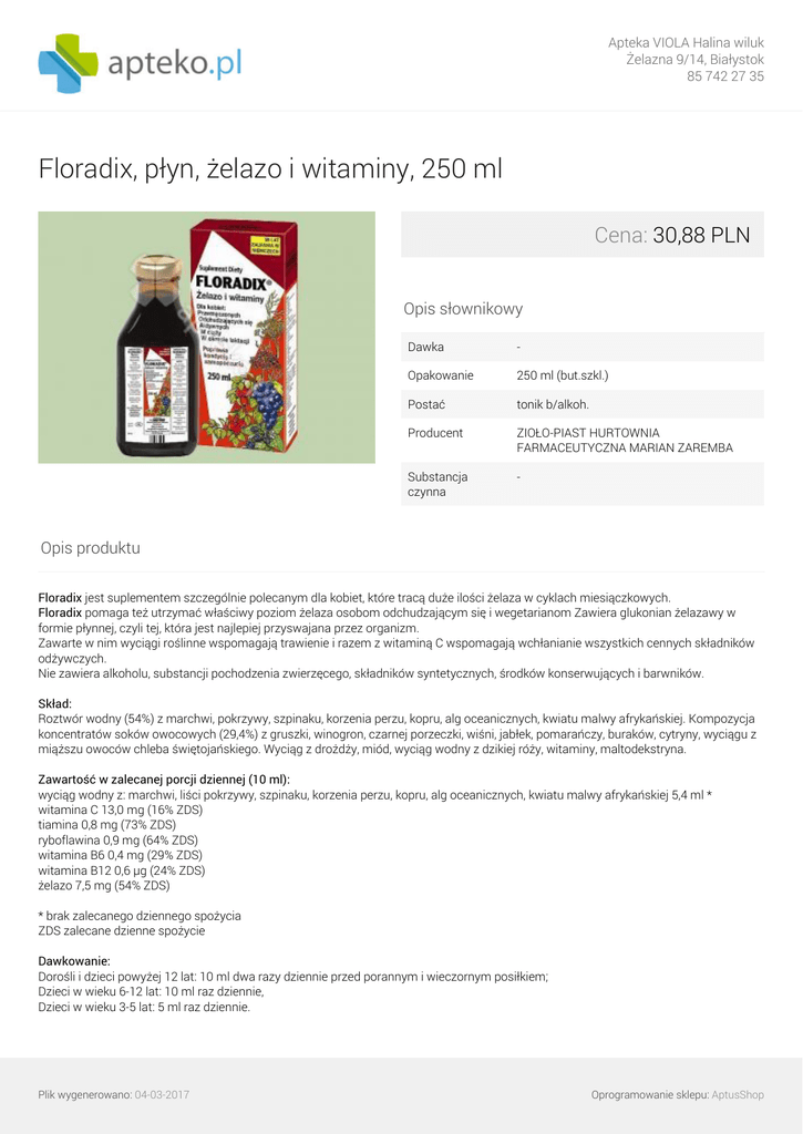 Apteka VIOLA Halina wiluk Żelazna 9/14, Białystok 85 742 27 35 Floradix, płyn, żelazo i witaminy, 250 ml Cena: 30,88 PLN Opis słownikowy Dawka - Opakowanie 250 ml (but.szkl.) Postać tonik b/alkoh. Producent ZIOŁO-PIAST HURTOWNIA FARMACEUTYCZNA MARIAN ZAREMBA Substancja czynna - Opis produktu Floradix jest suplementem szczególnie polecanym dla kobiet, które tracą duże ilości żelaza w cyklach miesiączkowych. Floradix pomaga też utrzymać właściwy poziom żelaza osobom odchudzającym się i wegetarianom Zawiera glukonian żelazawy w formie płynnej, czyli tej, która jest najlepiej przyswajana przez organizm. Zawarte w nim wyciągi roślinne wspomagają trawienie i razem z witaminą C wspomagają wchłanianie wszystkich cennych składników odżywczych. Nie zawiera alkoholu, substancji pochodzenia zwierzęcego, składników syntetycznych, środków konserwujących i barwników. Skład: Roztwór wodny (54%) z marchwi, pokrzywy, szpinaku, korzenia perzu, kopru, alg oceanicznych, kwiatu malwy afrykańskiej. Kompozycja koncentratów soków owocowych (29,4%) z gruszki, winogron, czarnej porzeczki, wiśni, jabłek, pomarańczy, buraków, cytryny, wyciągu z miąższu owoców chleba świętojańskiego. Wyciąg z drożdży, miód, wyciąg wodny z dzikiej róży, witaminy, maltodekstryna. Zawartość w zalecanej porcji dziennej (10 ml): wyciąg wodny z: marchwi, liści pokrzywy, szpinaku, korzenia perzu, kopru, alg oceanicznych, kwiatu malwy afrykańskiej 5,4 ml * witamina C 13,0 mg (16% ZDS) tiamina 0,8 mg (73% ZDS) ryboflawina 0,9 mg (64% ZDS) witamina B6 0,4 mg (29% ZDS) witamina B12 0,6 µg (24% ZDS) żelazo 7,5 mg (54% ZDS) * brak zalecanego dziennego spożycia ZDS zalecane dzienne spożycie Dawkowanie: Dorośli i dzieci powyżej 12 lat: 10 ml dwa razy dziennie przed porannym i wieczornym posiłkiem; Dzieci w wieku 6-12 lat: 10 ml raz dziennie, Dzieci w wieku 3-5 lat: 5 ml raz dziennie. Plik wygenerowano: 04-03-2017 Oprogramowanie sklepu: AptusShop Apteka VIOLA Halina wiluk Żelazna 9/14, Białystok 85 742 27 35 Nie należy przekraczać zalecanej porcji do spożycia w ciągu dnia. Przeciwwskazania: Nadwrażliwość na składniki preparatu. Przed zastosowaniem produktu zapoznaj się z informacjami zamieszczonymi na opakowaniu lub ulotce. Plik wygenerowano: 04-03-2017 Powered by TCPDF (www.tcpdf.org) Oprogramowanie sklepu: AptusShop
