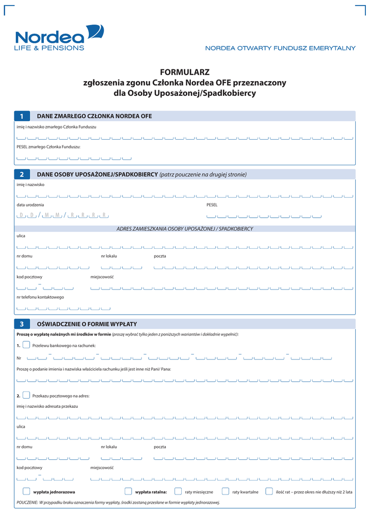 FORMULARZ zgłoszenia zgonu Członka Nordea OFE przeznaczony dla Osoby Uposażonej/Spadkobiercy 1 DANE ZMARŁEGO CZŁONKA NORDEA OFE imię i nazwisko zmarłego Członka Funduszu PESEL zmarłego Członka Funduszu: 2 DANE OSOBY UPOSAŻONEJ/SPADKOBIERCY (patrz pouczenie na drugiej stronie) imię i nazwisko PESEL data urodzenia D D M M R R R R ADRES ZAMIESZKANIA OSOBY UPOSAŻONEJ / SPADKOBIERCY ulica nr domu nr lokalu kod pocztowy poczta miejscowość nr telefonu kontaktowego 3 OŚWIADCZENIE O FORMIE WYPŁATY Proszę o wypłatę należnych mi środków w formie (proszę wybrać tylko jeden z poniższych wariantów i dokładnie wypełnić): 1. Przelewu bankowego na rachunek: Nr Proszę o podanie imienia i nazwiska właściciela rachunku jeśli jest inne niż Pani/ Pana: 2. Przekazu pocztowego na adres: imię i nazwisko adresata przekazu ulica nr domu nr lokalu kod pocztowy wypłata jednorazowa poczta miejscowość wypłata ratalna: raty miesięczne POUCZENIE:W przypadku braku oznaczenia formy wypłaty, środki zostaną przesłane w formie wypłaty jednorazowej. raty kwartalne ilość rat – przez okres nie dłuższy niż 2 lata 3 OŚWIADCZENIE O FORMIE WYPŁATY c.d. UWAGA:W przypadku wskazania współmałżonka jako Osoby Uposażonej, wypłata pieniężna środków może być przekazana na jego żądanie na rachunek w otwartym funduszu. W przypadku wyboru tego wariantu, prosimy o zaznaczenie poniższej opcji. 3. Transferem na rachunek w otwartym funduszu emerytalnym. Miejscowość, data Podpis Uposażonego/Spadkobiercy Proszę załączyć odpis aktu zgonu + kopię Pani/Pana dokumentu tożsamości (w przypadku kopii dokumenty należy potwierdzić za zgodność z oryginałem notarialnie bądź w Urzędzie Miasta/Gminy). POUCZENIE:W przypadku, gdy zmarły Członek Funduszu nie wskazał Osób Uposażonych, Spadkobiercy zmarłego ubiegający się o środki pieniężne zgromadzone na rachunku zmarłego, zobowiązani są dodatkowo do przedłożenia Funduszowi prawomocnego stwierdzenia nabycia spadku (dokument wydawany jest przez Sąd Rejonowy) lub aktu poświadczenia dziedziczenia (dokument sporządzany jest przez notariusza). Wypłata środków realizowana jest zgodnie z przedłożonym dokumentem. Nordea Powszechne Towarzystwo Emerytalne S.A., 00-867 Warszawa, Al Jana Pawła II 27, Atrium Centrum. tel. +48 (22) 541 00 00, fax: +48 (22) 541 00 01, www.nordeapolska.pl, e-mail: [email protected], Rejestr Przedsiębiorców nr KRS 0000010345 w Sądzie Rejonowym dla m. st. Warszawy w Warszawie, XII Wydział Gospodarczy Krajowego Rejestru Sądowego, NIP: 521-29-76-286, REGON: 014860559, Kapitał Zakładowy 72 209 370,00 złotych w całości wpłacony.